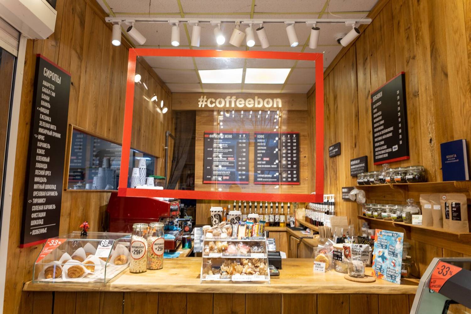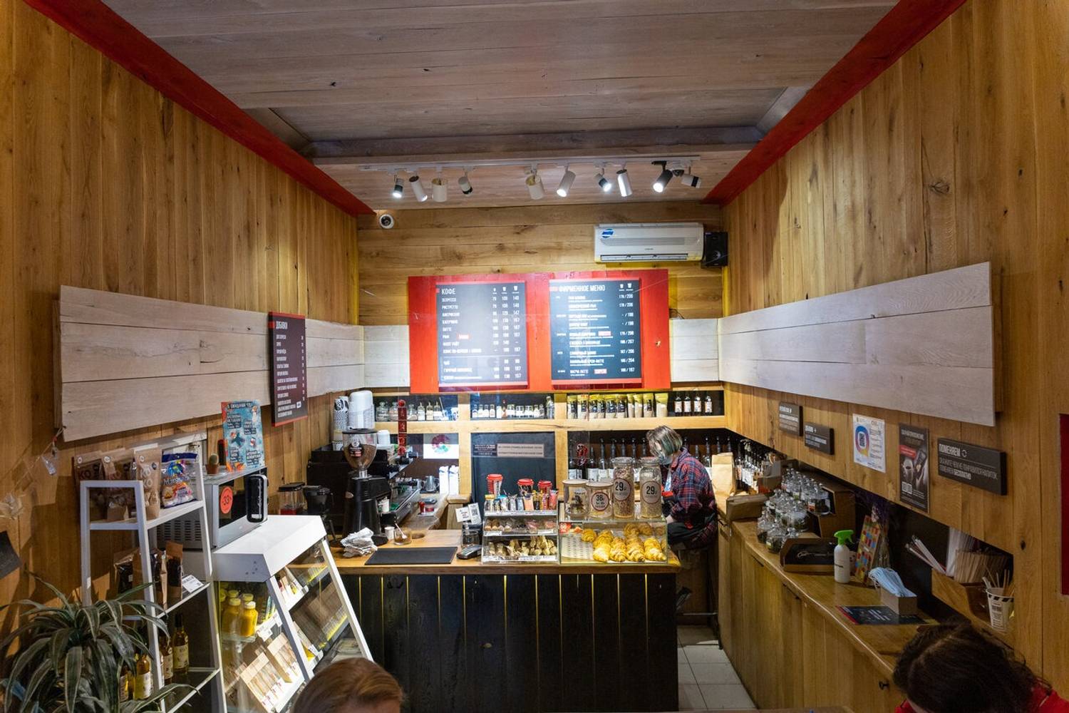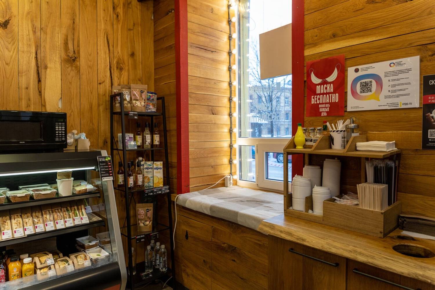 Атмосфера. Интерьер выдержан в фирменном стиле: деревянные панели создают теплое фоновое звучание, а черно‑красные вывески добавляют графической выразительности. Для гостей, желающих присесть, оборудована зона у подоконника — там лежит плед и есть розетка для подзарядки устройств. Пространство компактное, функциональное, без лишних деталей: все продумано для быстрого и комфортного визита.