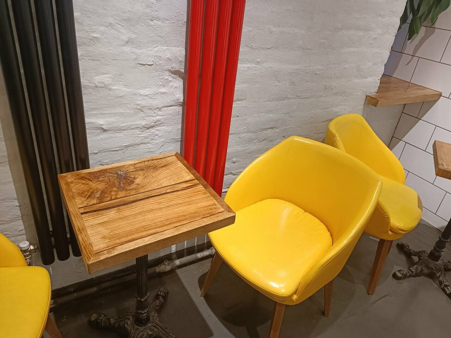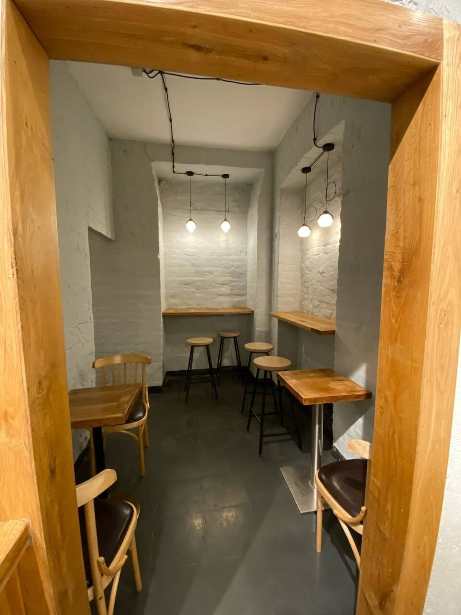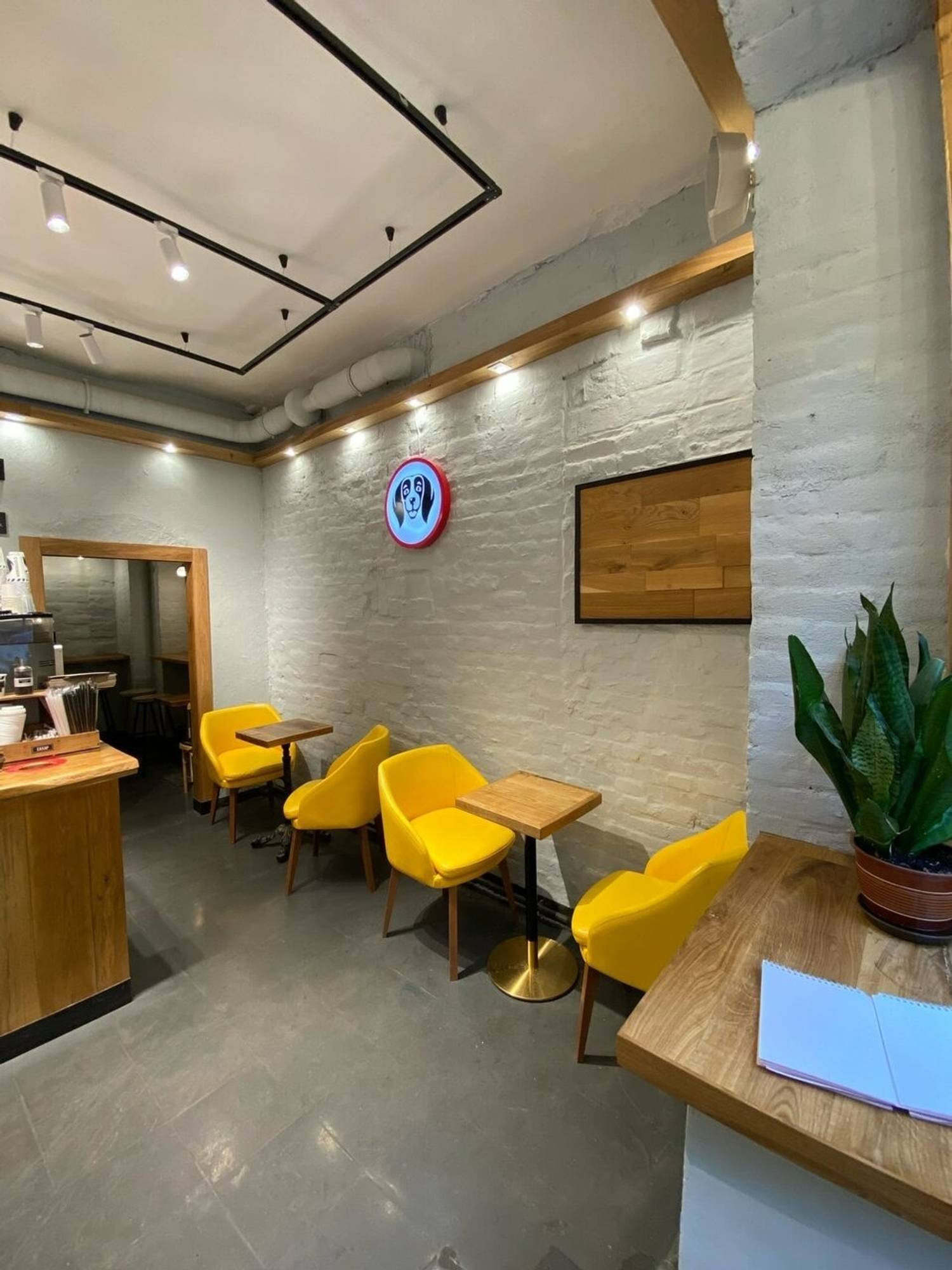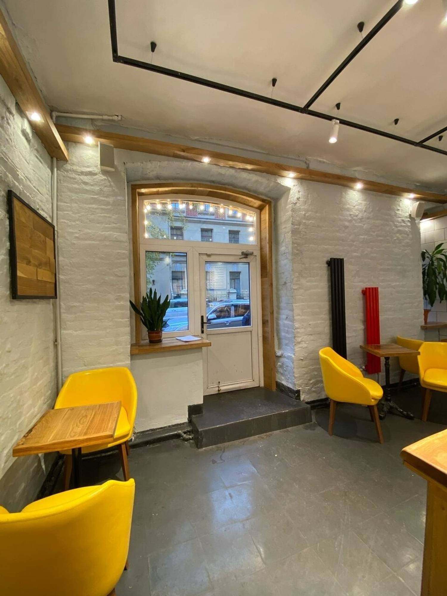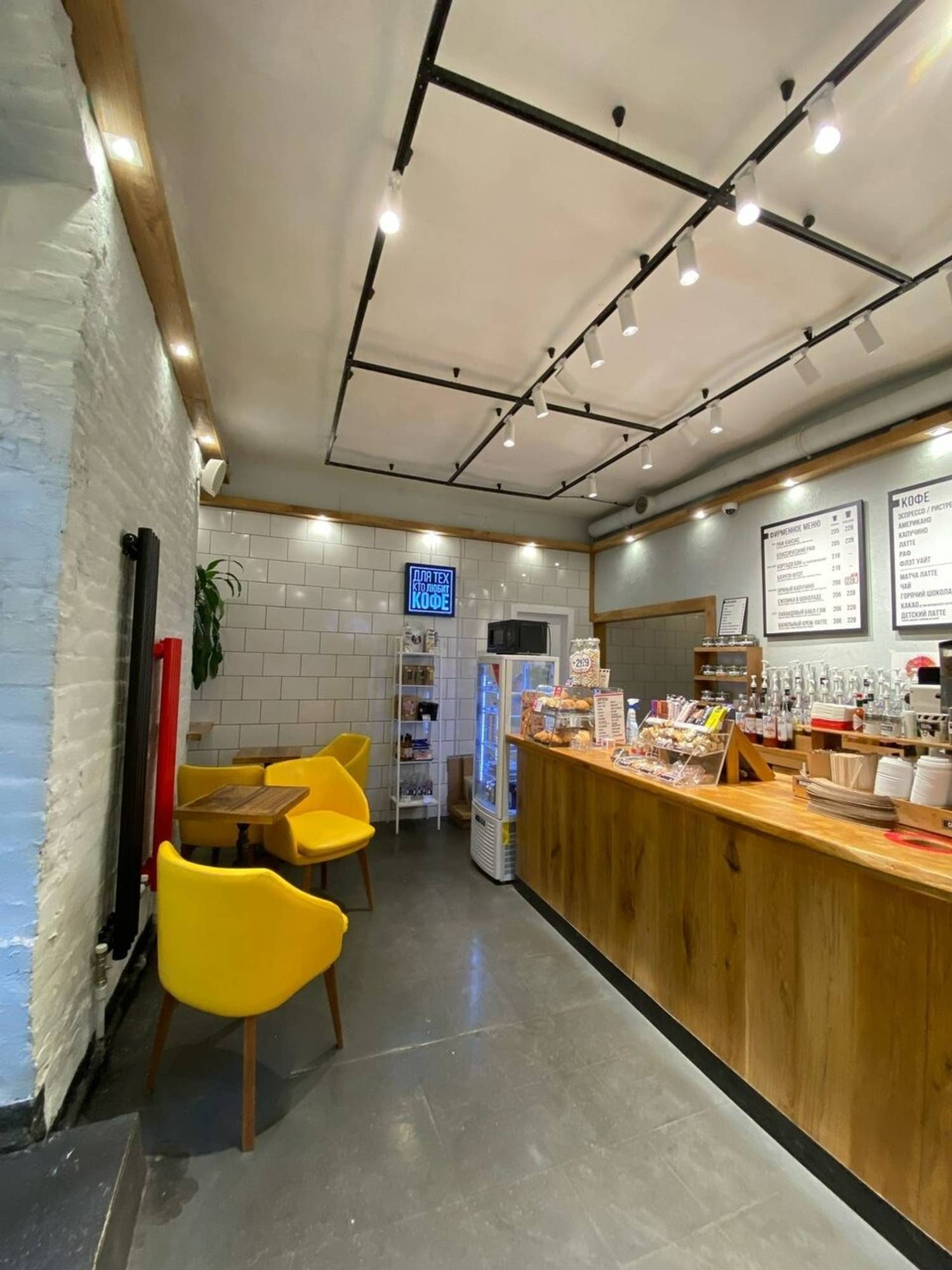 Атмосфера. Интерьер выдержан в фирменном стиле: деревянные панели создают теплое фоновое звучание, а черно‑красные вывески добавляют графической выразительности. Для гостей, желающих присесть, оборудована зона у подоконника — там лежит плед и есть розетка для подзарядки устройств. Пространство компактное, функциональное, без лишних деталей: все продумано для быстрого и комфортного визита.