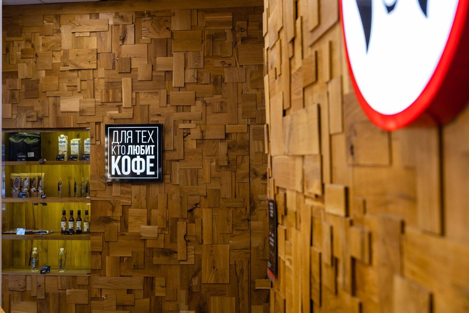 Атмосфера. Интерьер выстроен на необычной деревянной отделке: стены собраны из маленьких деревянных плит, наложенных друг на друга, что создает эффект объемной текстуры. На одной из стен размещен фирменный логотип с собачкой, а на застекленной полке выставлены сиропы и пачки кофе — чтобы гость мог увидеть ассортимент. Окна украшены огоньками, добавляющими уют и праздничное настроение. Пространство лаконично, но выразительно: ничего лишнего, только то, что нужно для качественного кофе на ходу.