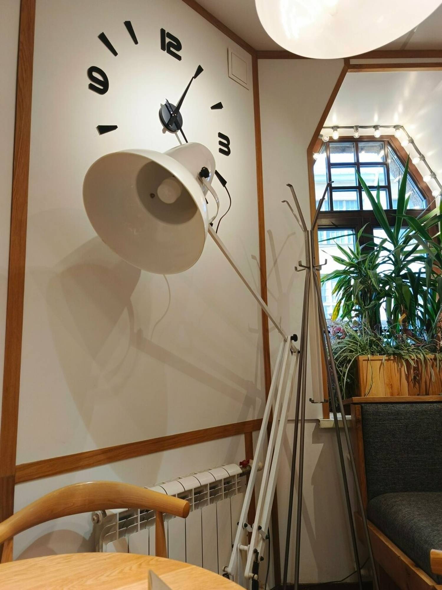 Атмосфера. Общее впечатление — чистота, простор и визуальный покой. Помещение решено в светлой палитре: белые и деревянные стены, светлая мебель, живые растения добавляют ощущение свежести. Наличие высокого стола дает возможность для динамичного короткого визита. Интерьер, лишенный визуального шума, позволяет сосредоточиться на общении, еде или работе, не отвлекаясь на излишнюю декоративность.