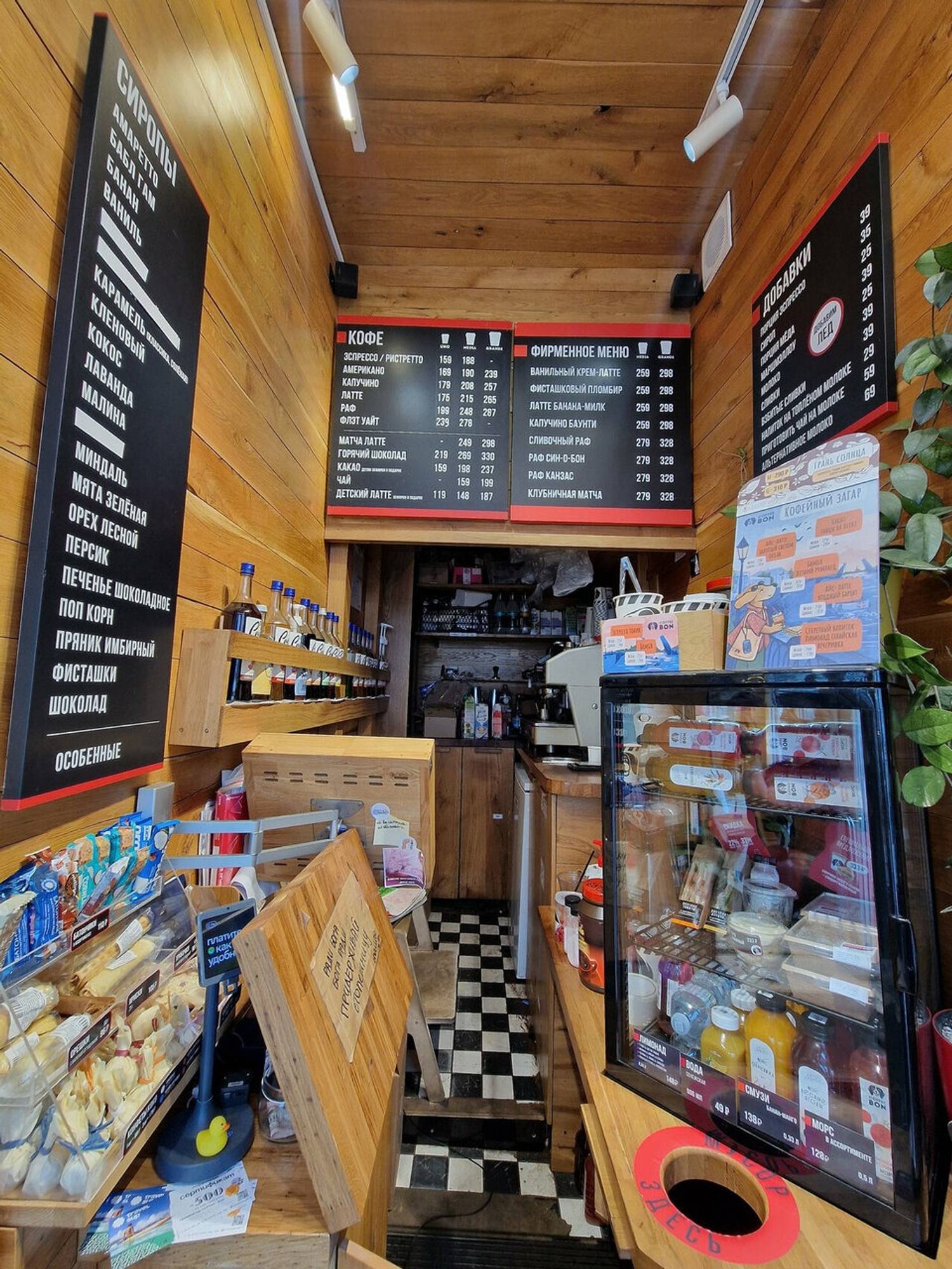 Еда и напитки. В меню представлены напитки и блюда. Гости могут заказать классический кофе, авторские напитки вроде фисташкового пломбира или ванильного крем-латте, а также сэндвичи. Из горячих блюда есть паста болоньезе и рис с курицей карри. На сладкое можно взять десерты: сырники, чизкейк карамельный, конфеты.