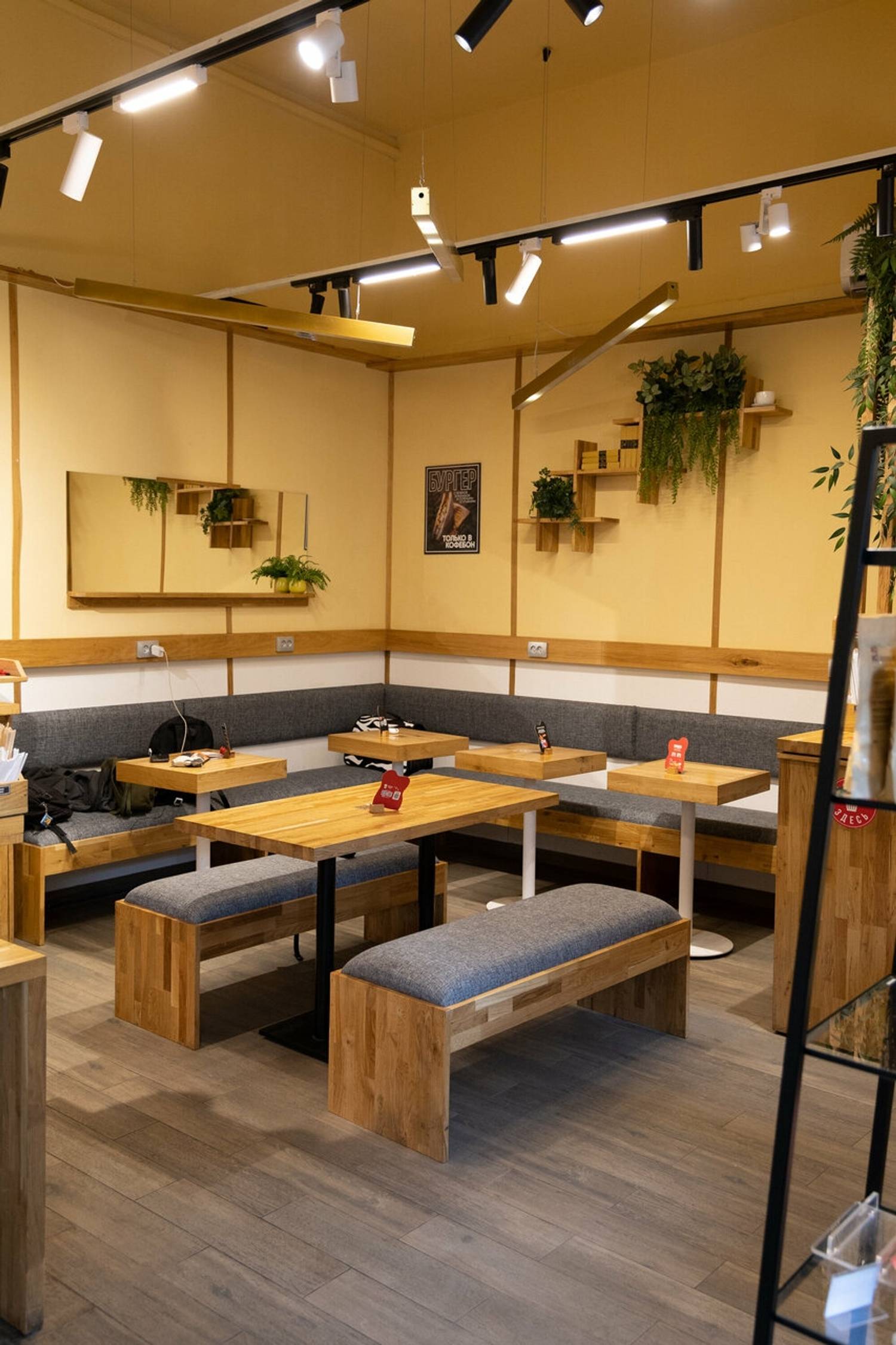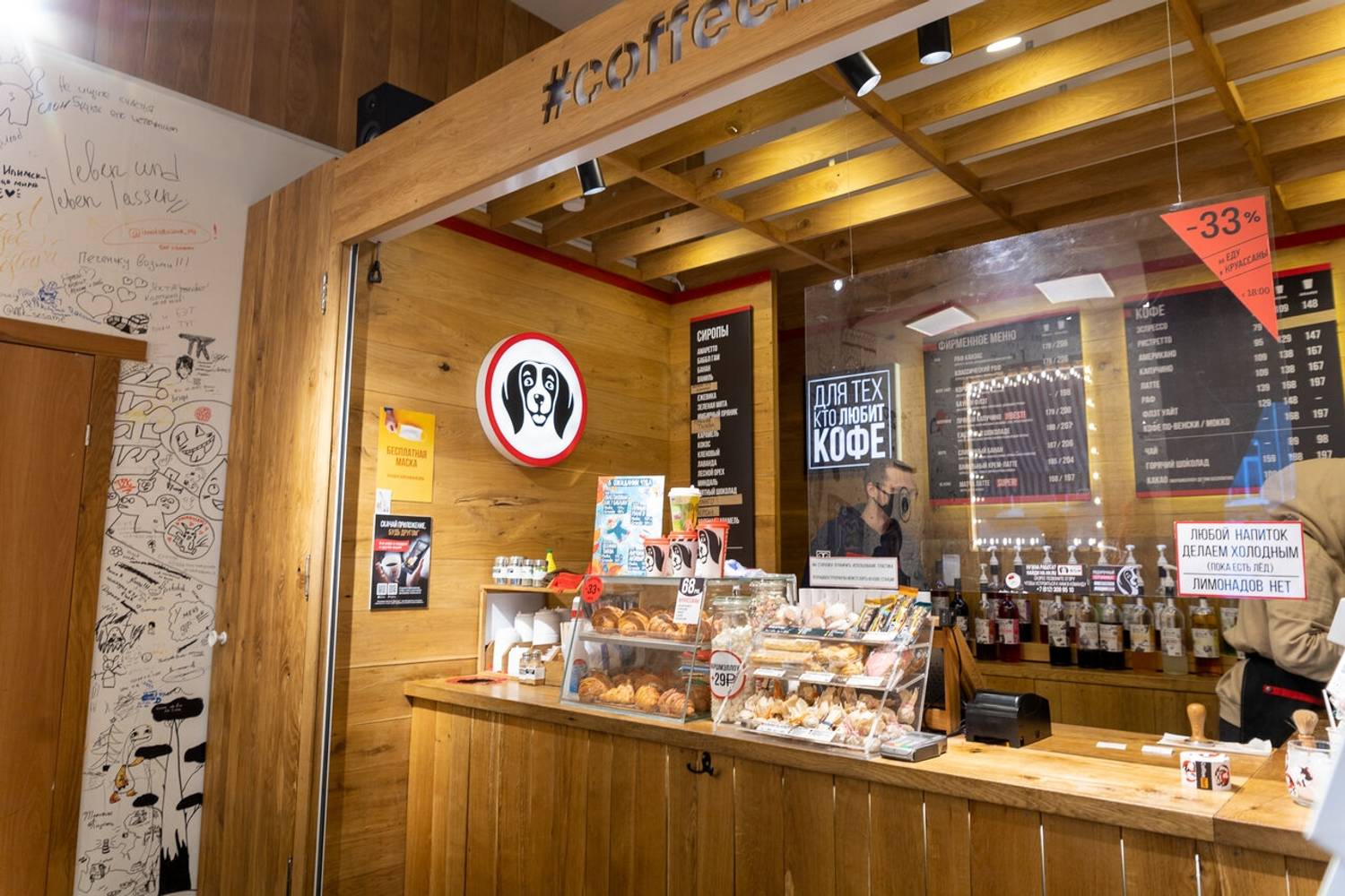 Еда и напитки. Гости могут рассчитывать на фирменное качество кофе «КофеБон»: от правильно приготовленного фильтра до насыщенного рафа «Канзас». Для перекуса предлагаются компактные и вкусные варианты: лайт-сэндвичи, пирожки, сырники, а также более сытные позиции вроде салата цезарь или пасты. Особый шарм добавляет возможность приобрести зерно или дрип-пакеты для домашнего приготовления, а также авторские чайные смеси в красивой упаковке.