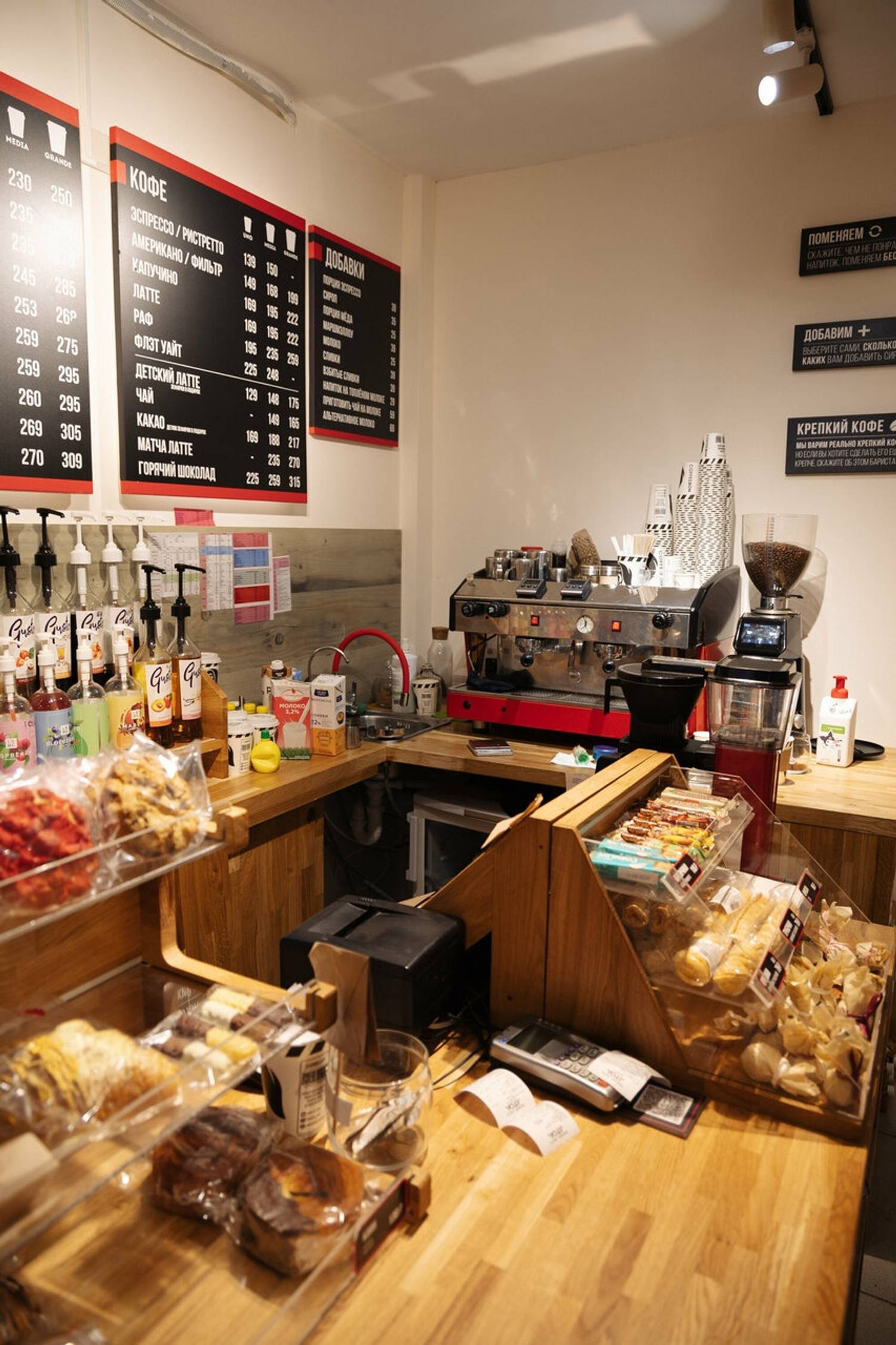 Еда и напитки. Помимо всего кофейного меню сети, здесь можно попробовать авторские напитки, например, «Сливочный раф» или «Матчу на фреше». Кухня предлагает широкий выбор для любого времени дня: сытные завтраки, разнообразные сэндвичи и роллы, салаты, горячие блюда и сладкую выпечку. Отдельного внимания заслуживают домашние десерты: трубочки, кукисы и конфеты ручной работы.