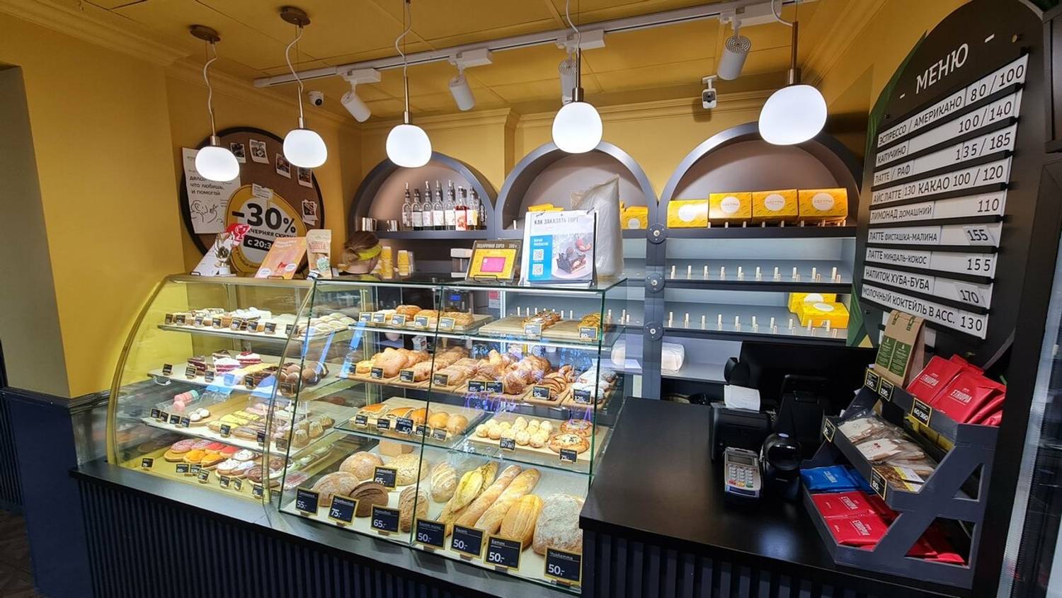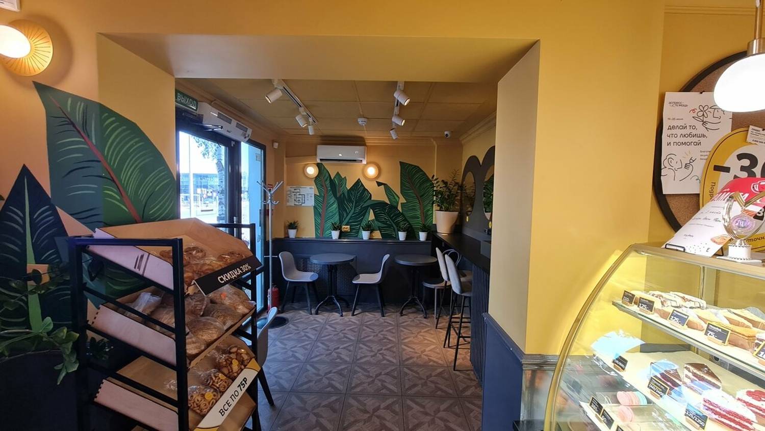 Еда и напитки. Здесь вы всегда найдете что-то из только что приготовленного: рулет с корицей, булочки с творогом и кокосом или пиццу с ветчиной. Среди десертов выделяются мини-торты, например «Лаванда-Голубика», и воздушные эклеры с разными начинками. К выпечке отлично подойдет какао на натуральном молоке или фильтр-кофе. Для сытного перекуса есть киш с курицей и грибами или горячие пирожки.