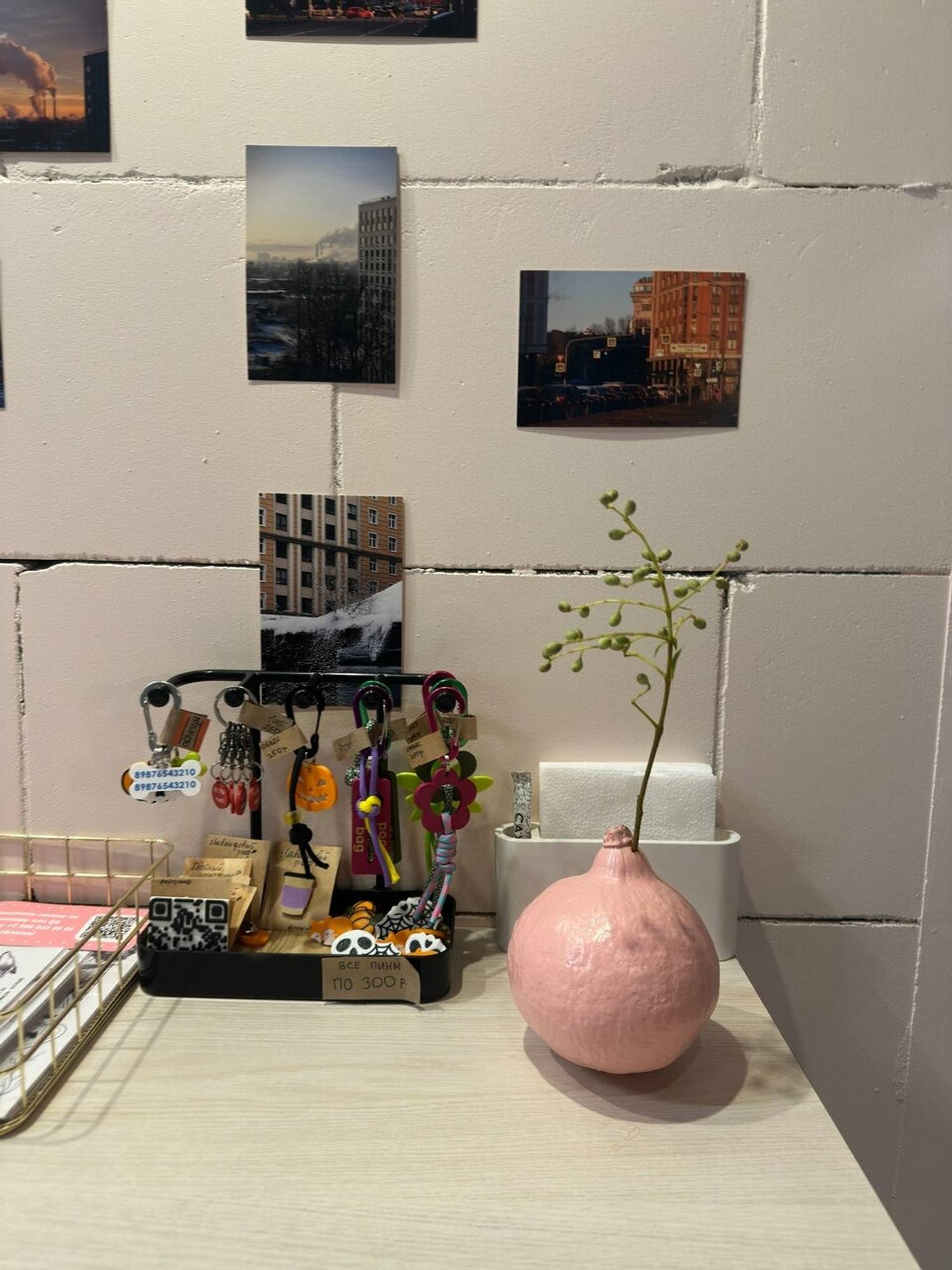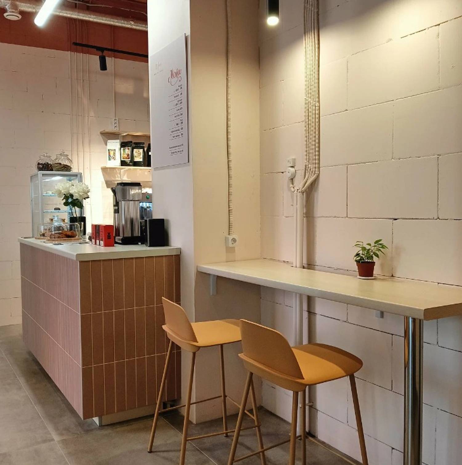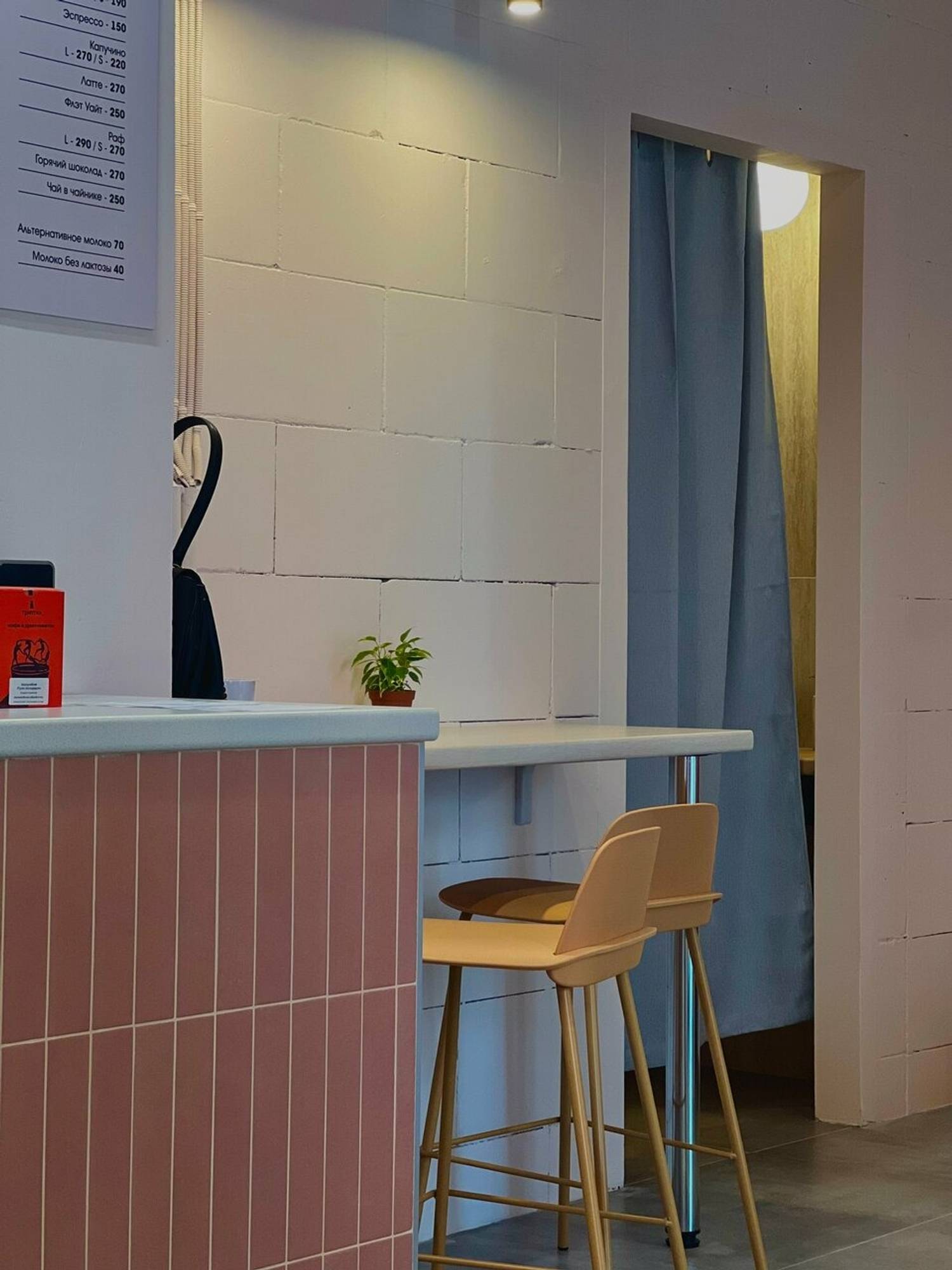 Атмосфера. Светлое пространство с белыми стенами, пыльно-розовой плиточной стойкой. Внутри разноуровневая посадка: высокие столы, классические столики и уютное место у окна.