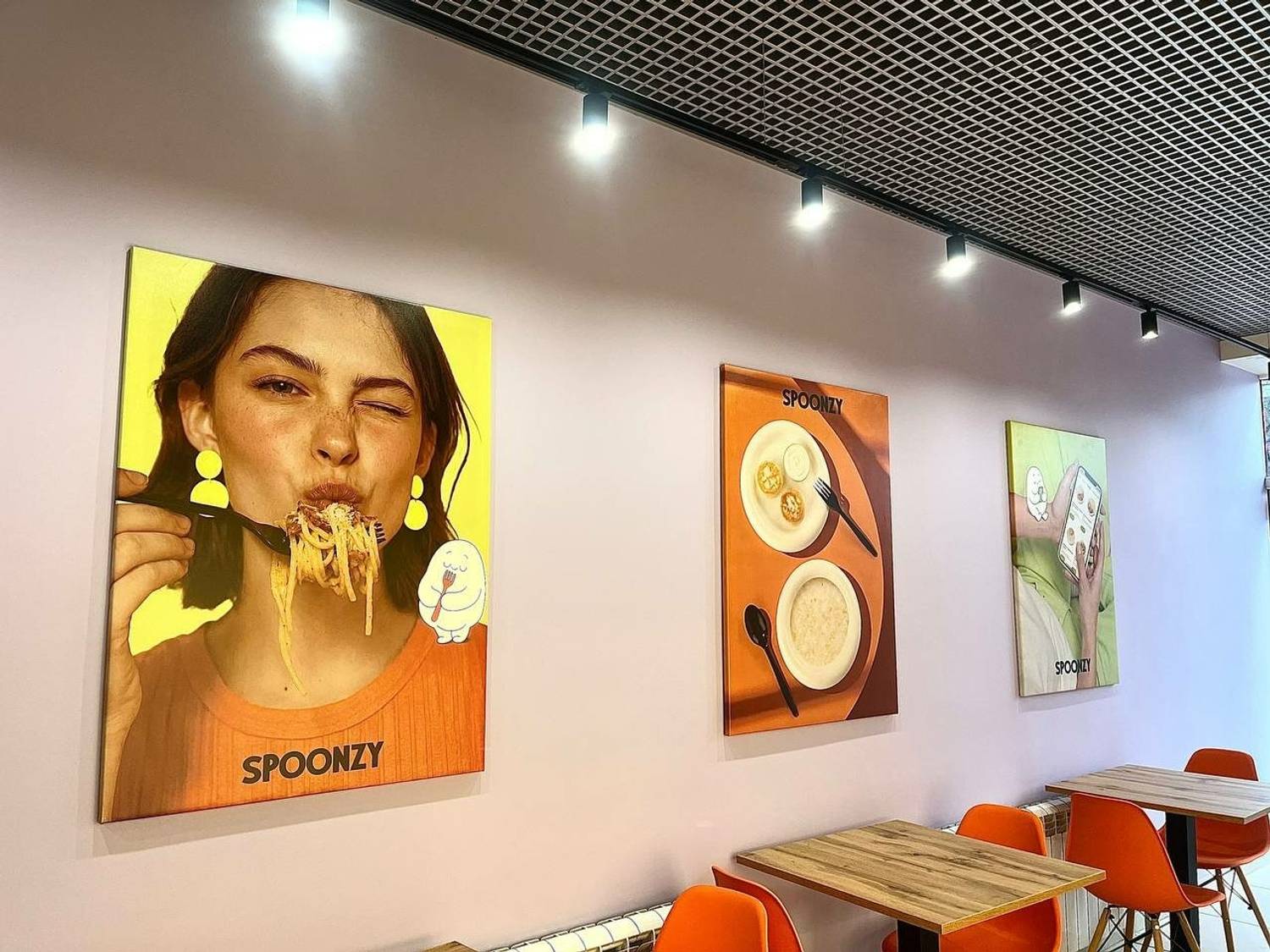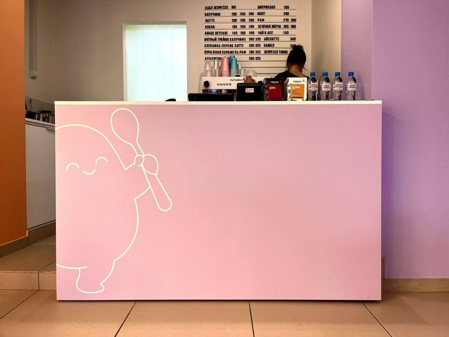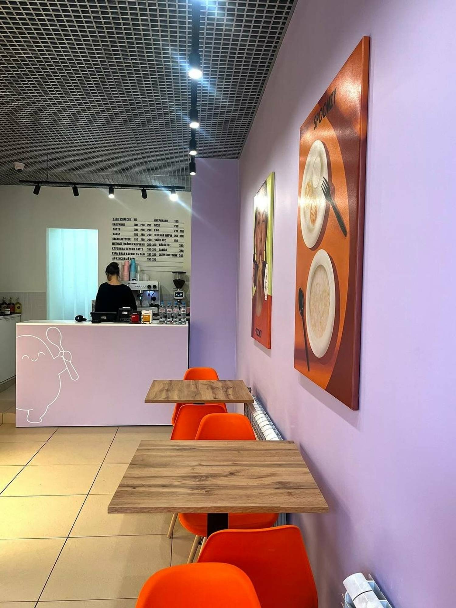 Атмосфера. Внутри светло и стильно. Сиреневые стены, стойка заказов в том же оттенке с милым персонажем, нарисованным белой обводкой, — дизайн в современном стиле с характерными деталями. Яркие красные стулья добавляют энергии, а картины с завтраками и девушками создают уют. Есть и большой холодильник с готовой едой, откуда можно выбрать себе блюда по вкусу.