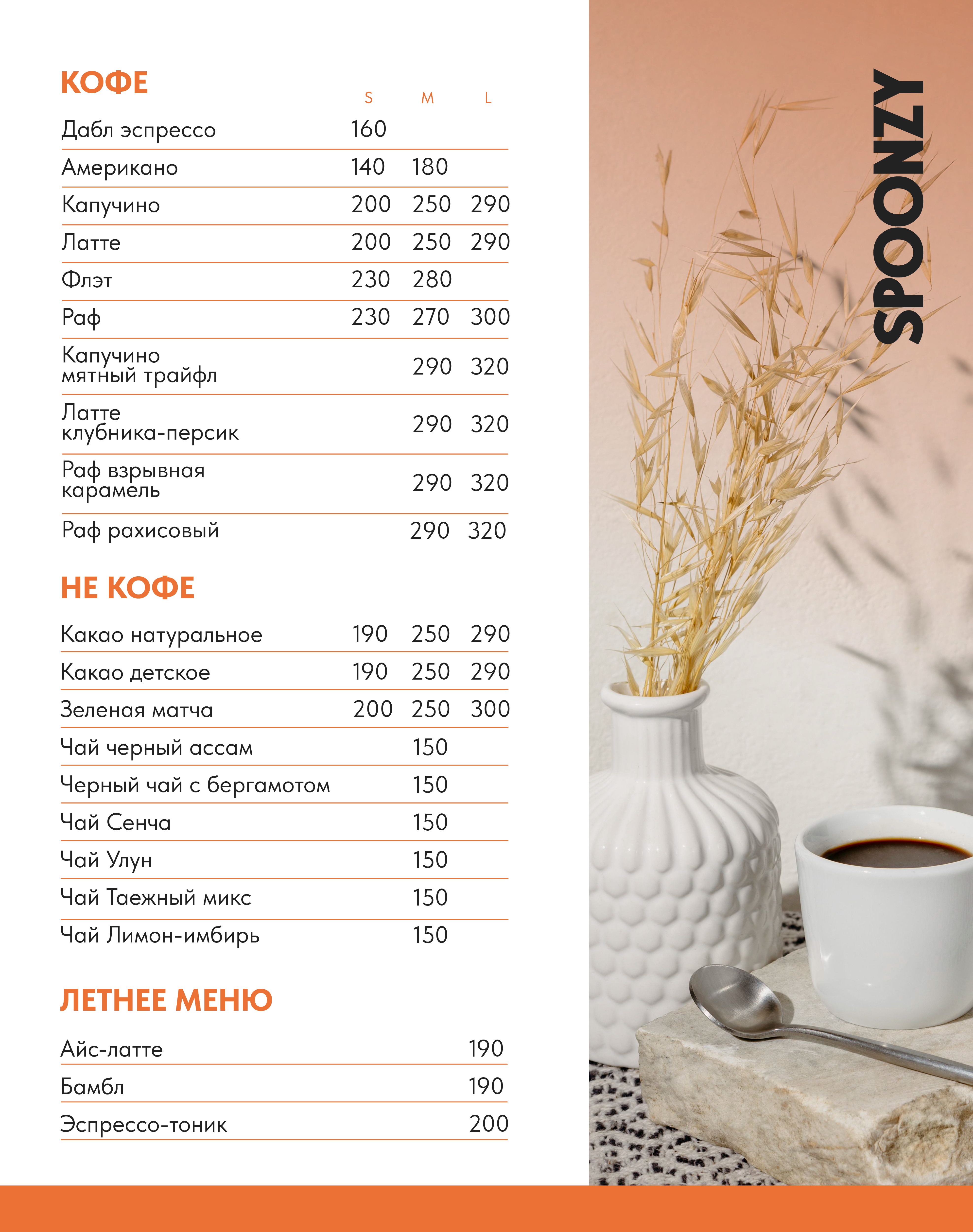 Еда и напитки. В меню есть два раздела: «кофе» и «не кофе». Среди кофейных позиций двойной эспрессо, американо, капучино, флэт, раф. Также готовят капучино мятный, латте клубника-персик, раф взрывная карамель и арахисовый. Из не кофейных позиций стоит попробовать натуральное какао, зеленую матчу, чай лимон-имбирь. Есть даже детский какао для маленьких посетителей. В летнем меню собрали айс латте, бамбл и эспрессо тоник. Готовая еда — спасение для занятых. Удобно взять с собой, разогреть и съесть тогда, когда нужно.