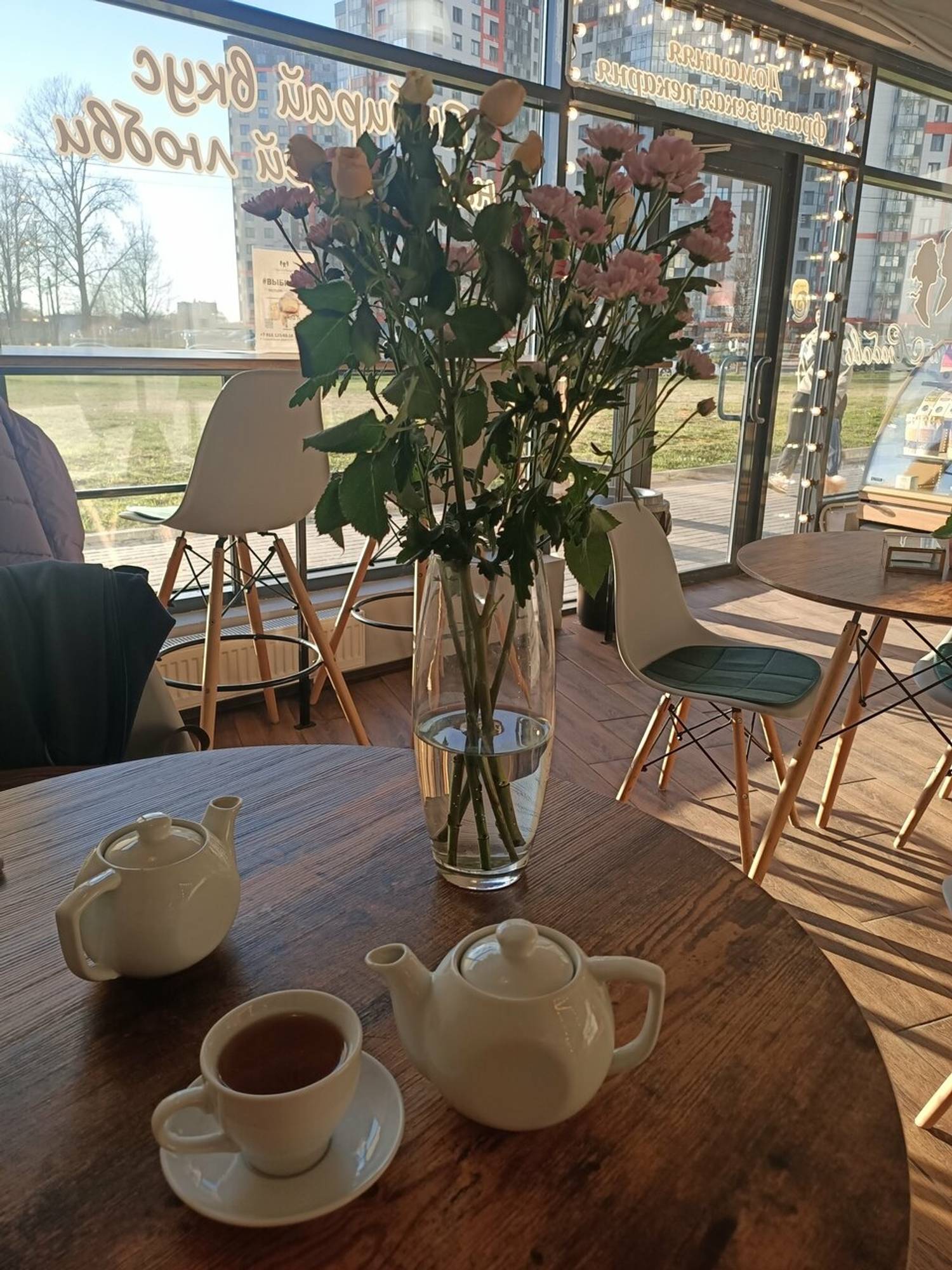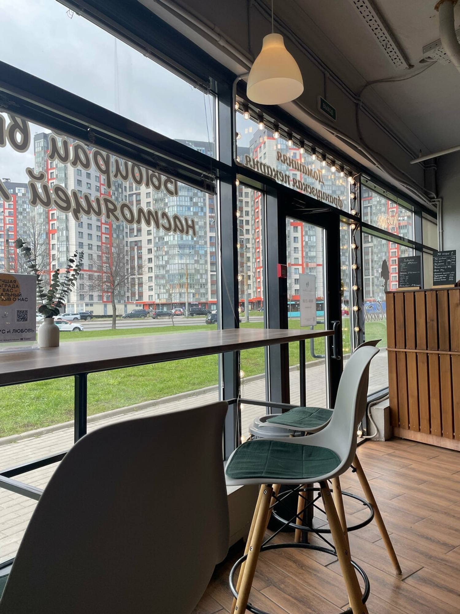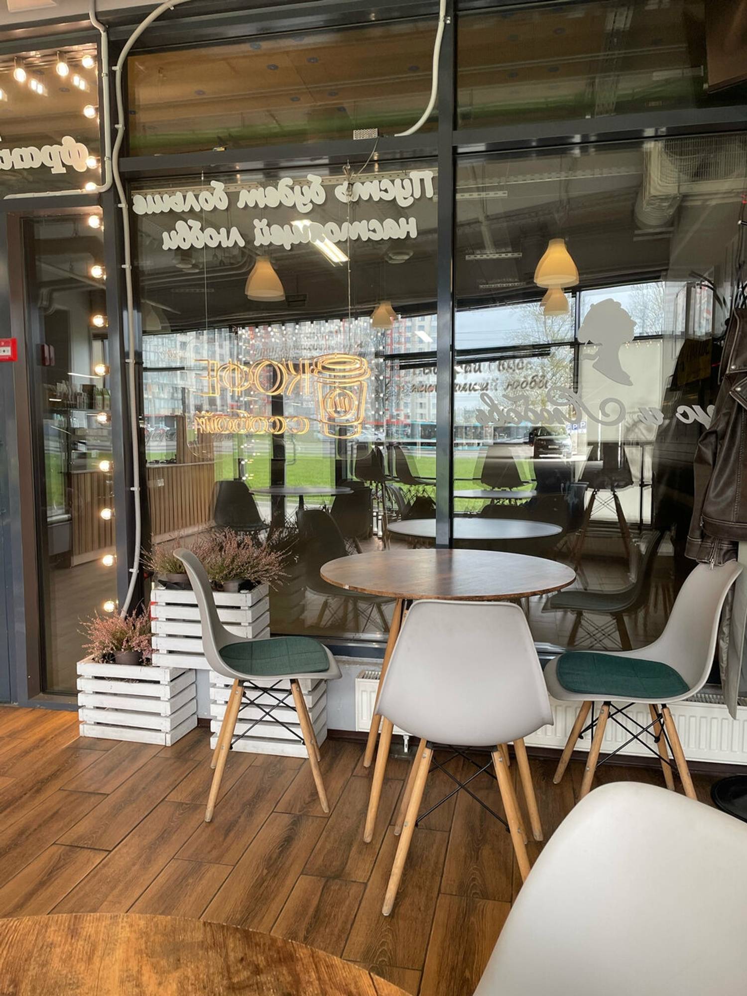 Атмосфера. Пространство с панорамными окнами во всю стену залито светом. Белые стены, деревянные акценты и мягкие стулья создают ощущение домашнего тепла. Здесь пахнет ванилью и свежей выпечкой — место, где хочется остаться с чашкой капучино и эклером, глядя на улицу через огромное стекло. А красивые десерты, разложенные в витрине, так и просятся в объектив.