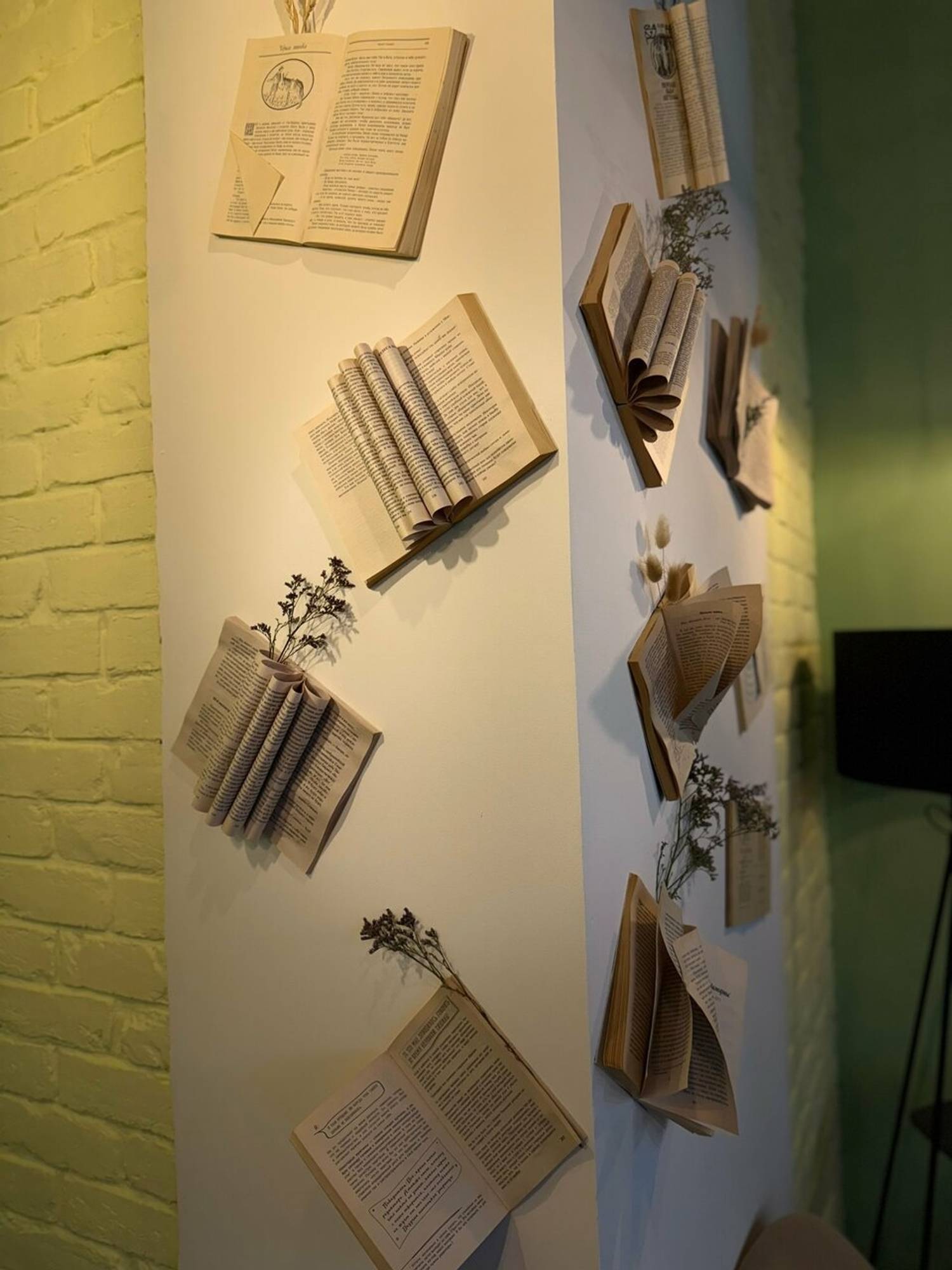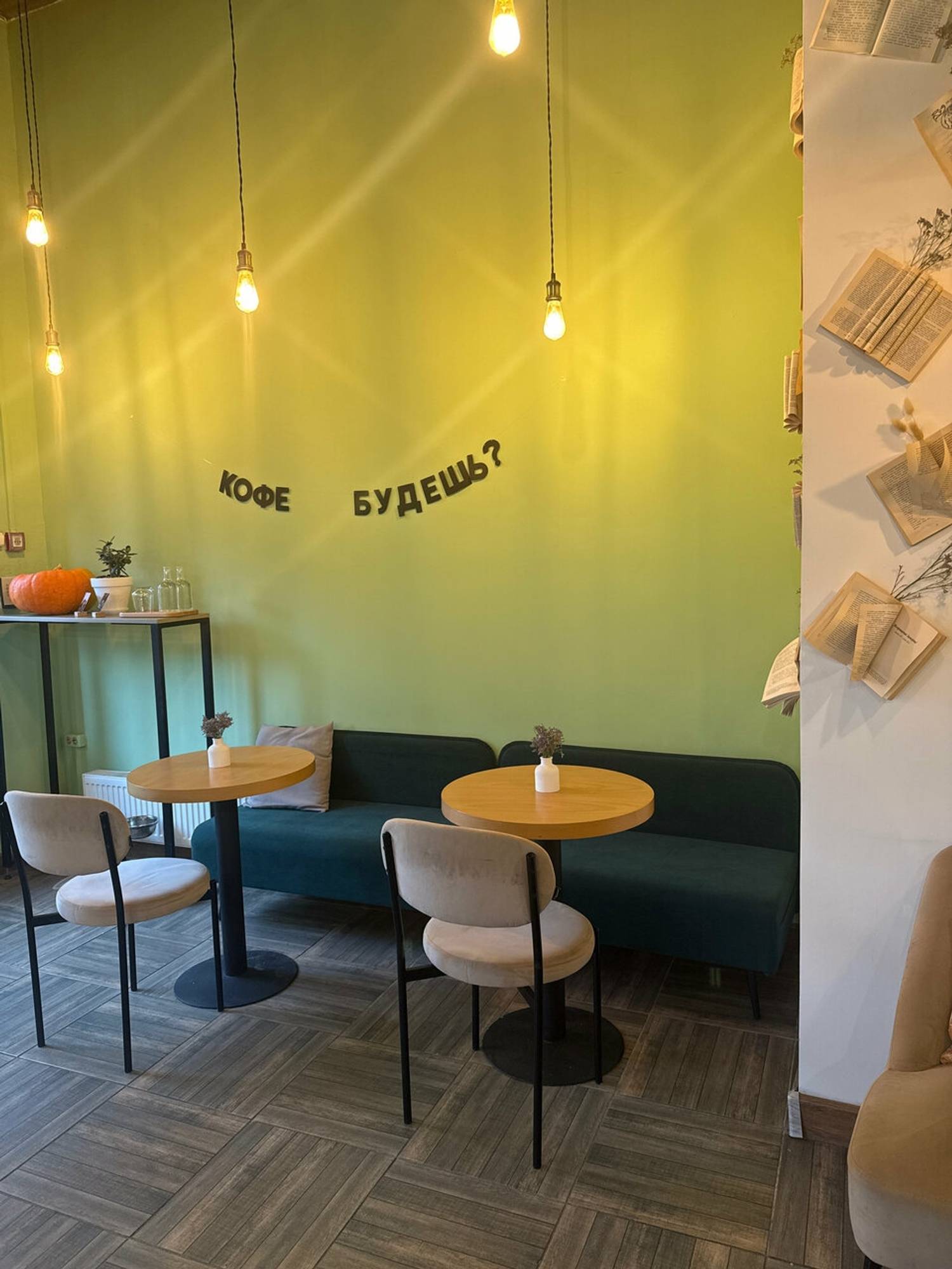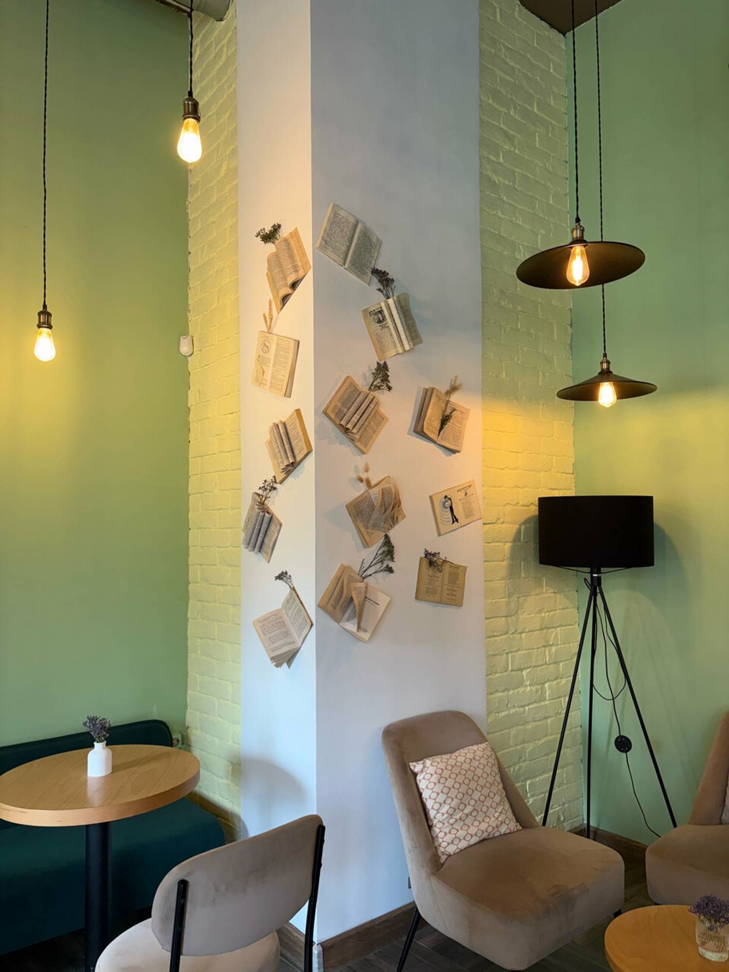 Атмосфера. Внутри светло и по-домашнему тепло: светло-зеленые стены, круглые столы, диваны, книжные страницы на стене, полки с книгами, деревянные подоконники. Кстати, на подоконниках растения в кадках, которые в цвет стенам — продуманная концепция в зеленых оттенках. Надпись на стене «кофе будешь?» добавляет уюта и камерности. А на окне можно увидеть неоновые символы в виде стаканов кофе. Здесь каждый гость находит уют и вдохновение для хорошего настроения.