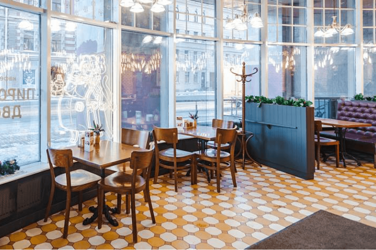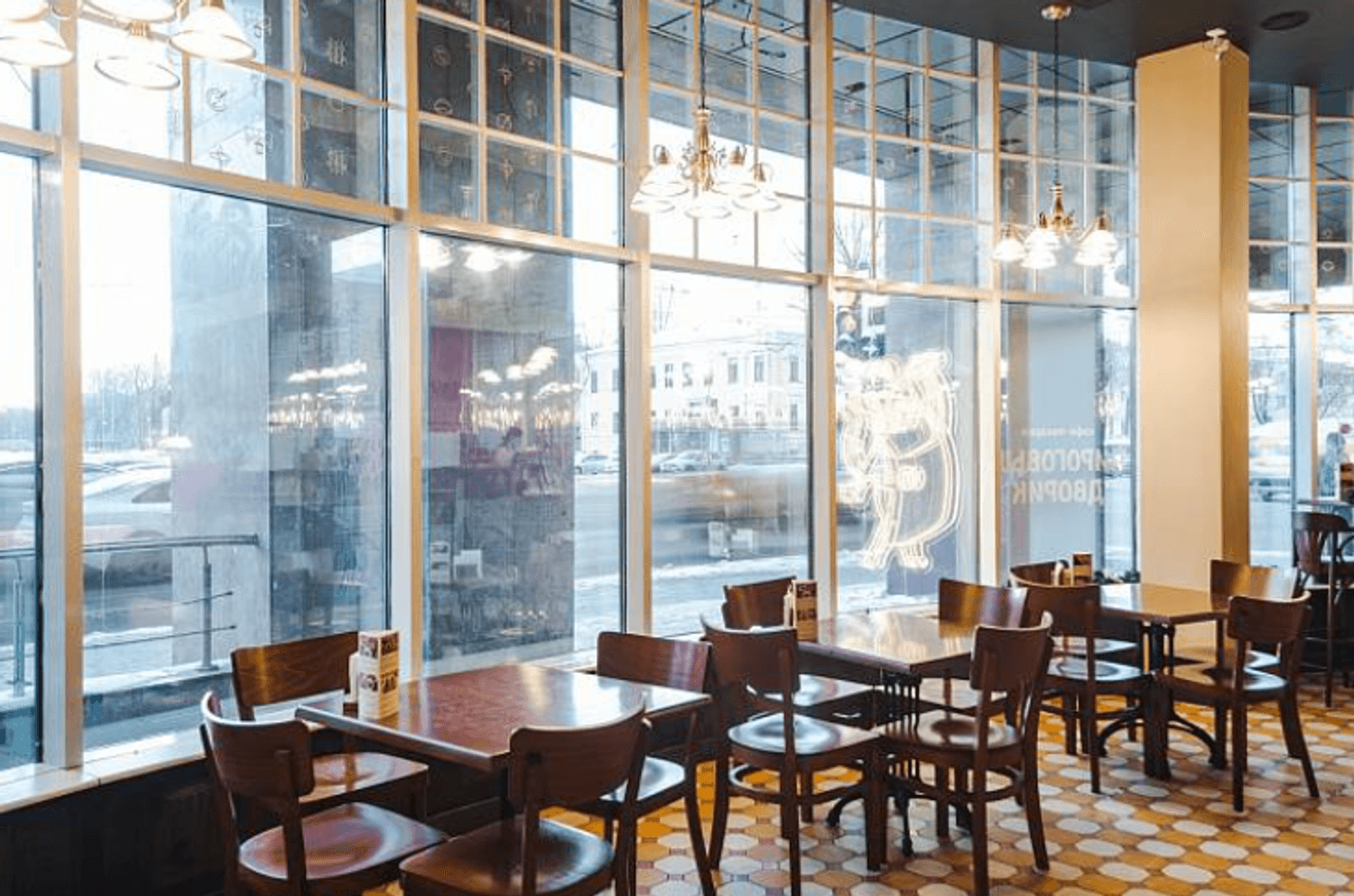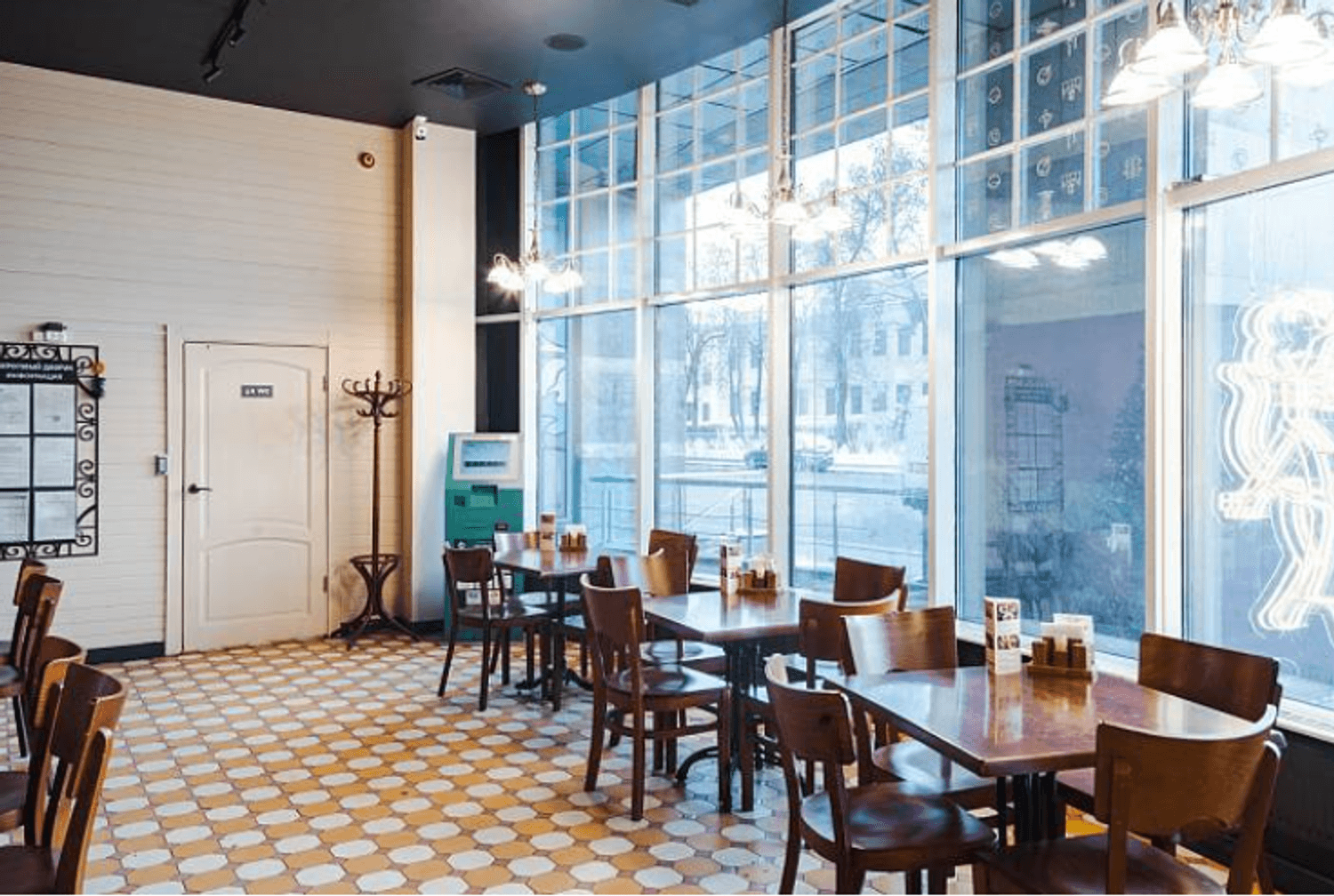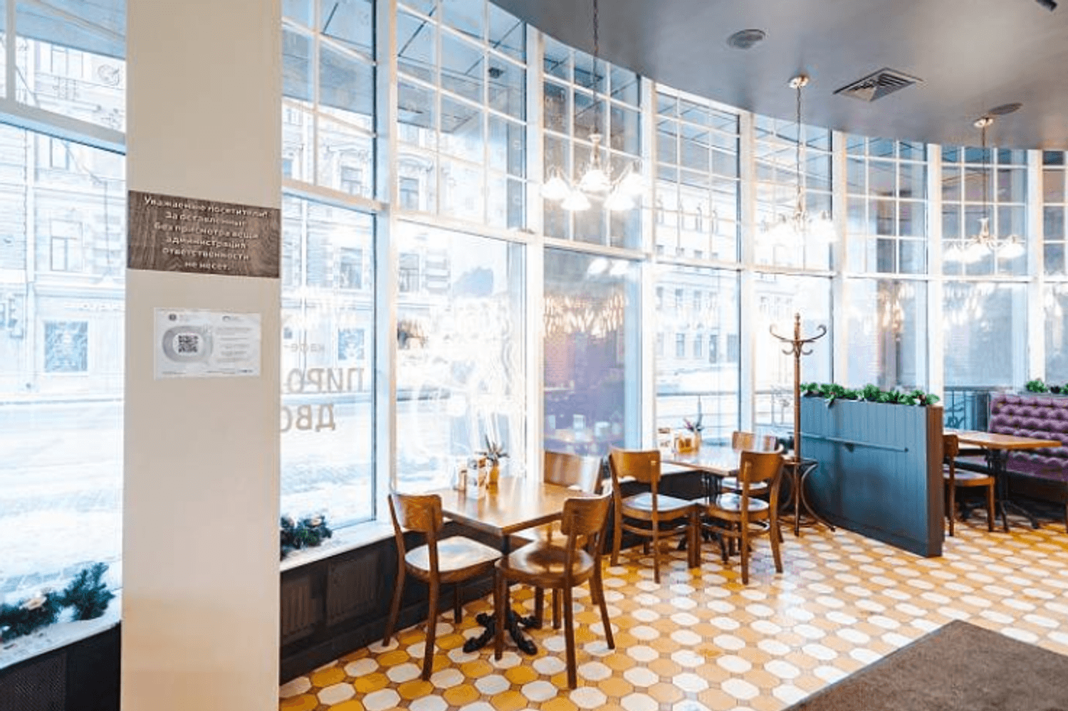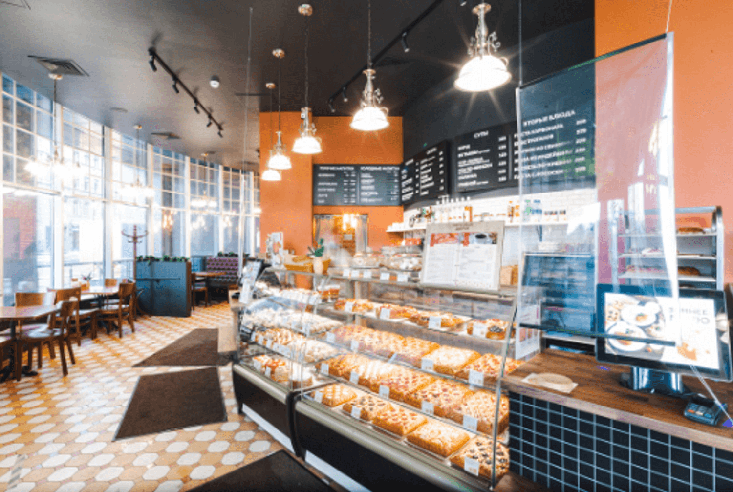 «Пироговый дворик» по адресу Загородный пр., 39 — пекарня с дизайном в европейском стиле и панорамным остеклением.