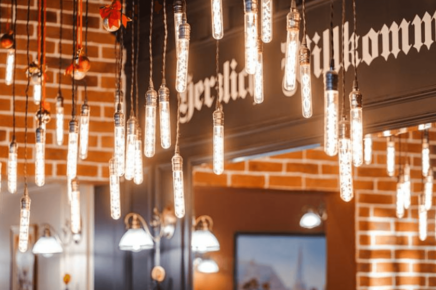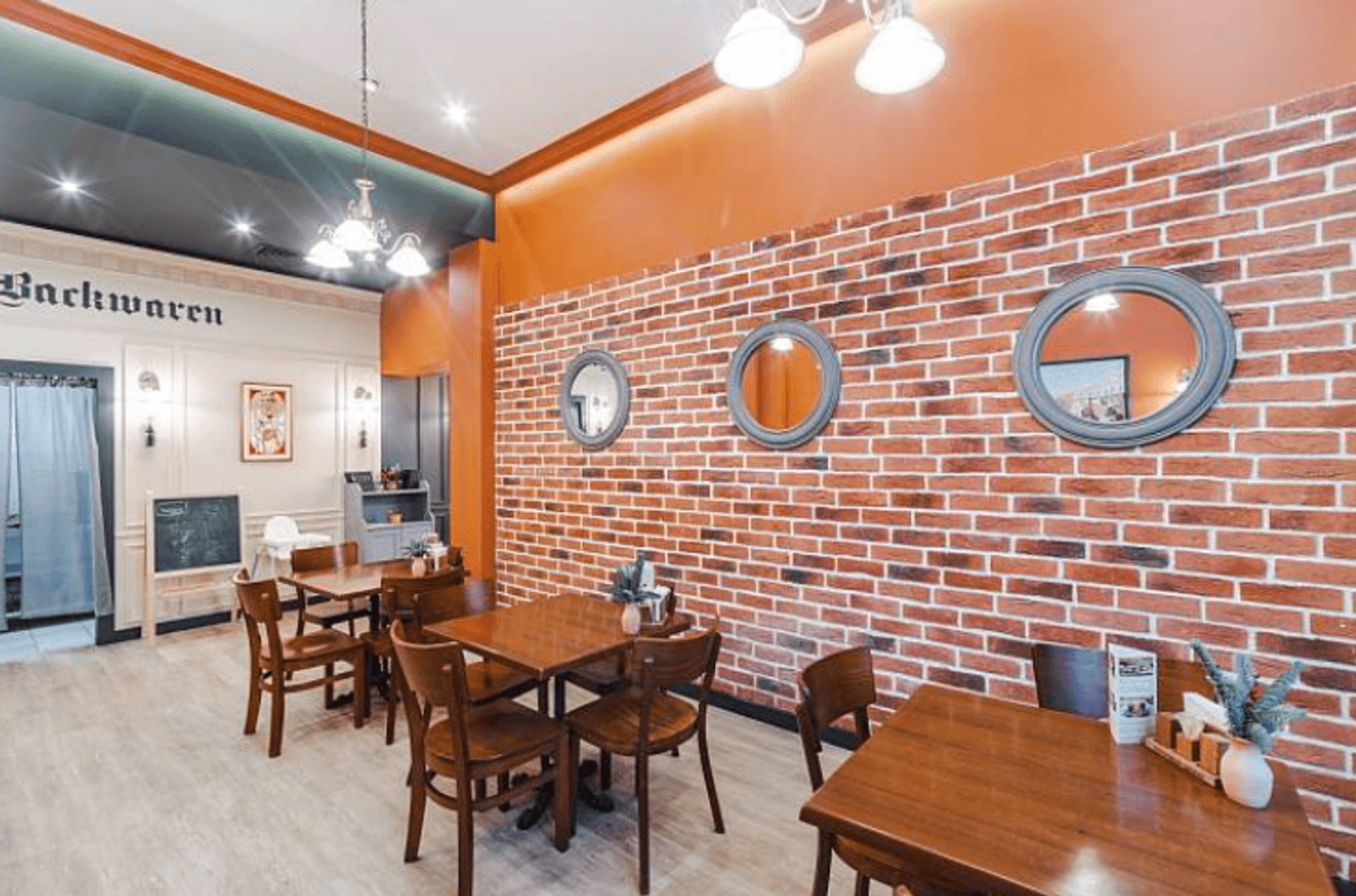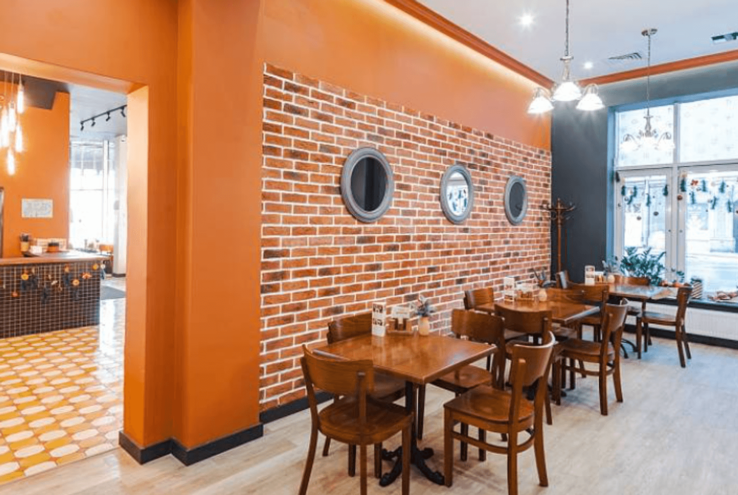 Атмосфера. Пространство с большими окнами по периметру, терракотовыми стенами и фигурными круглыми зеркалами выглядит светлым и теплым. Индустриального шарма заведению добавляют кирпичная кладка и подвесные светильники-колбы.