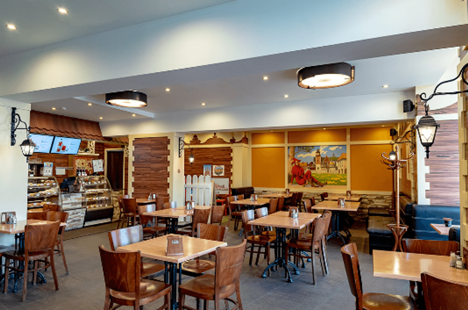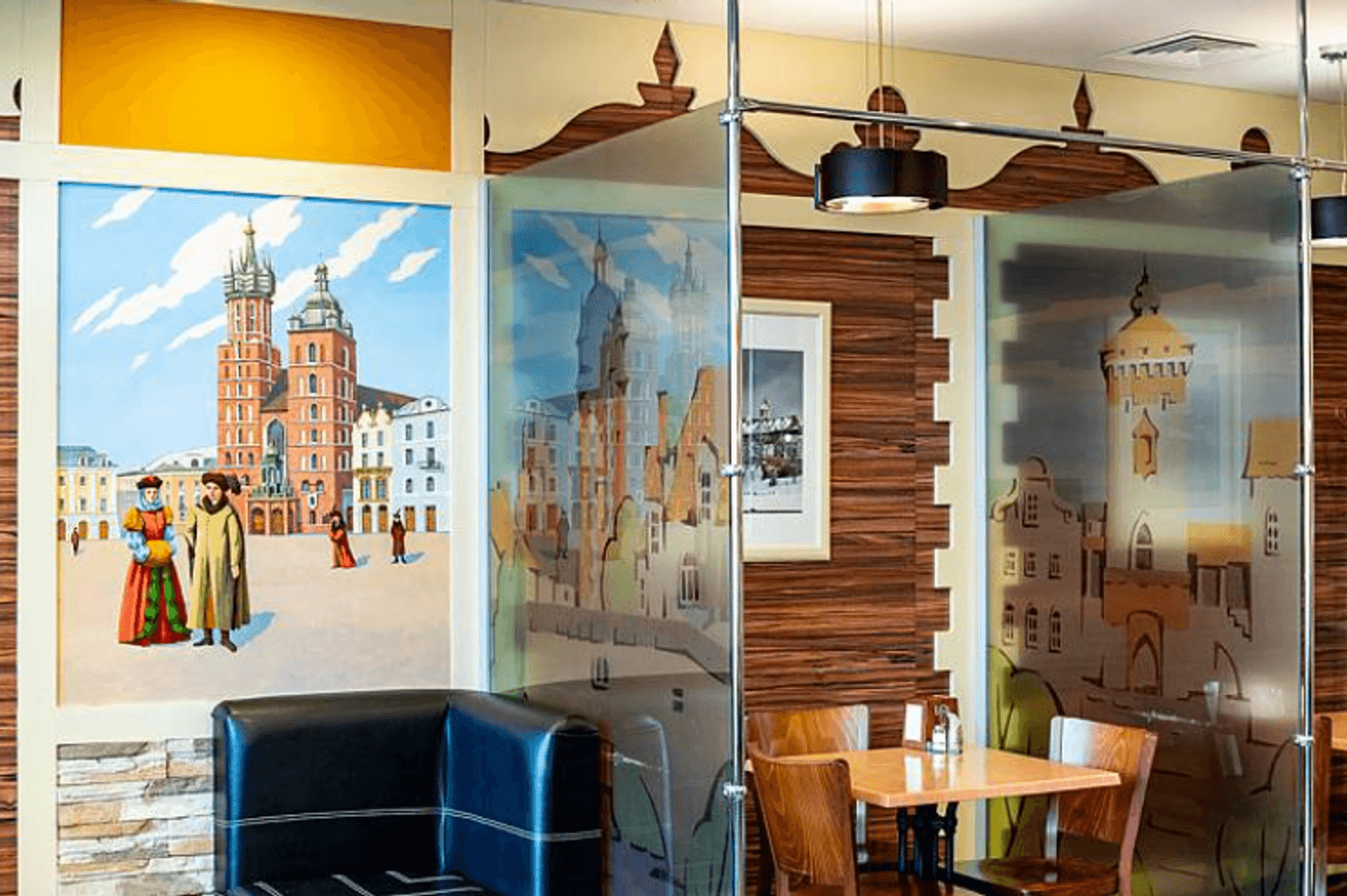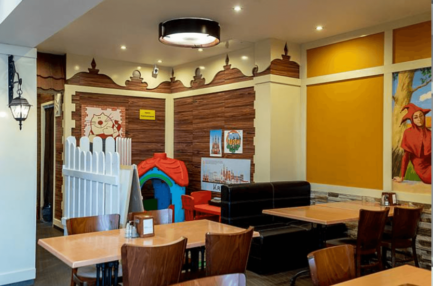 Атмосфера. Пространство украшено масштабными фресками со сценами из европейской жизни, резными элементами в виде городских крыш и расписными стеклянными перегородками. Из-за этого кажется, будто вы обедаете в европейском кафе, а благодаря наличию детской зоны можно провести трапезу более спокойно, чем обычно.