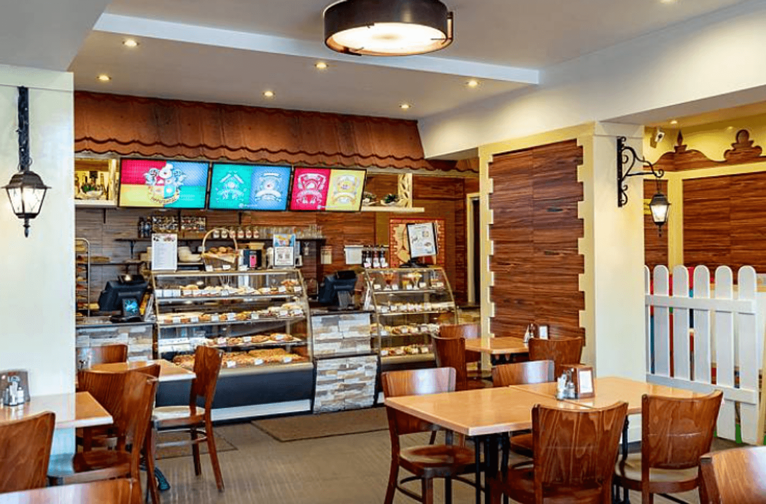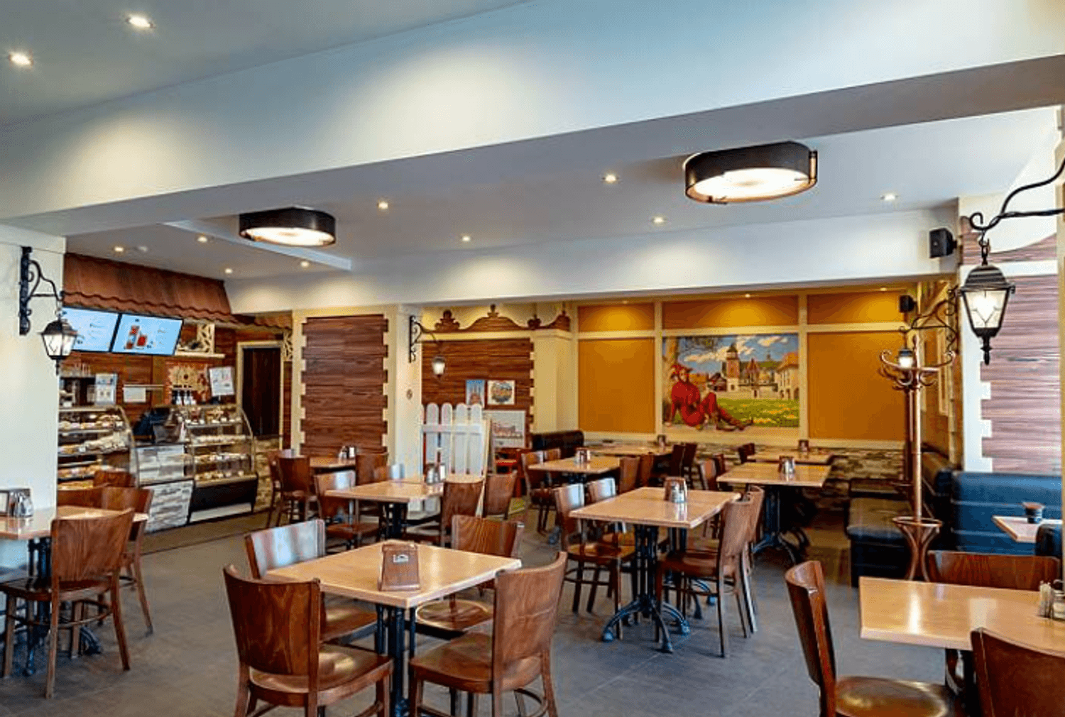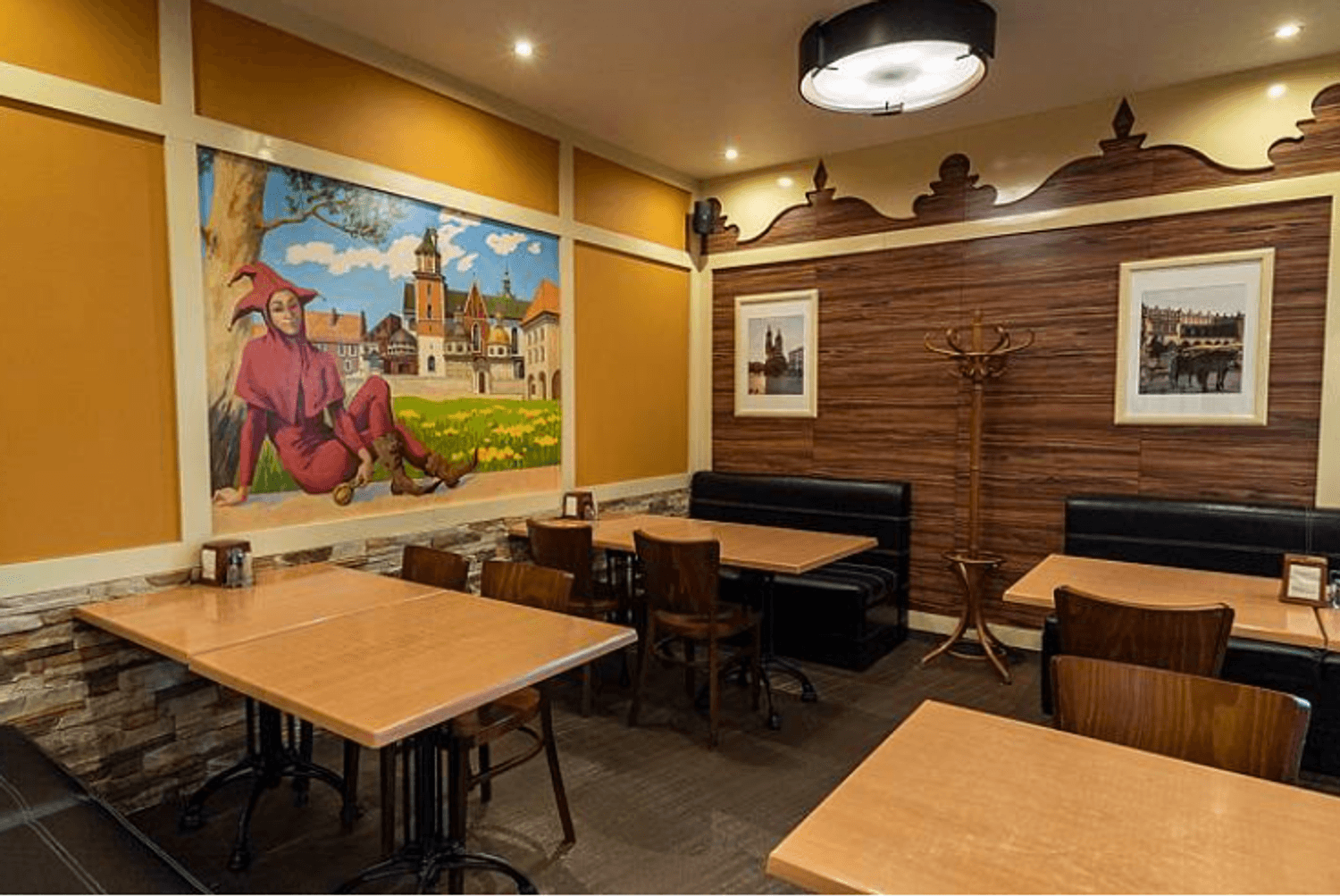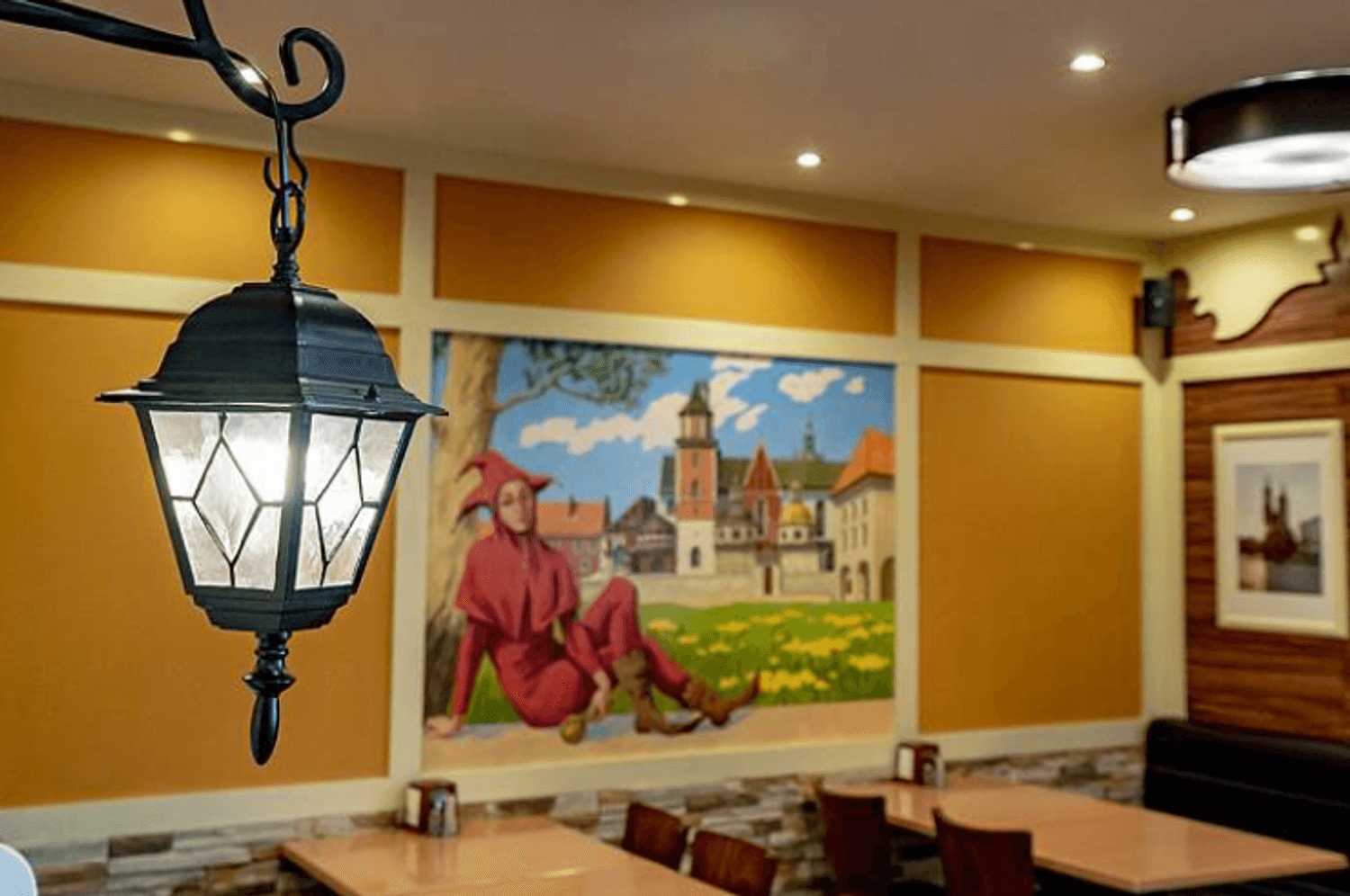 Атмосфера. Пространство украшено масштабными фресками со сценами из европейской жизни, резными элементами в виде городских крыш и расписными стеклянными перегородками. Из-за этого кажется, будто вы обедаете в европейском кафе, а благодаря наличию детской зоны можно провести трапезу более спокойно, чем обычно.