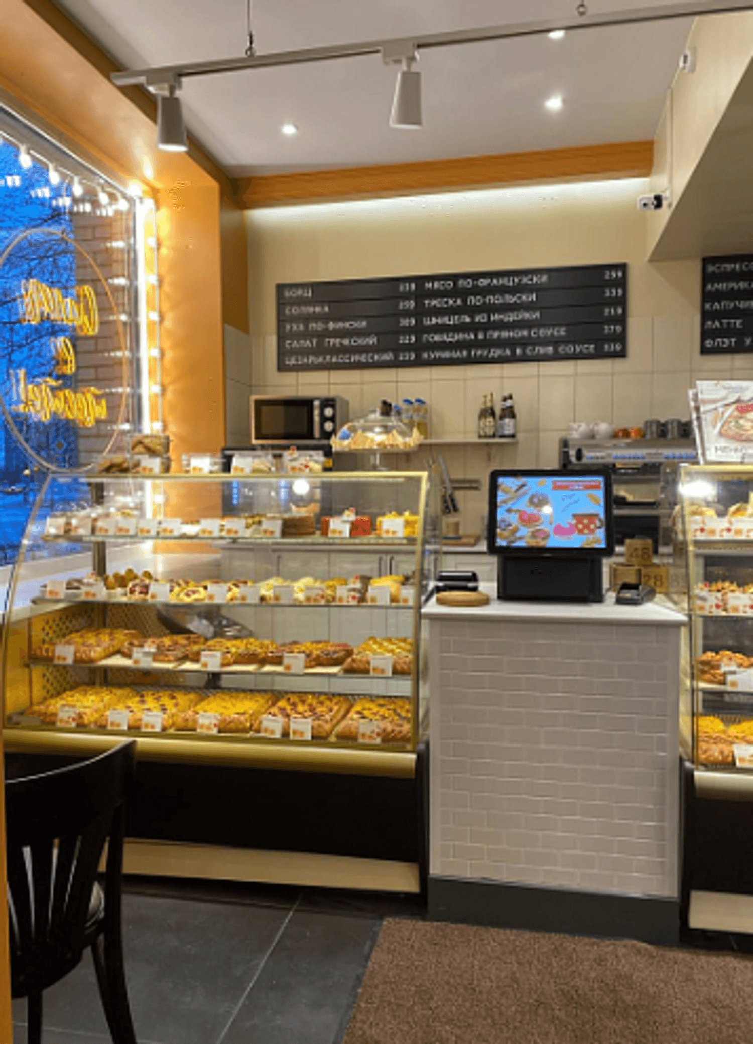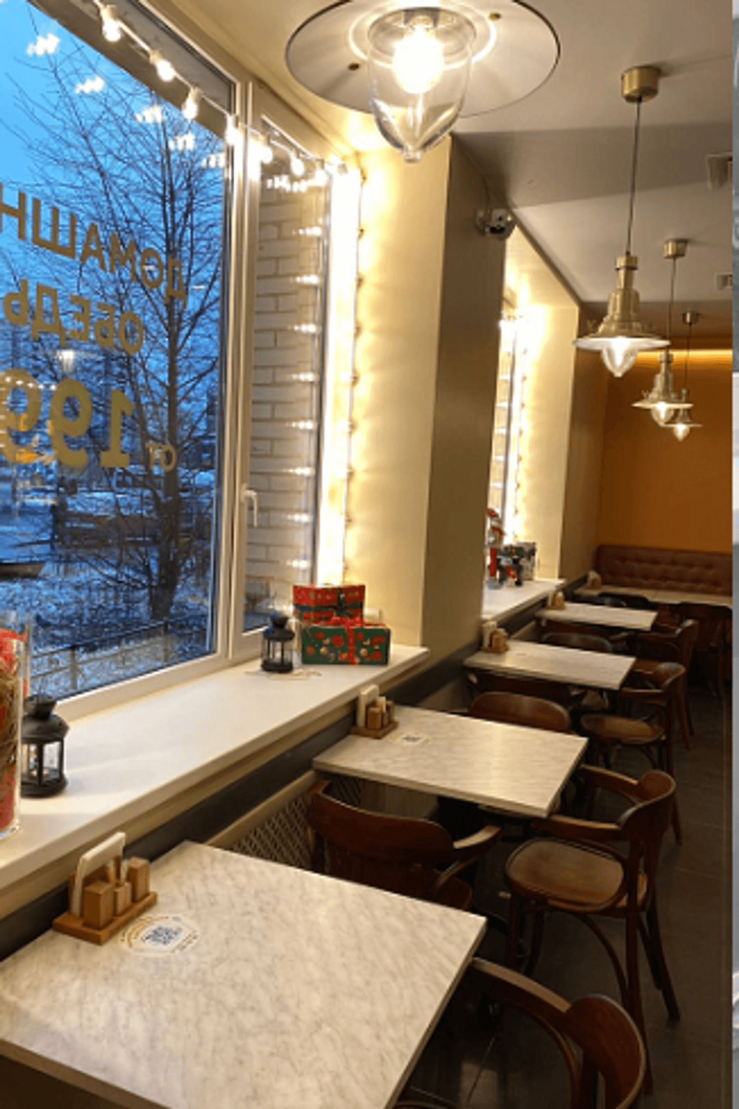 Атмосфера. Небольшой зал с темной мебелью, венскими стульями и гирляндами на окнах создает очень уютную обстановку, в которой одинаково приятно находиться в любое время года. Но атмосфернее всего здесь все же зимой: теплые оттенки желтого и оранжевого в сочетании с мягким светом напоминают уютное заведение где-то в Праге или Вене в канун Рождества.