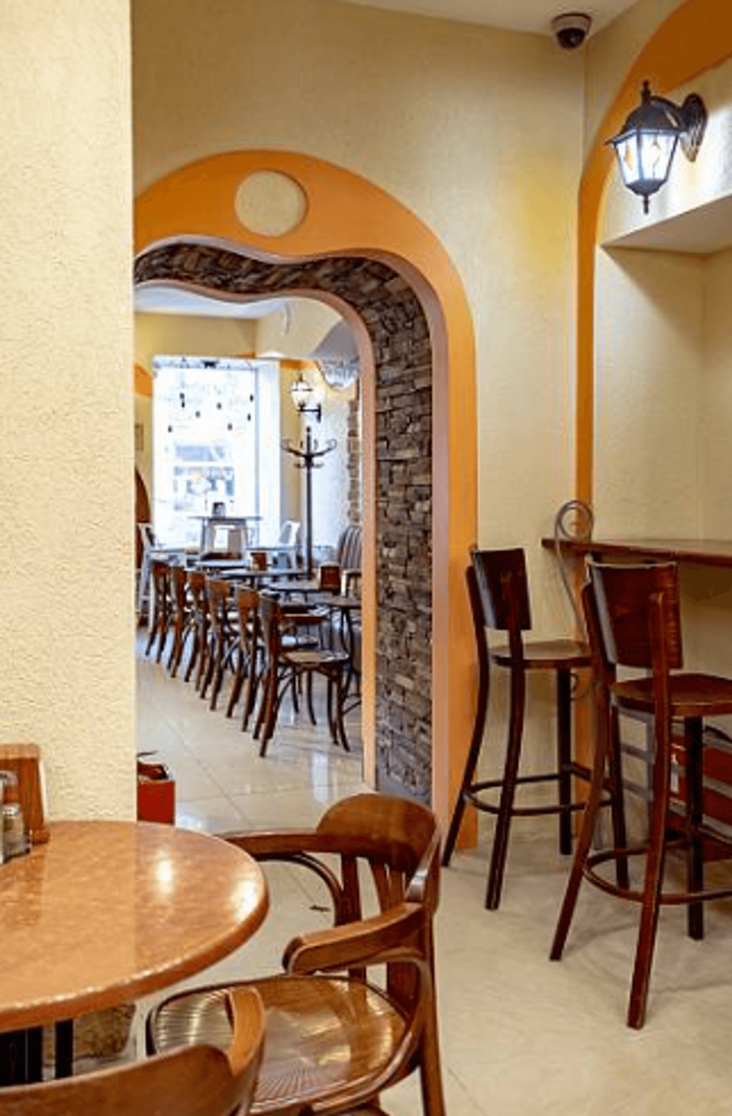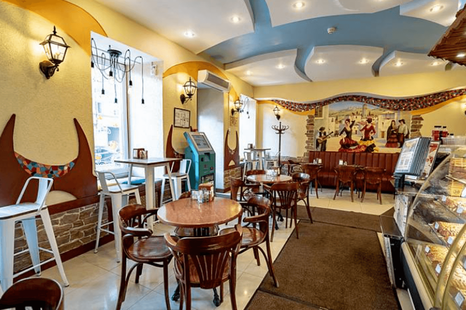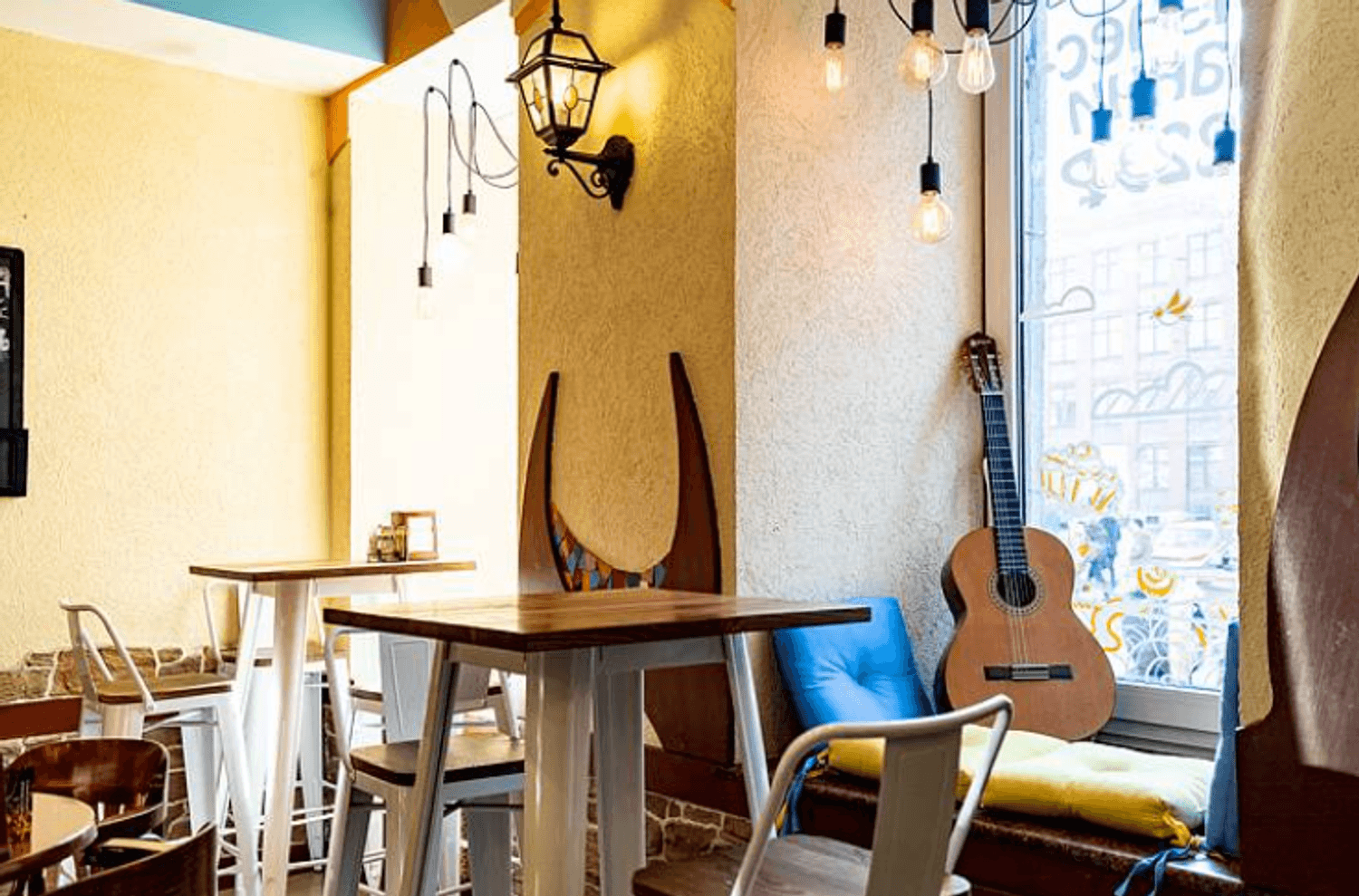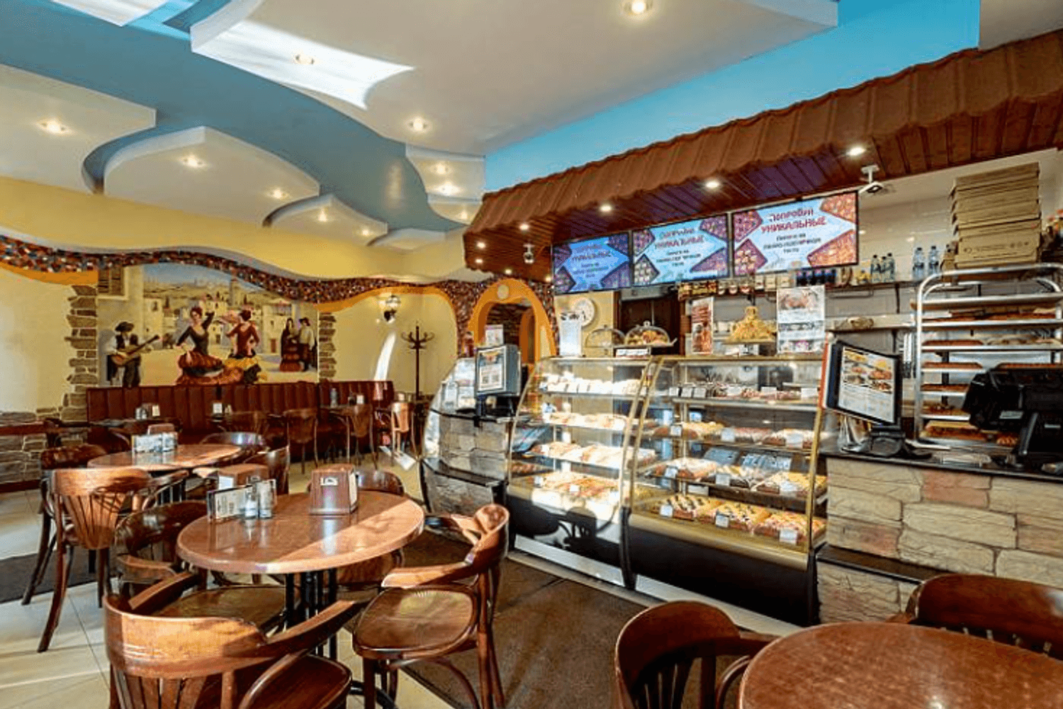 Атмосфера. Светлое пространство в светло-желтых, белых и голубых оттенках с резными стульями и мягкими нишами на подоконниках создает ощущение легкой сказочности. А обилие естественного света и удобные венские стулья располагают к неспешному отдыху за чашечкой кофе с пирожным.