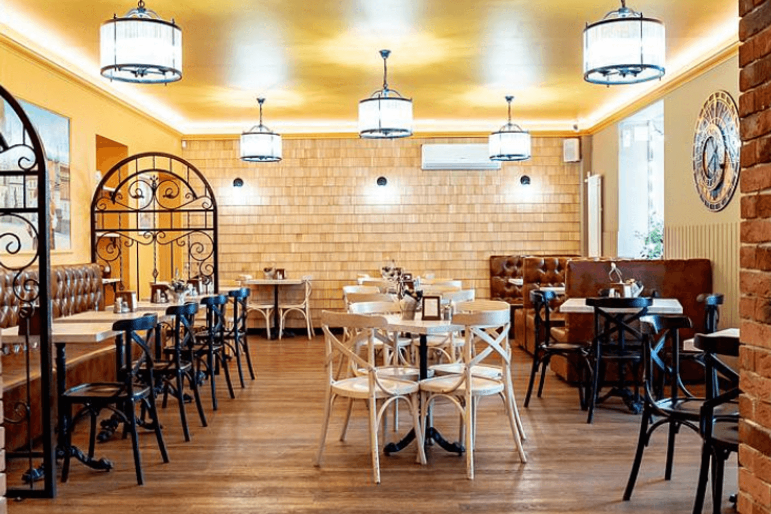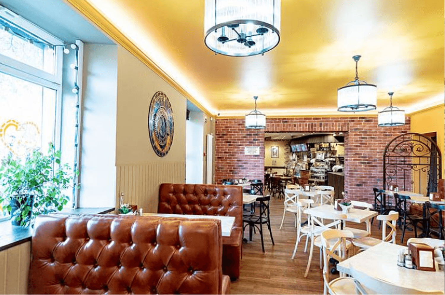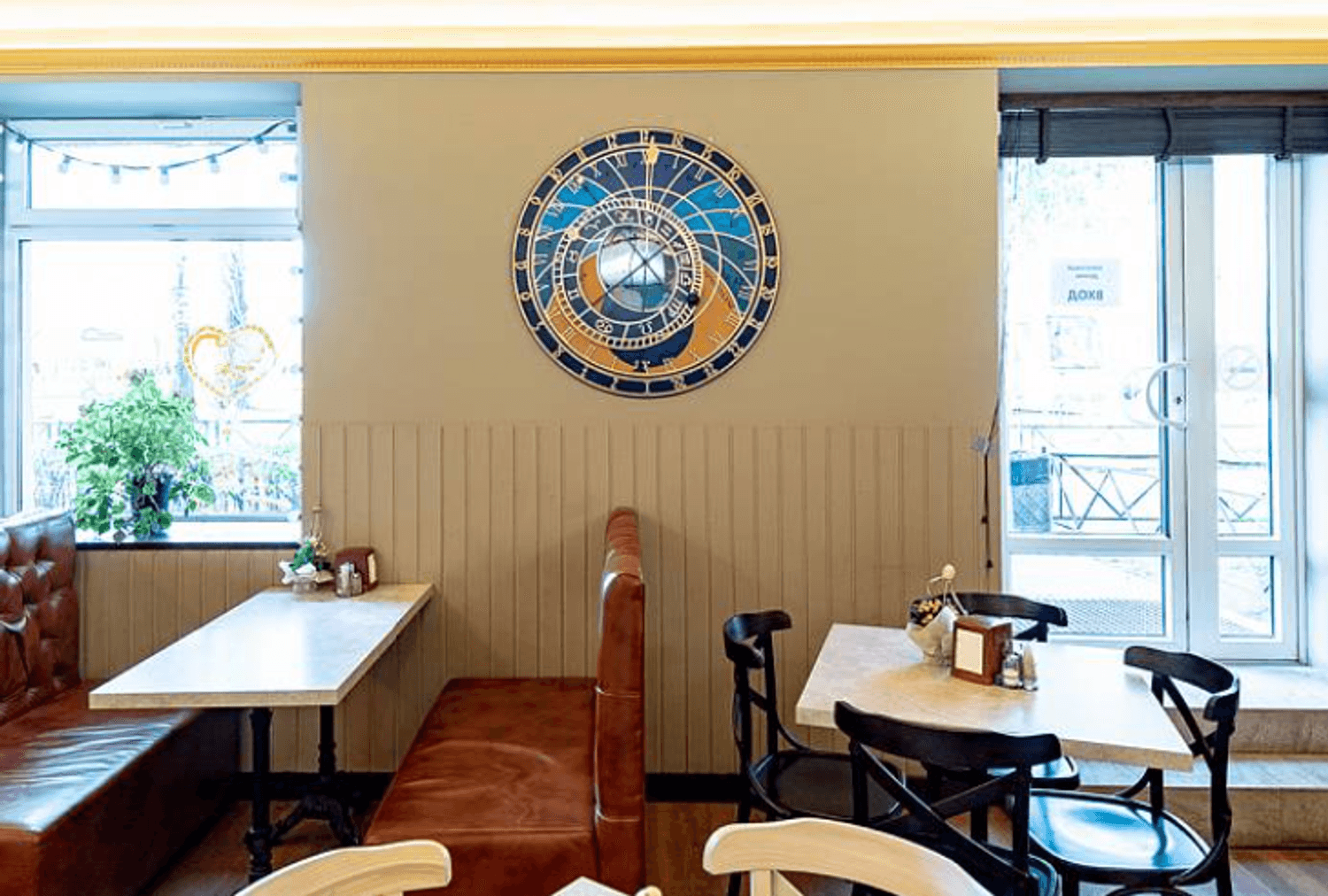 Атмосфера. Пространство с кирпичными стенами, коваными декоративными элементами и белой деревянной мебелью воссоздает атмосферу европейской пекарни где-нибудь в старинном городке. Фрески-картины на стенах и мягкое освещение добавляют уюта.