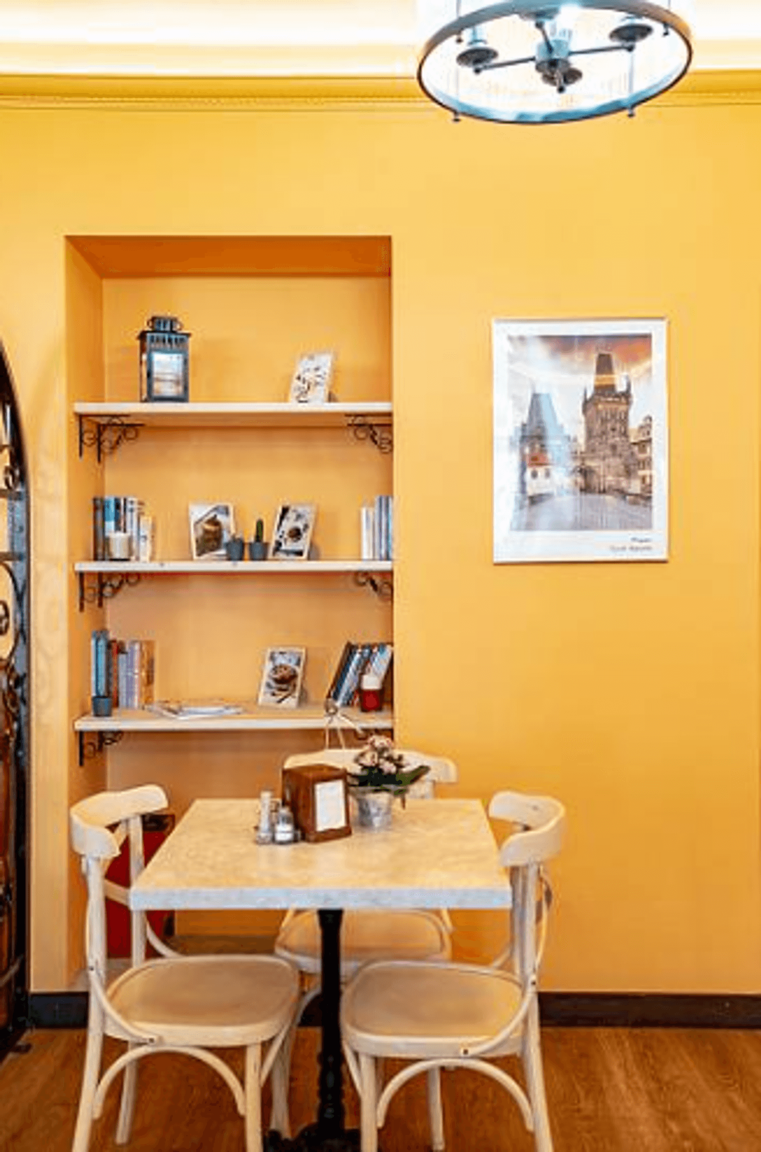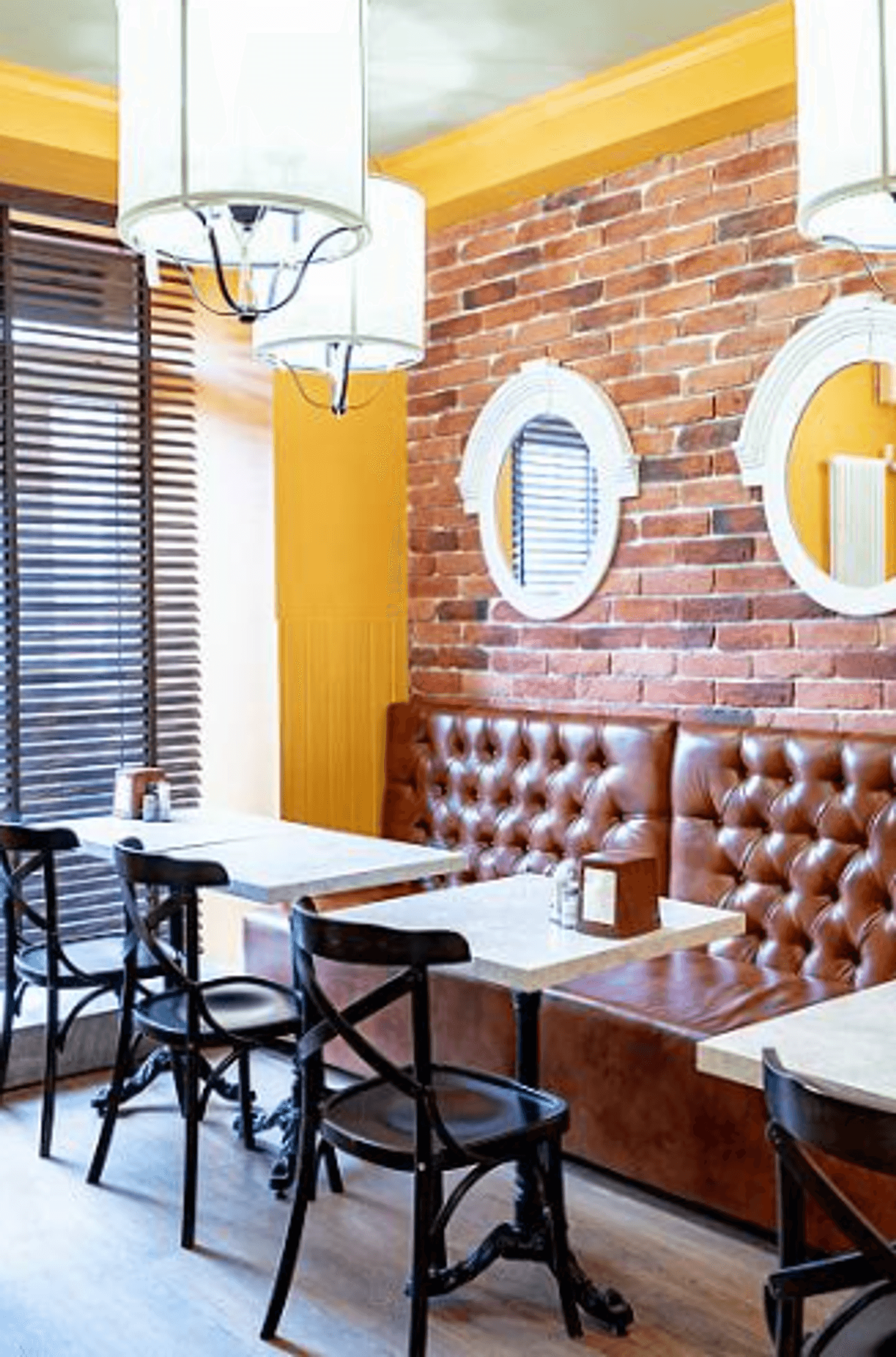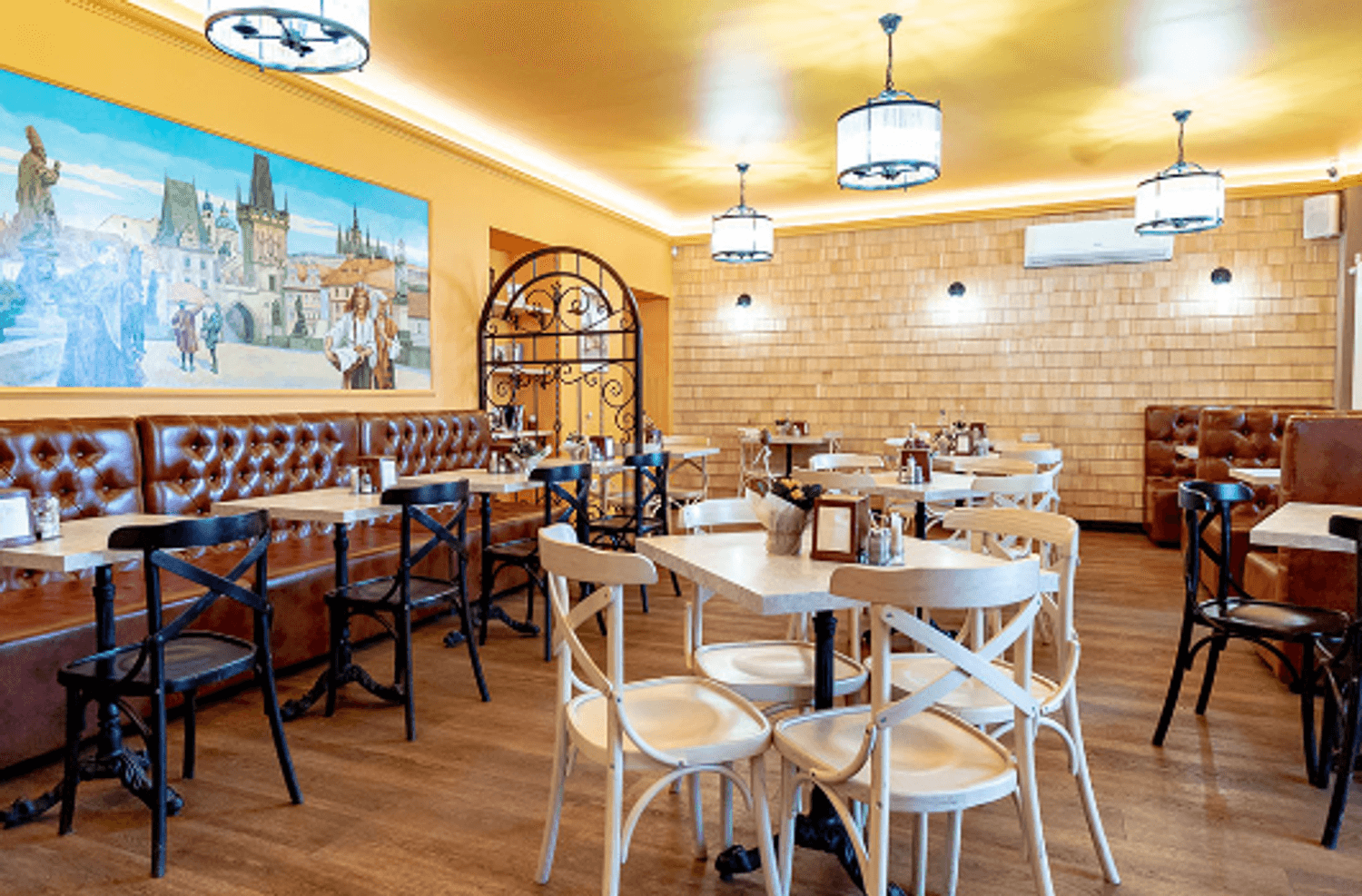 Атмосфера. Пространство с кирпичными стенами, коваными декоративными элементами и белой деревянной мебелью воссоздает атмосферу европейской пекарни где-нибудь в старинном городке. Фрески-картины на стенах и мягкое освещение добавляют уюта.