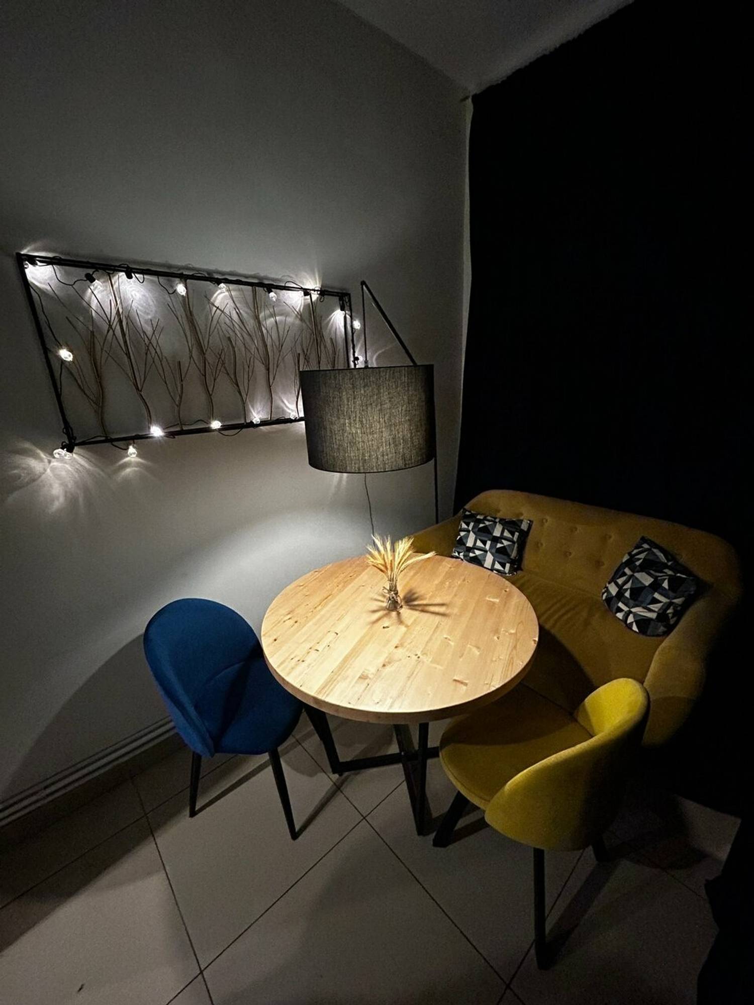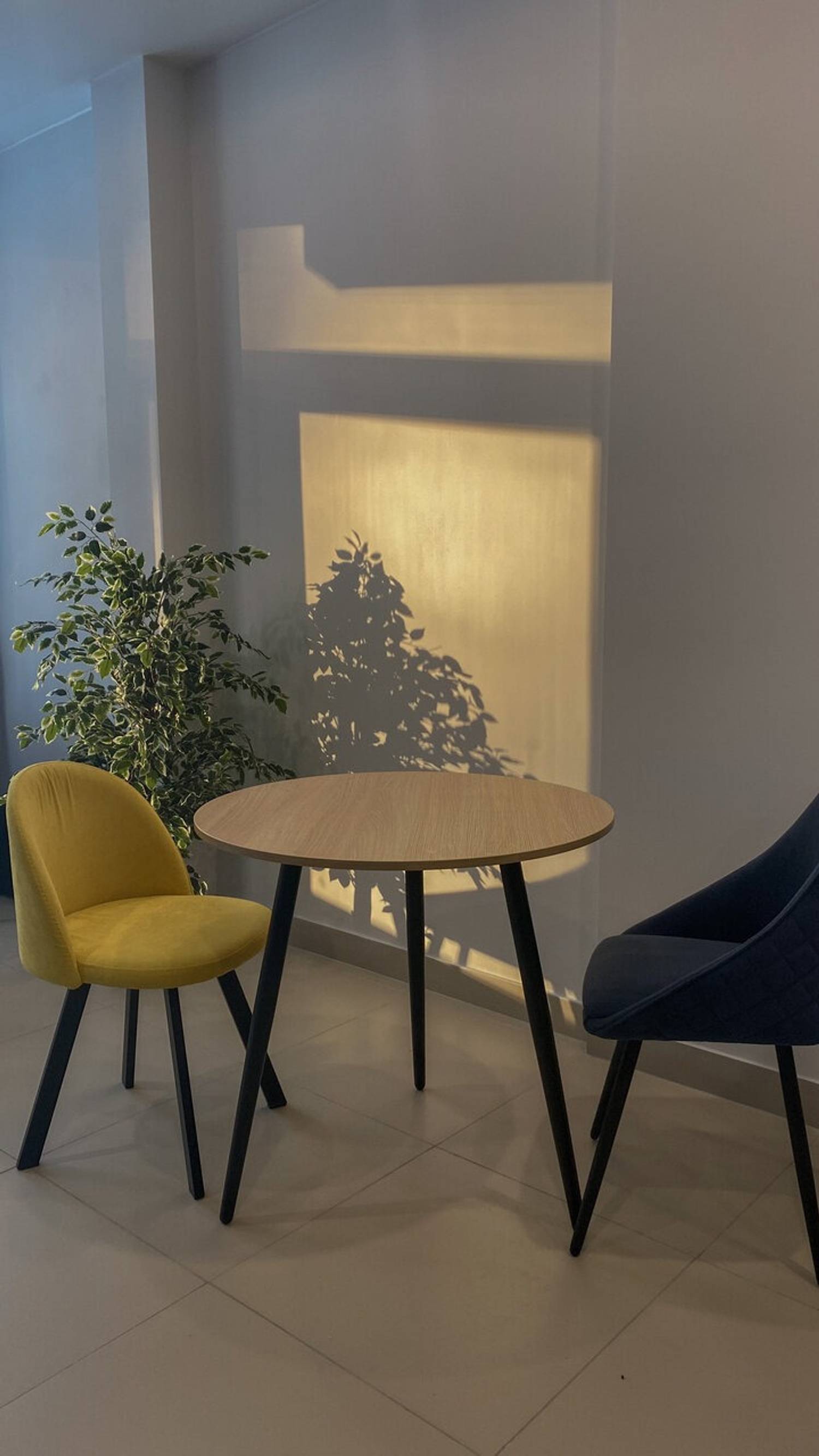 Атмосфера. Небольшое пространство оформлено в современной лаконичной гамме: синяя стойка заказов, синие и коричневые мягкие. Здесь можно взять кофе с собой или отдохнуть в заведении за напитком.