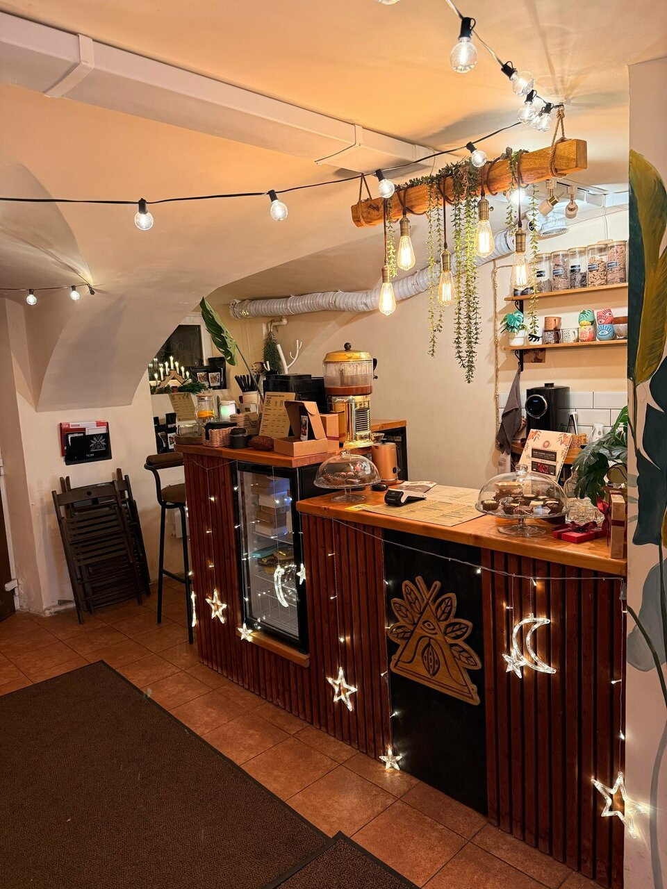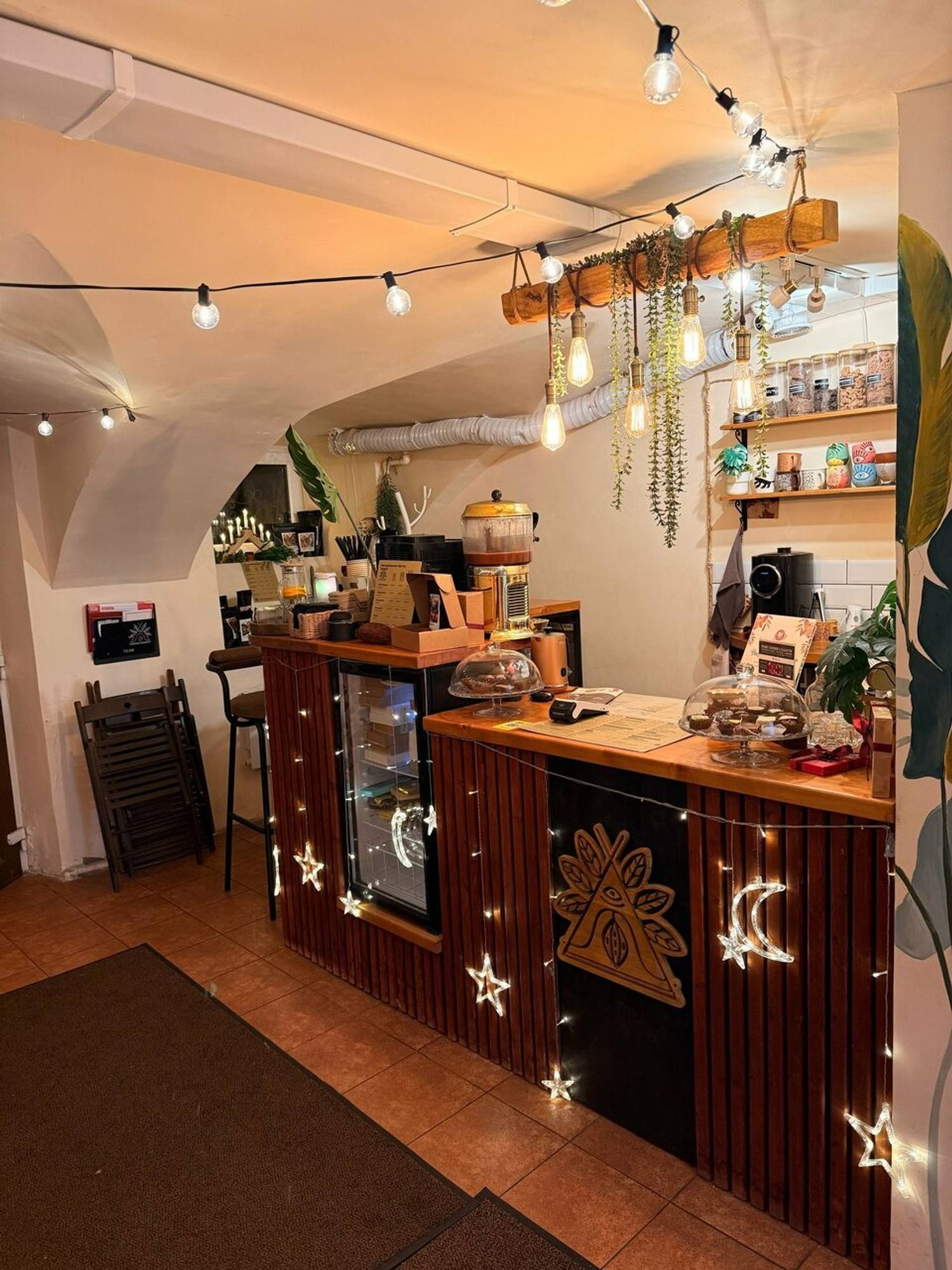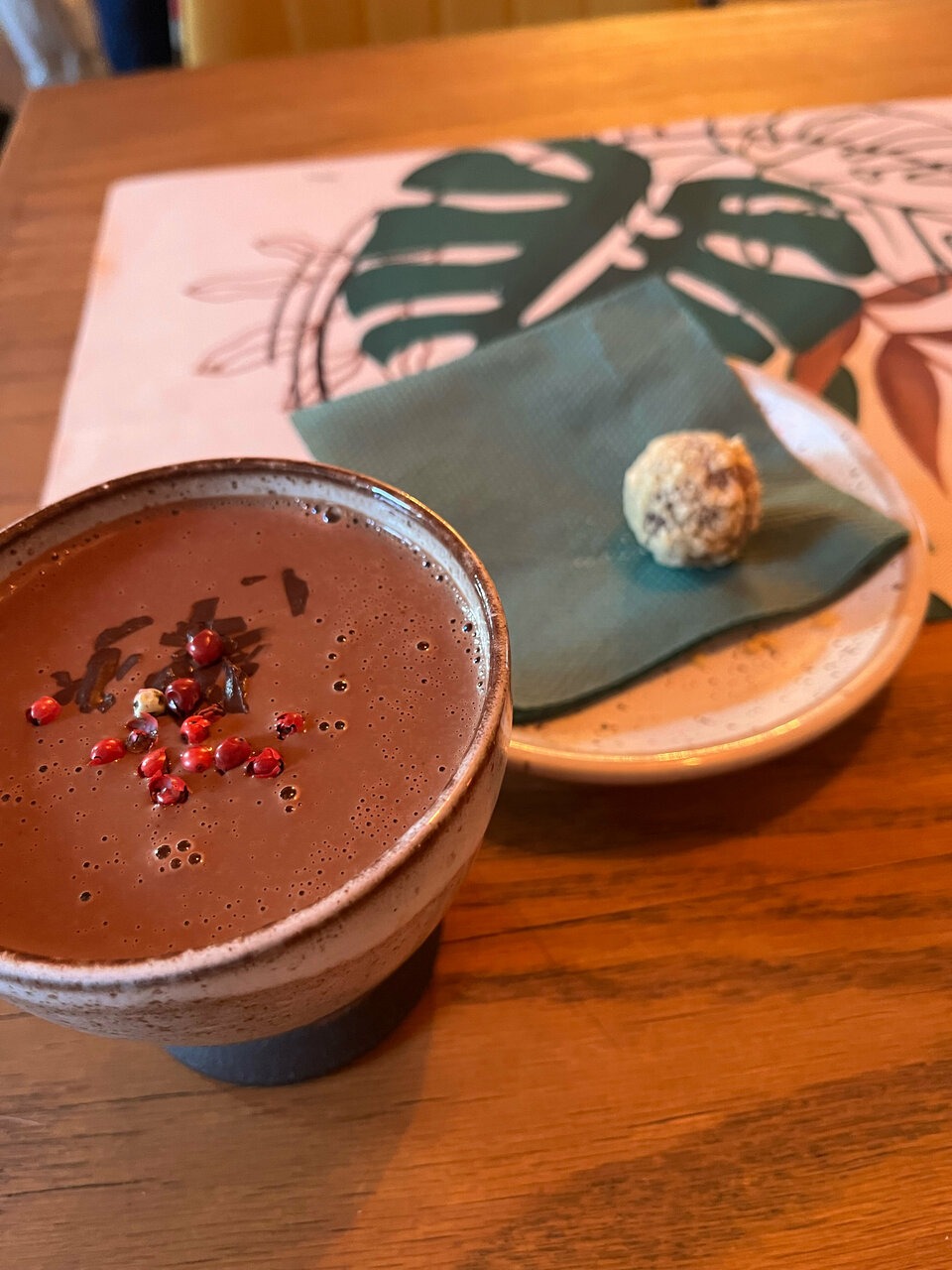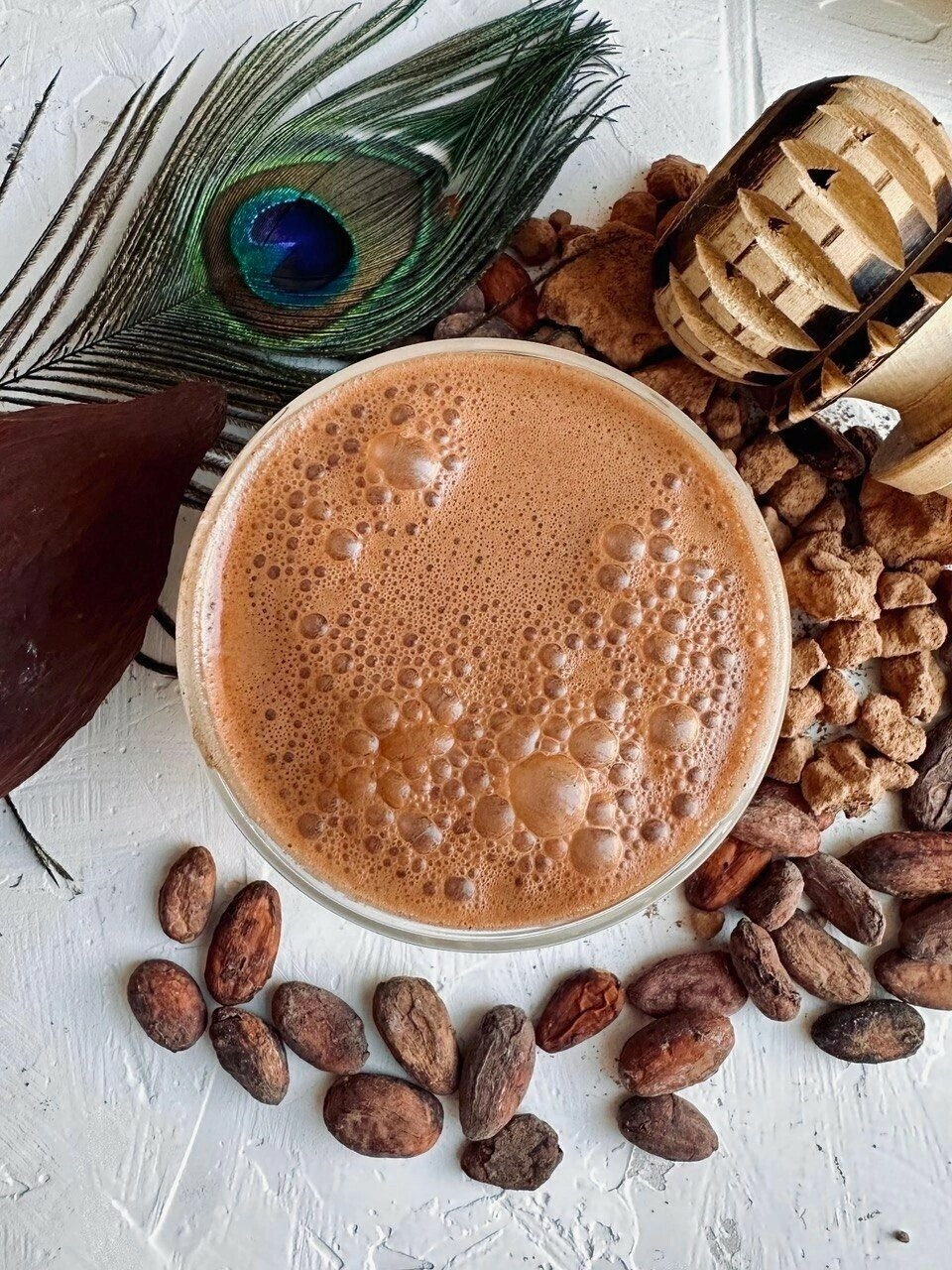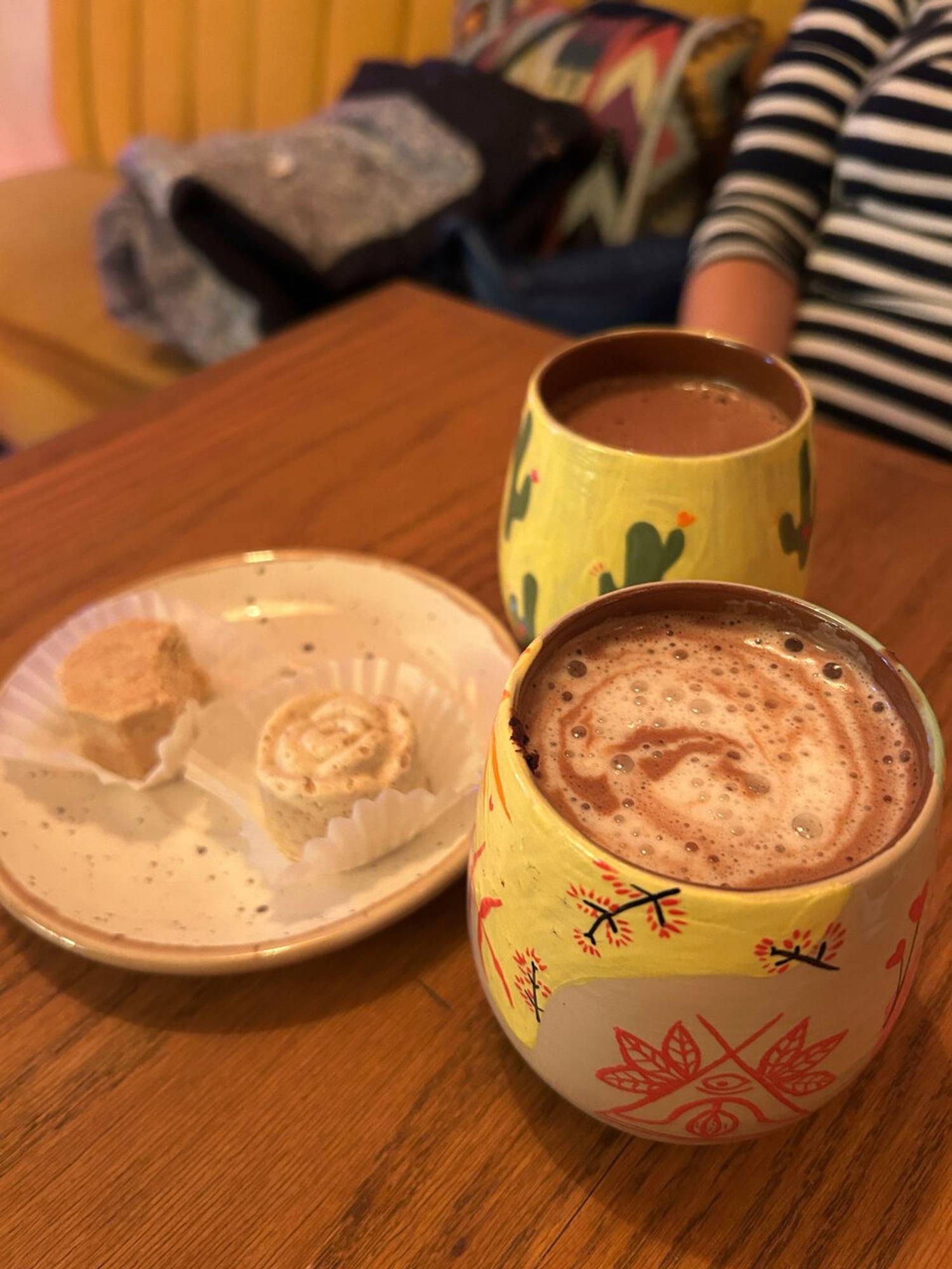 Еда и напитки. В меню какао-напитки: от традиционного церемониального до версий с чили, апельсином и десертных вариаций с маршмеллоу, кокосом или вкусом крем-брюле. Также подают кофе, чаи и авторские десерты без сахара.
