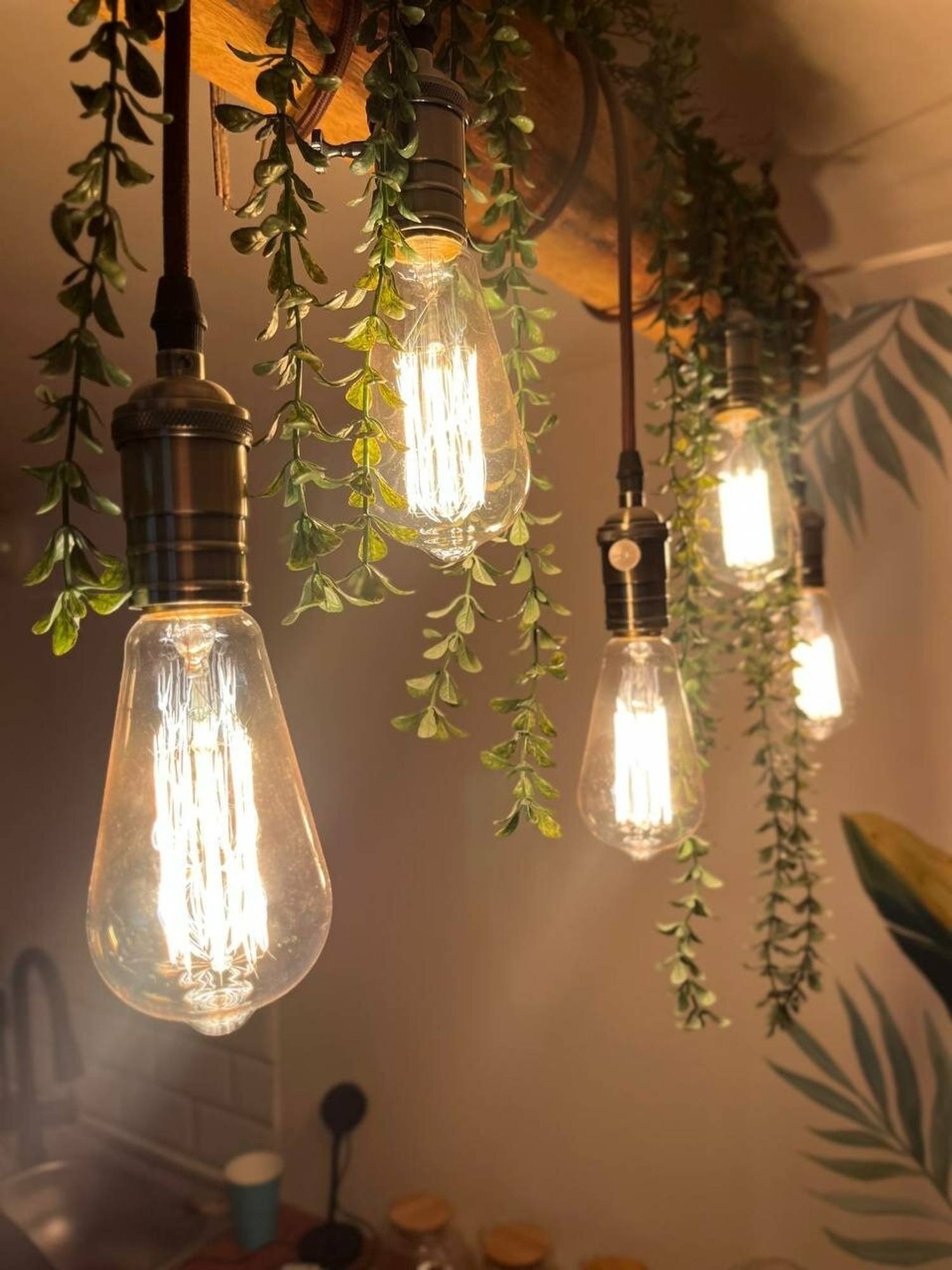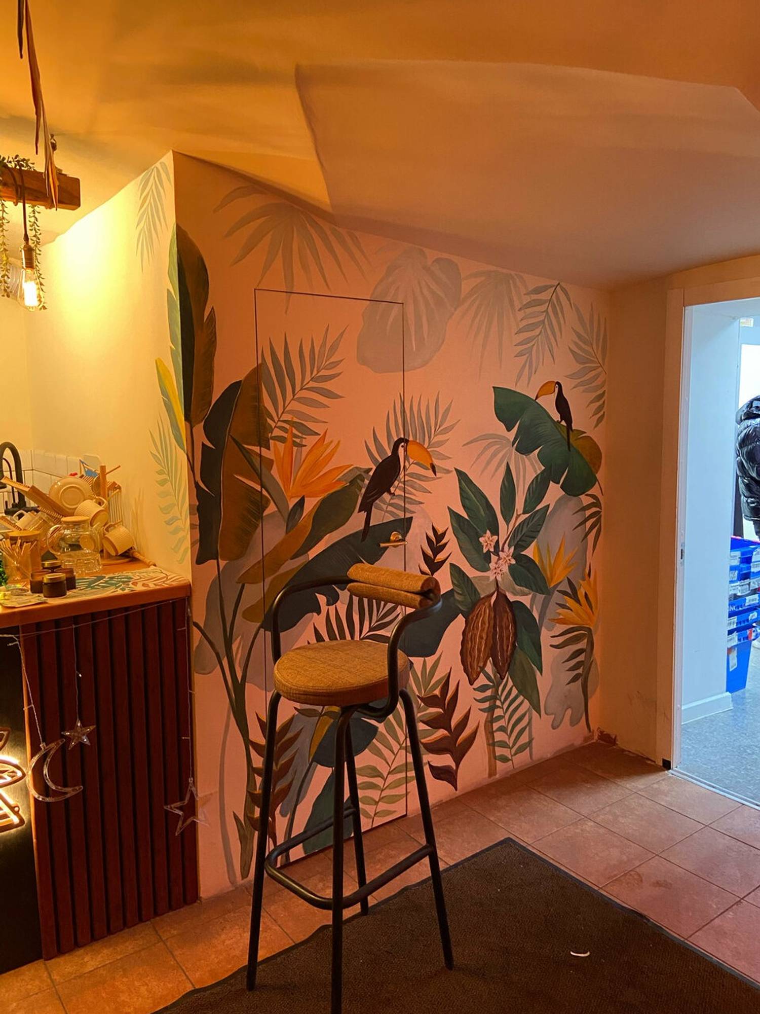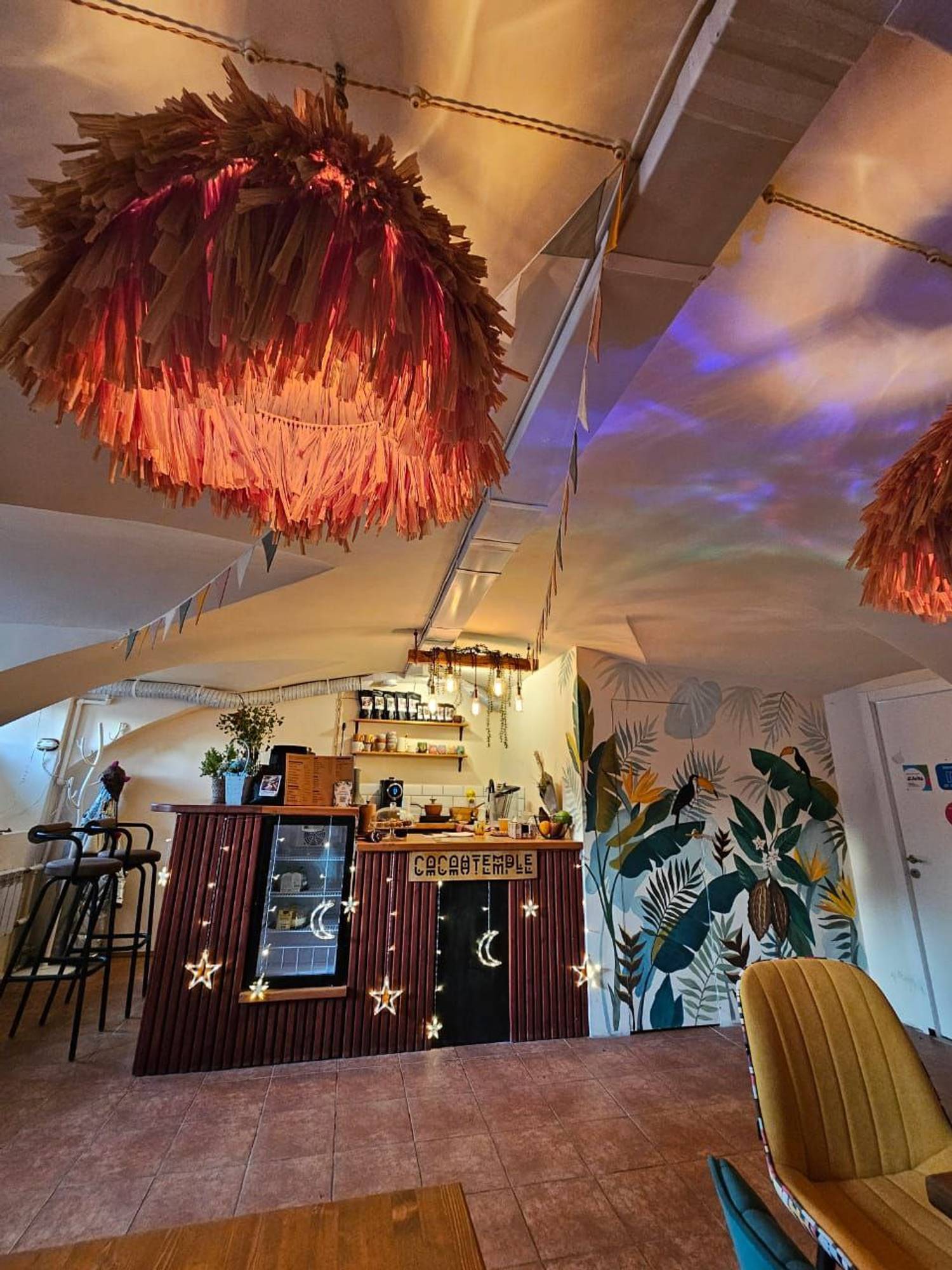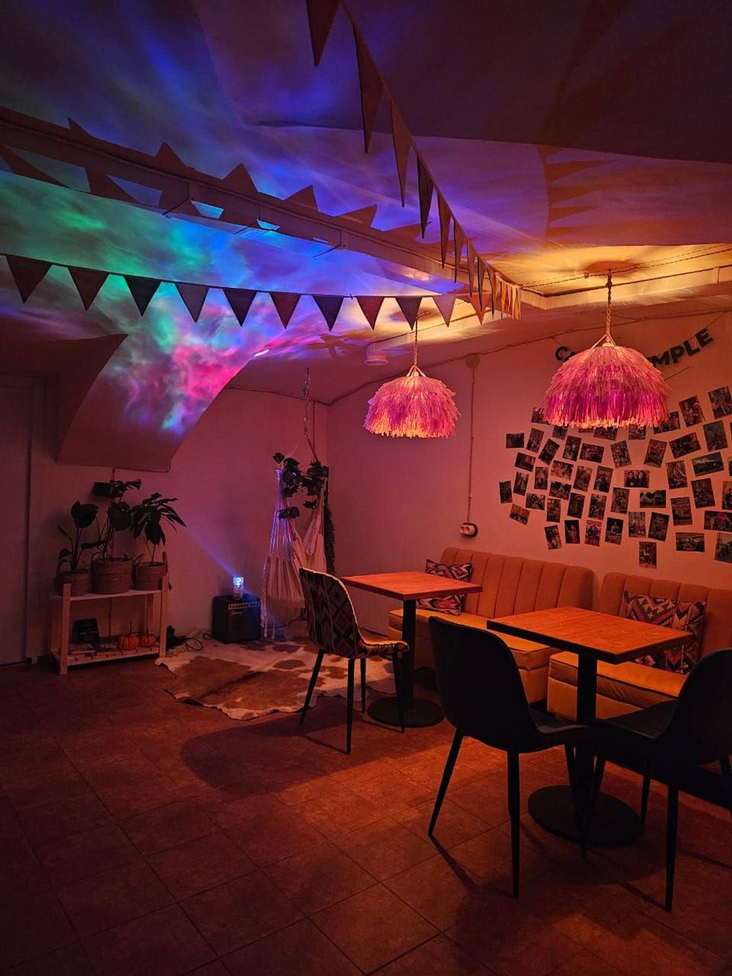 Атмосфера. Интерьер напоминает уголок джунглей: на одной стене — рисунки листьев, гитара в углу и развешанные фотографии. Пушистые люстры и мягкий свет дополняют уют, а деревянная стойка заказов и диваны с декоративными подушками в этнических орнаментах приглашают расслабиться и остаться надолго.