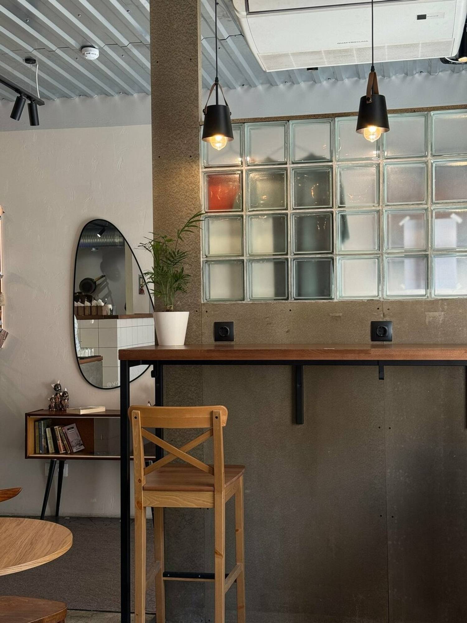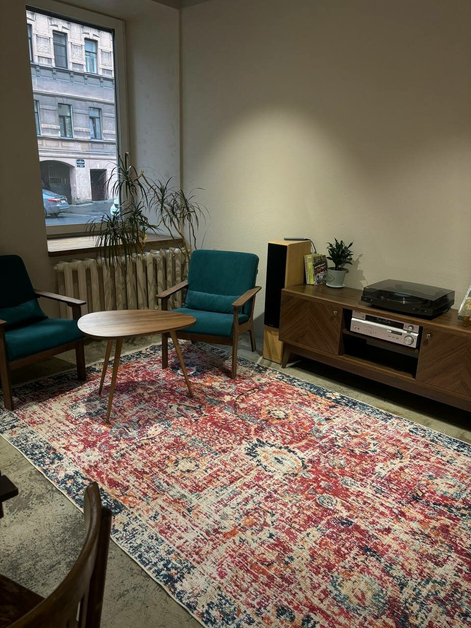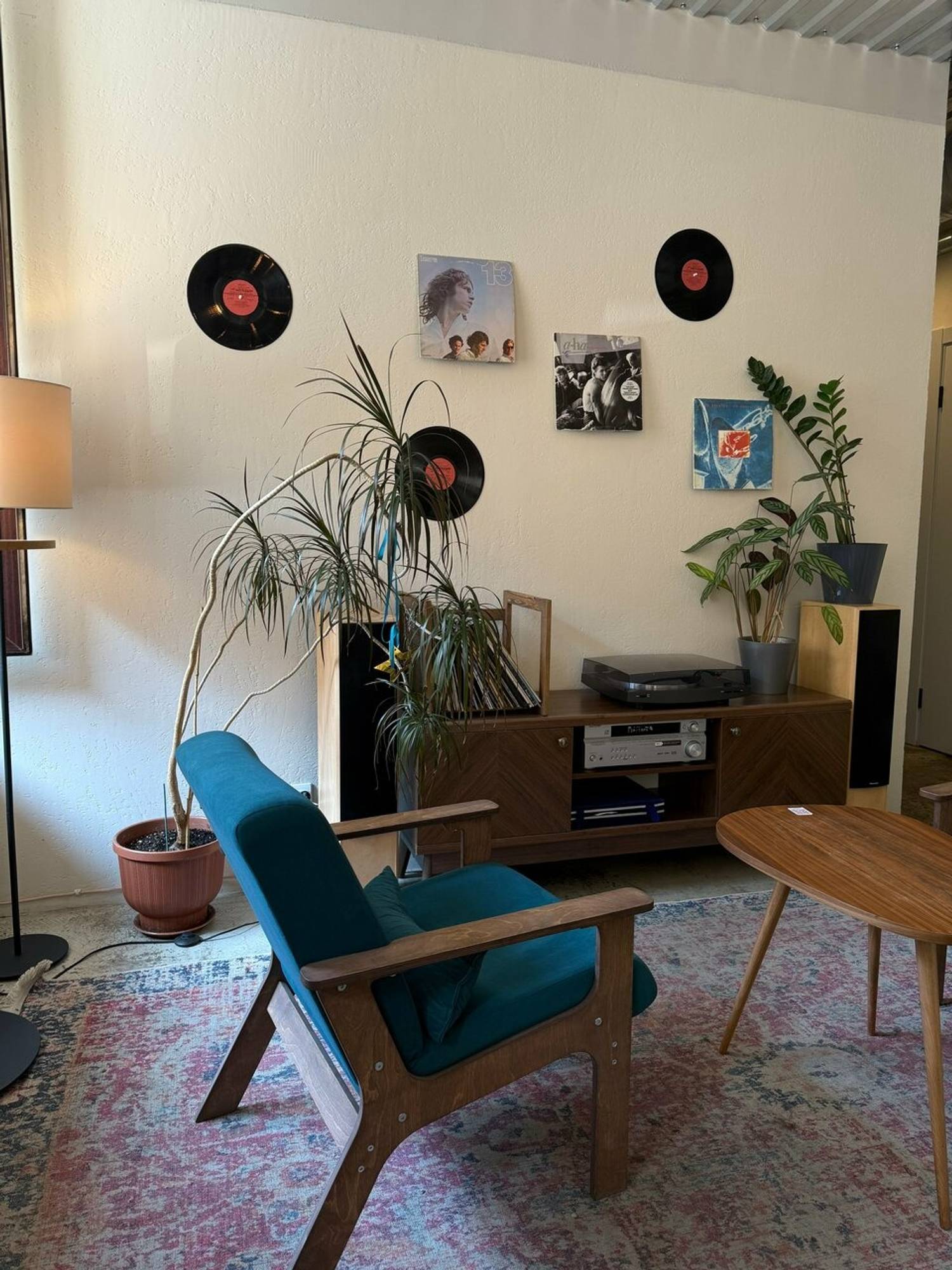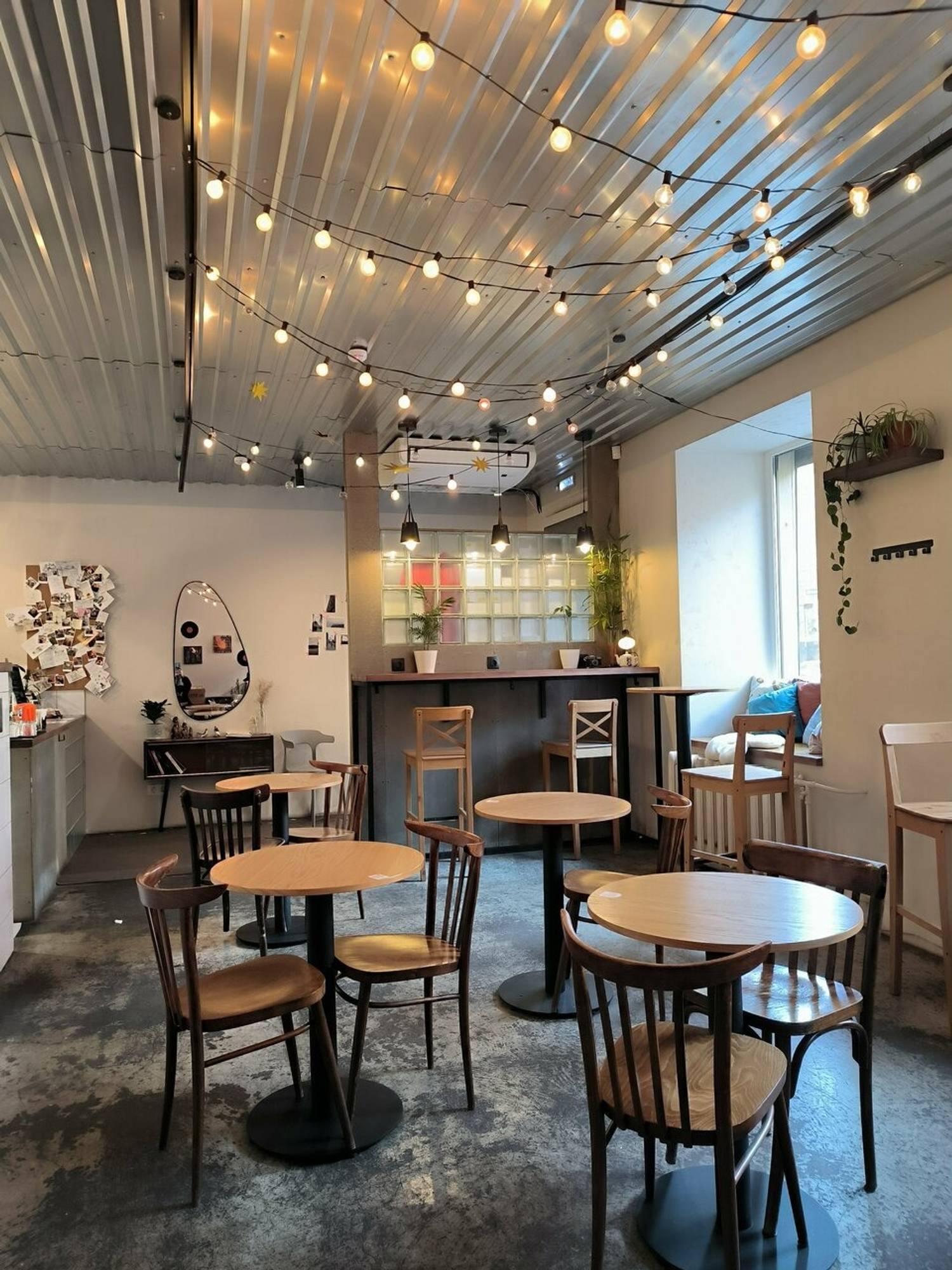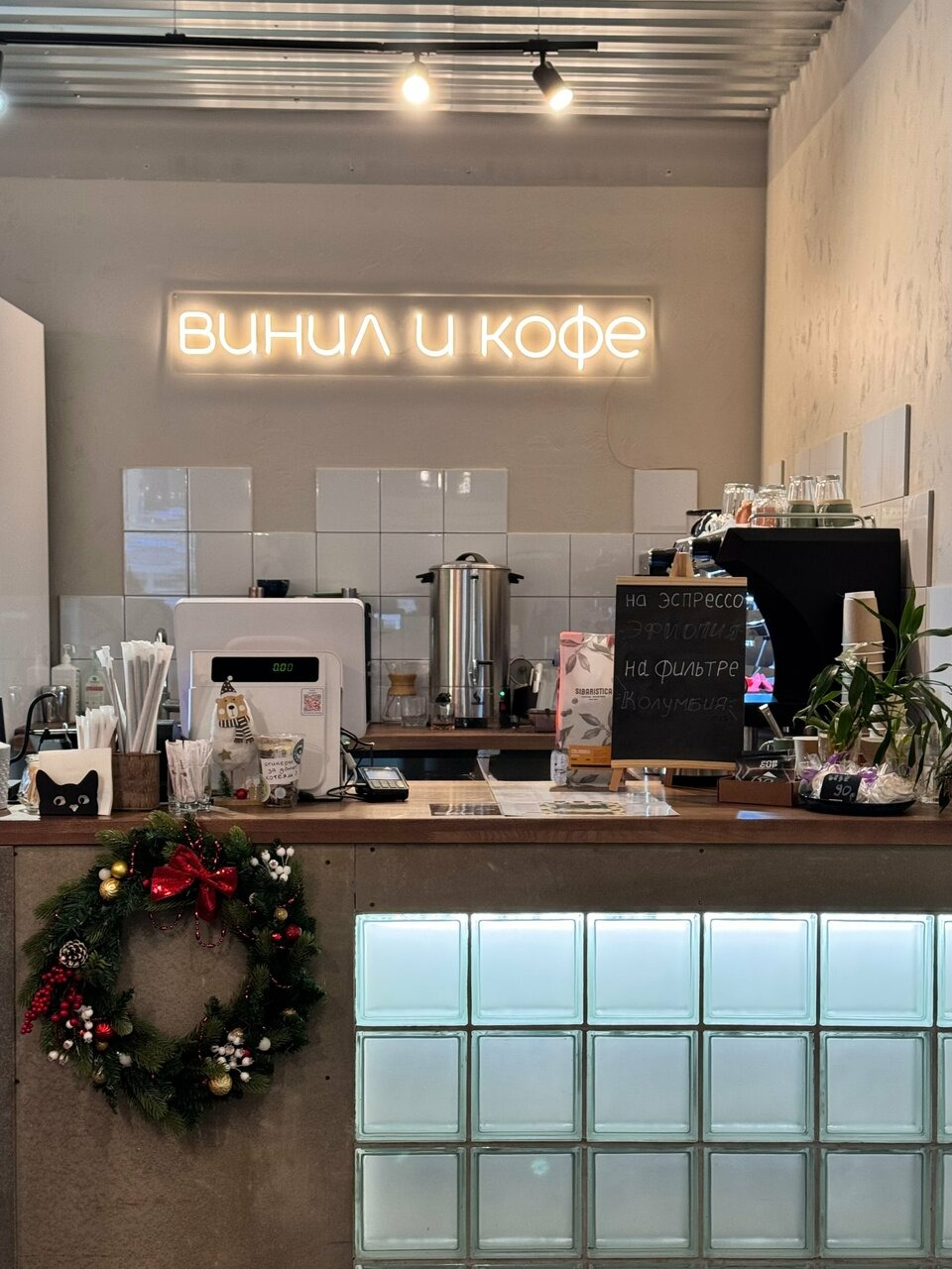 Атмосфера. Уютное гнездышко для ценителей аналогового звука и хорошего кофе. Интерьер наполнен теплом: гирлянды на потолке, деревянные столы и стулья, в том числе высокие у стойки, а на стенах — виниловые пластинки. Сердце заведения — винтажный комод с проигрывателем, где можно послушать альбомы легенд вроде The Beatles и Deep Purple.