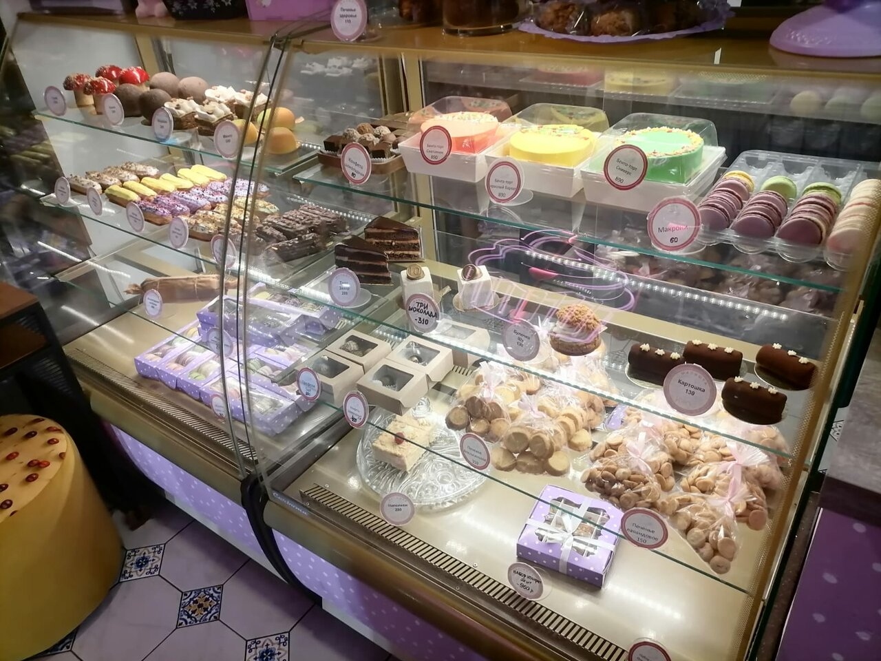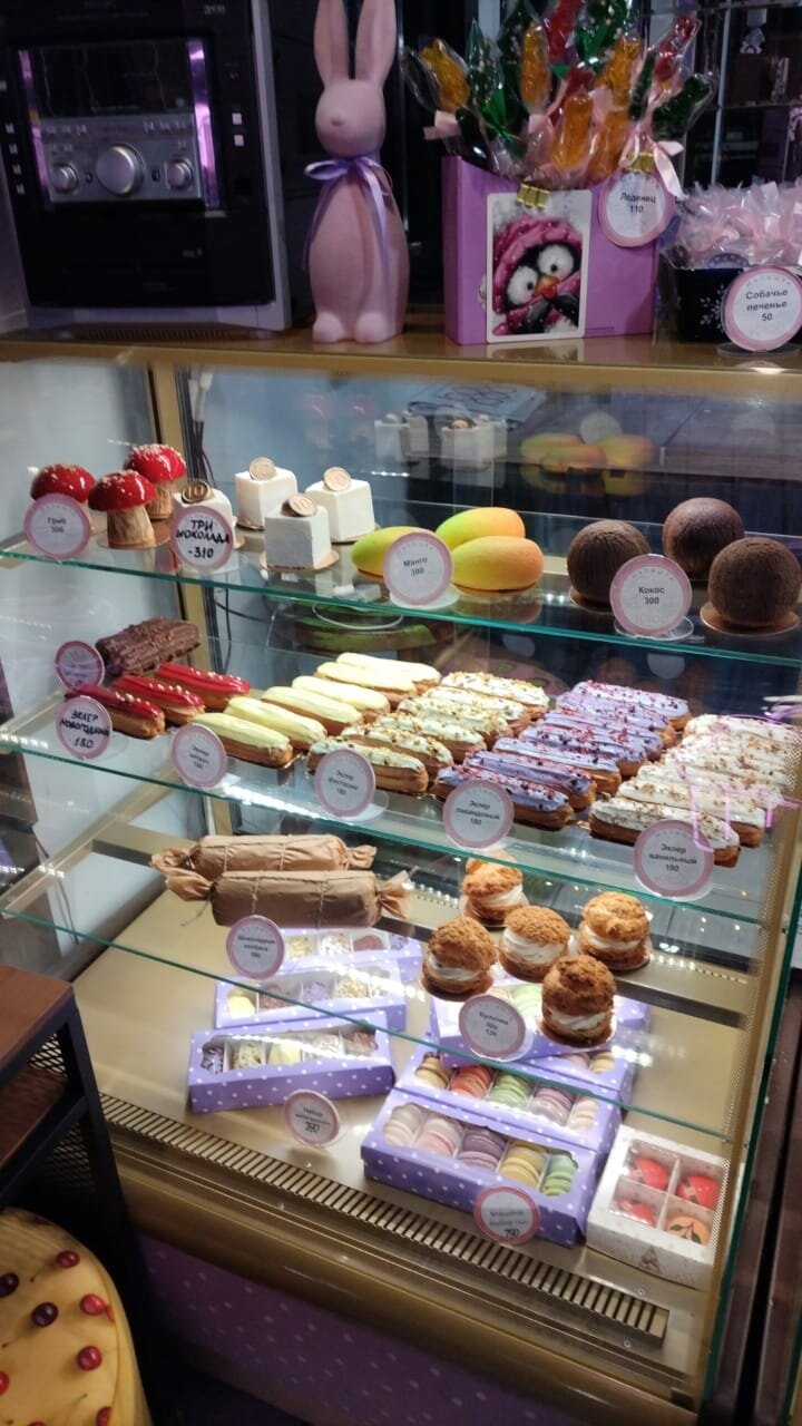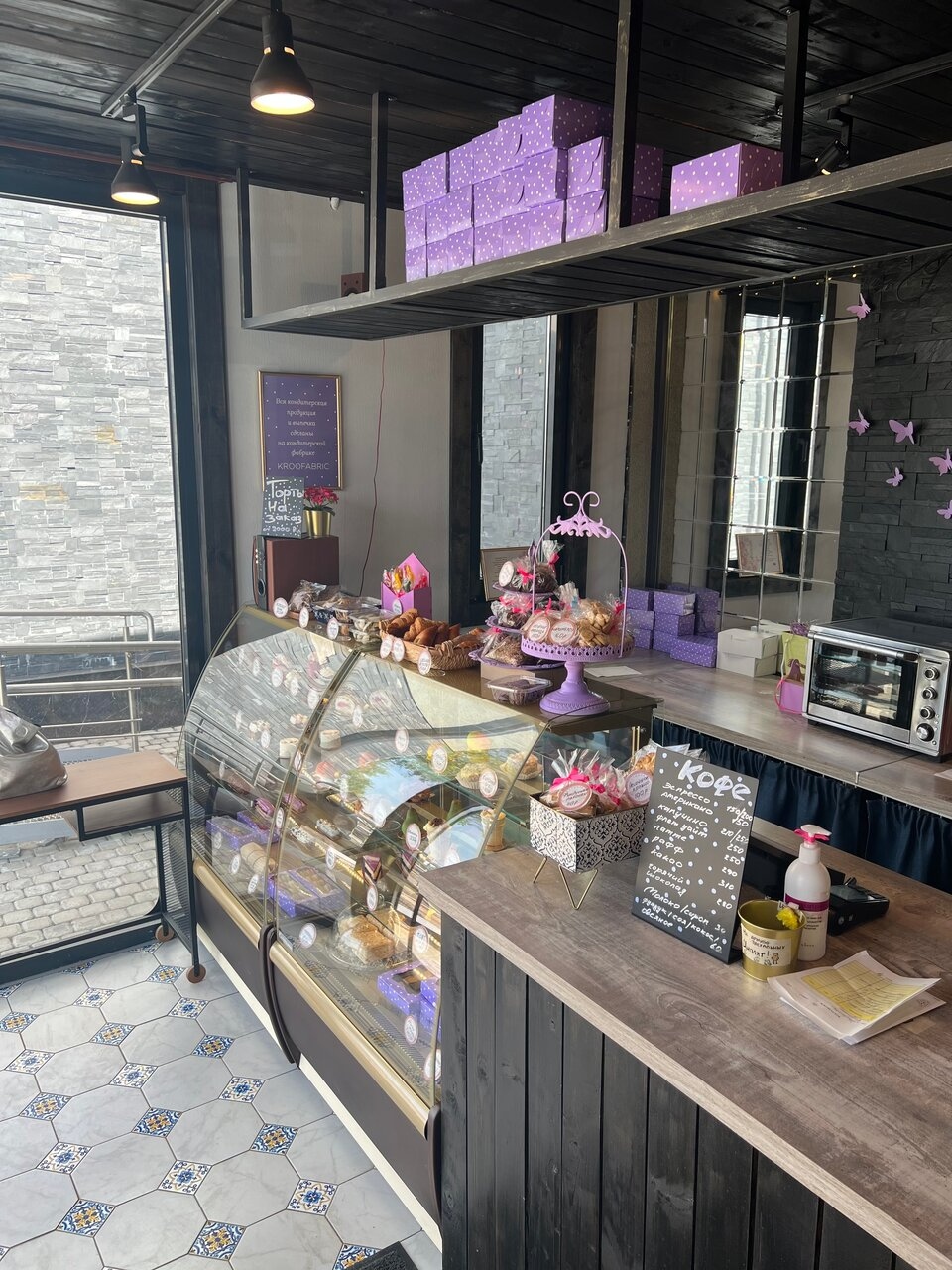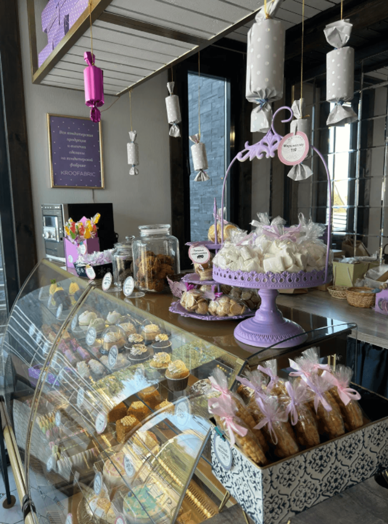 Атмосфера. Интерьер в лиловой гамме с декоративными конфетками, подвешенными к потолку, создает атмосферу сказочной кондитерской. Взгляд сразу привлекают художественно оформленные витрины с десертами, а пастельные акценты в отделке усиливают ощущение уютного лавандового домика.