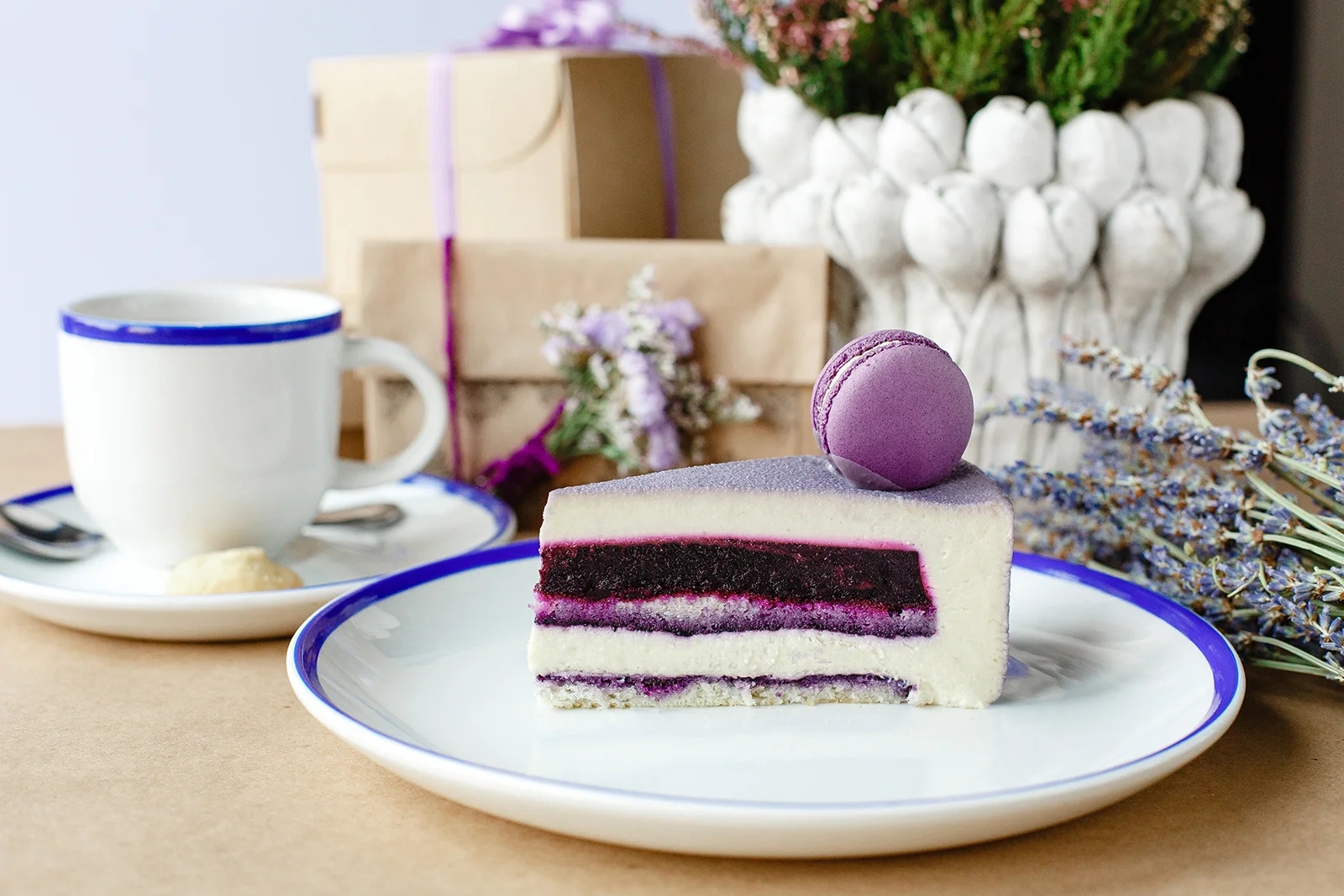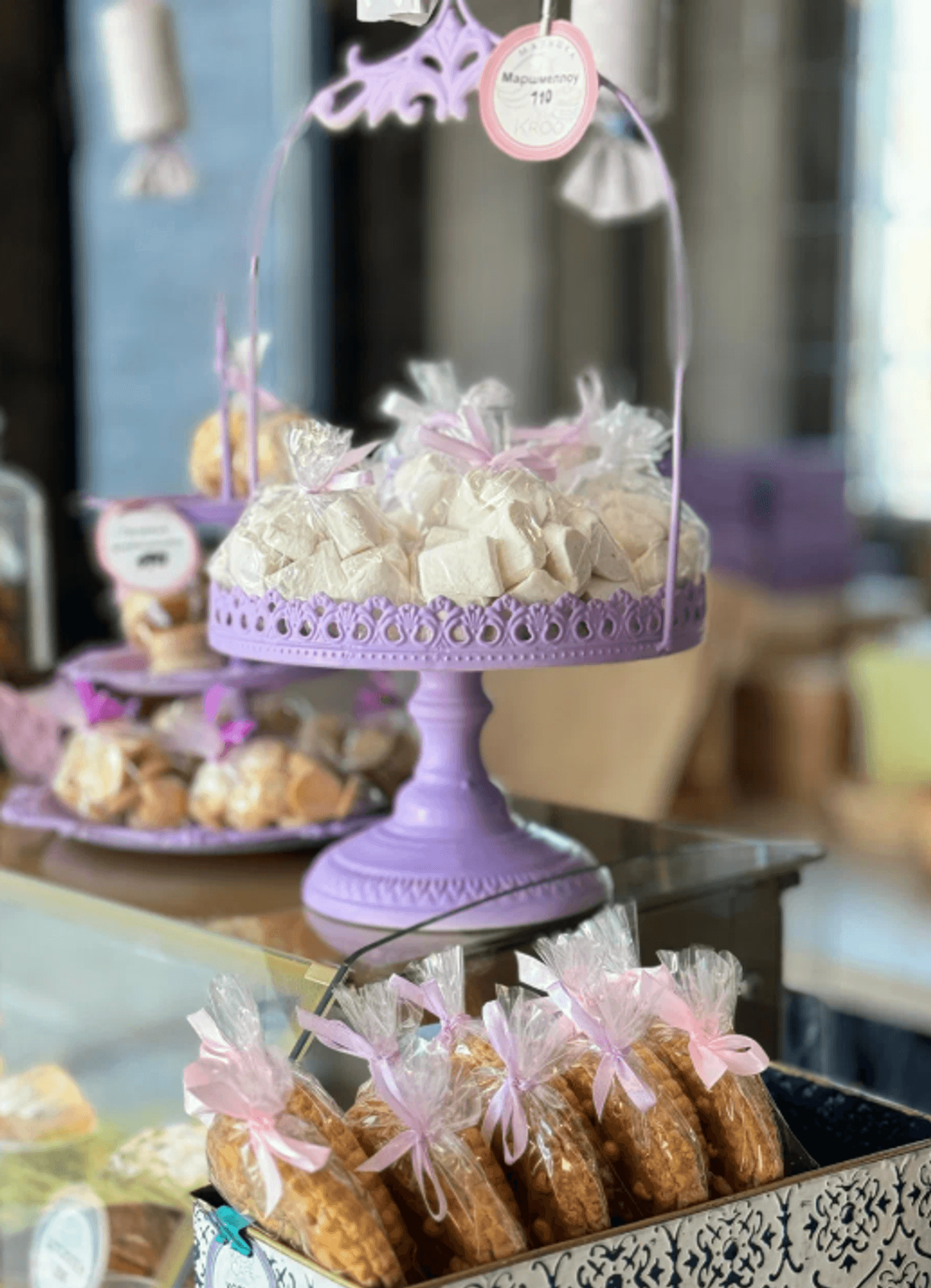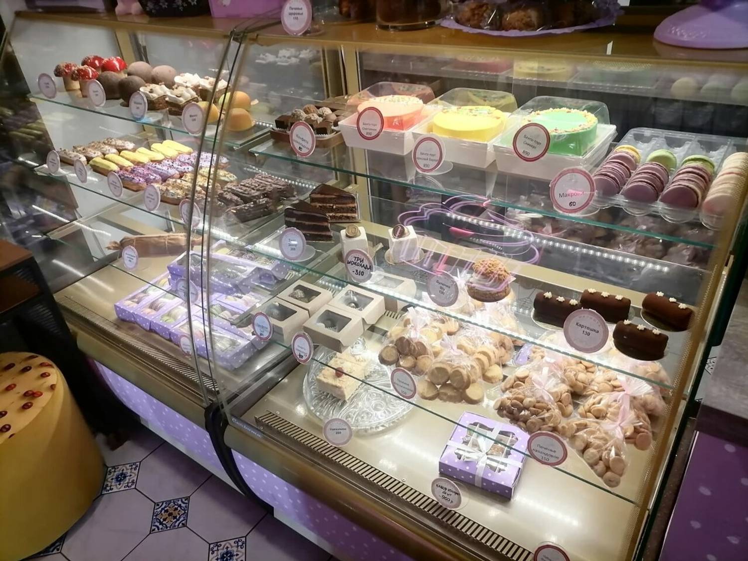 Атмосфера. Интерьер в лиловой гамме с декоративными конфетками, подвешенными к потолку, создает атмосферу сказочной кондитерской. Взгляд сразу привлекают художественно оформленные витрины с десертами, а пастельные акценты в отделке усиливают ощущение уютного лавандового домика.