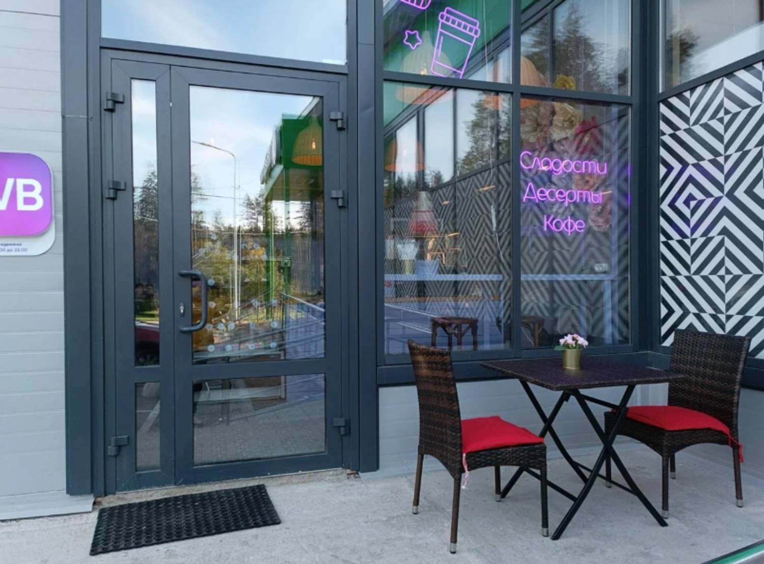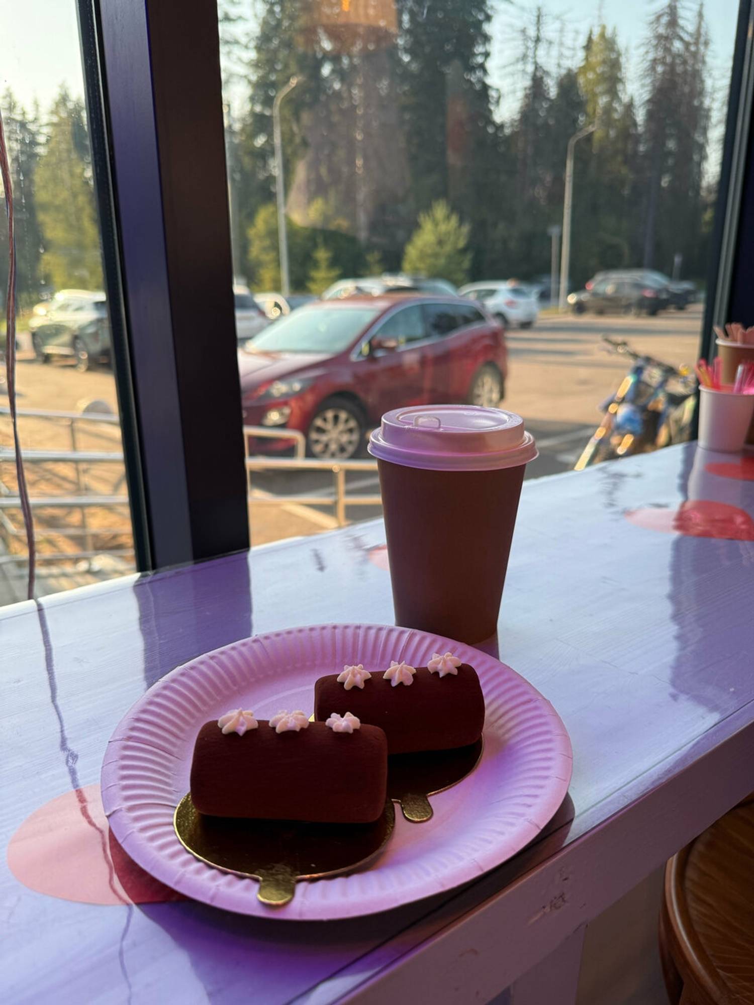 Атмосфера. Пространство оформлено в светлых пастельных тонах с кондитерскими витринами, где десерты выглядят как художественные работы. Элегантная мебель, цветочные акценты и мягкое освещение создают уютную атмосферу, в которой хочется остаться подольше и никуда не спешить, наслаждаясь десертом и кофе.