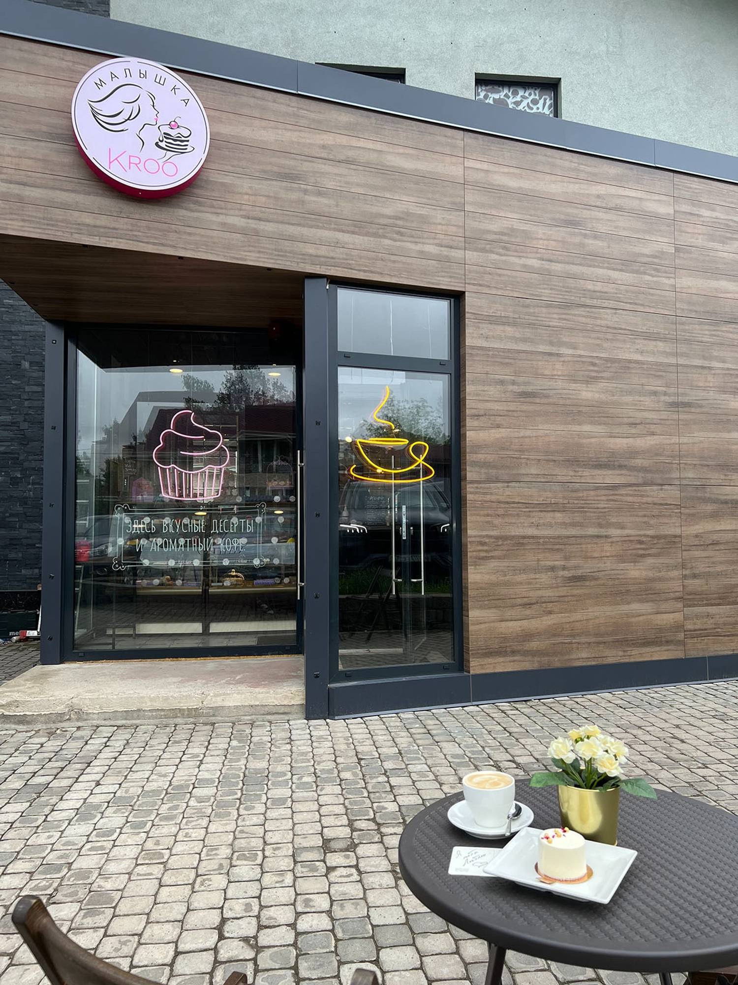 «Малышка KROO» по адресу Цветочная ул., 1, посёлок Ильичёво — кондитерская-кафе от фабрики «KROOfabriqué» с акцентом на авторские десерты.