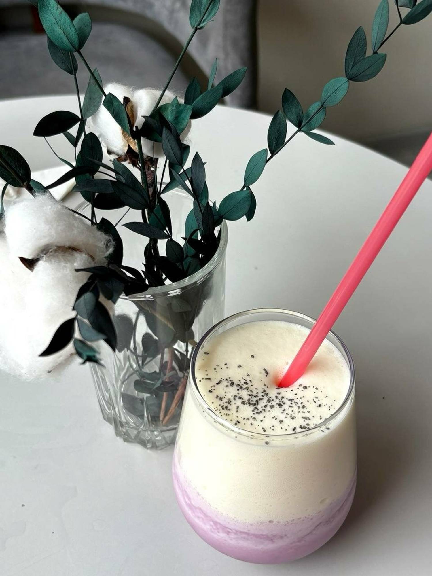Атмосфера. Пространство с современным дизайном и расслабляющей атмосферой: фиолетовые акценты в оформлении отсылают к названию кофейни, а удобные места и мягкое освещение располагают к отдыху.