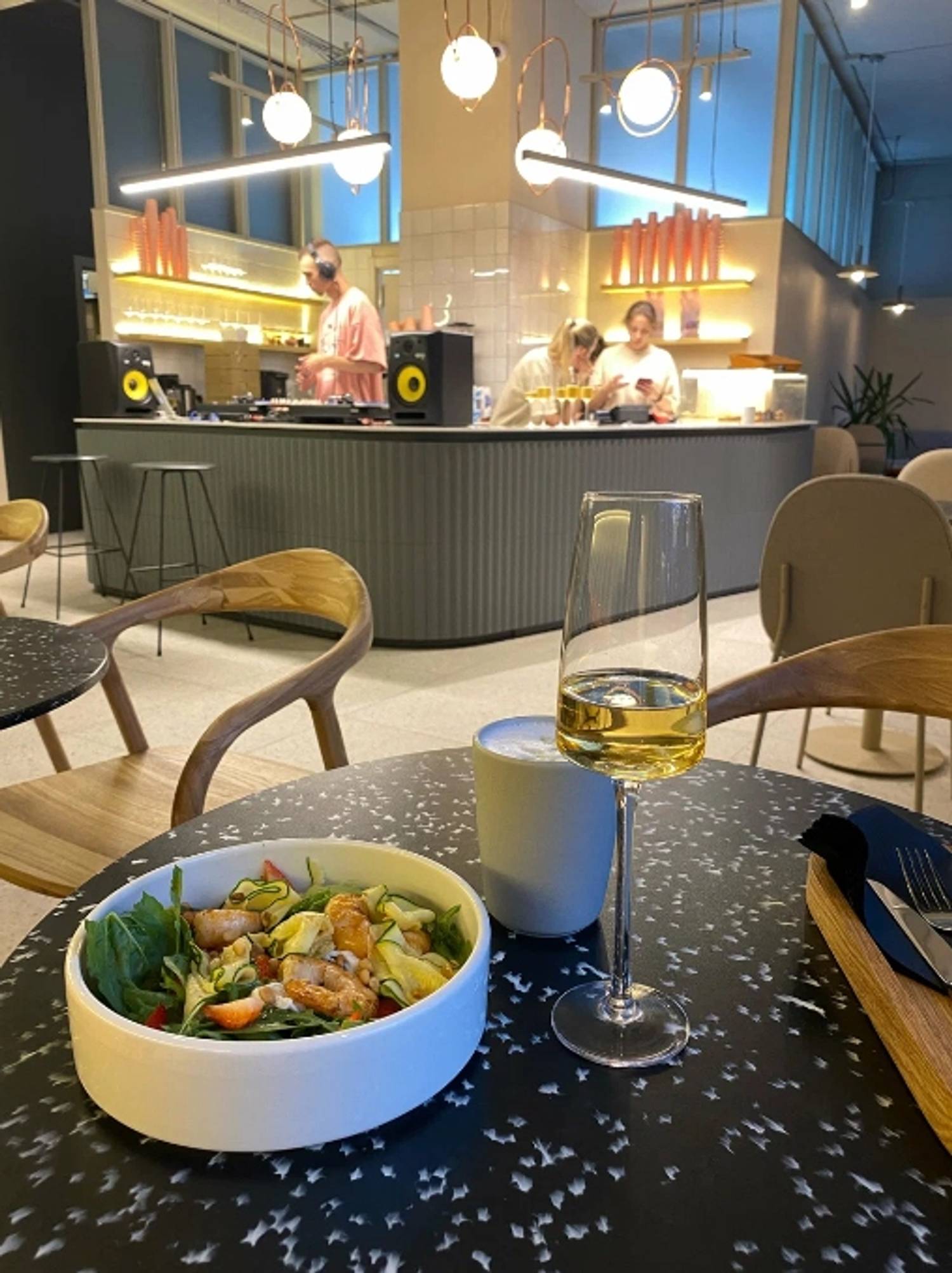 Еда и напитки. Утреннее меню завтраков включает в себя гречу с грибами и хашбраун с лососем и соусом голландез. В течение дня подают супы, выпечку и спешелти-кофе. Основное меню представлено пастой и стейком из форели.