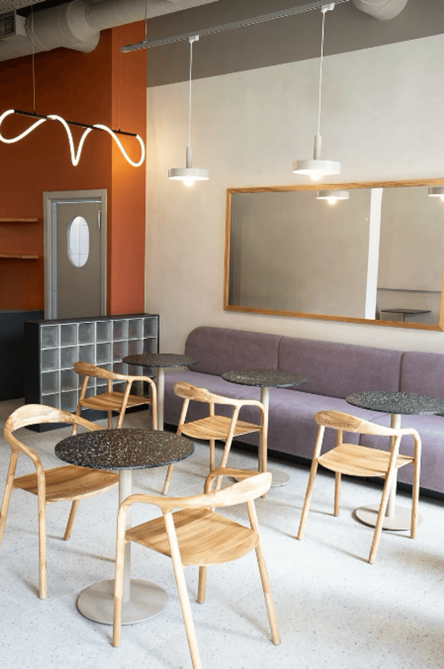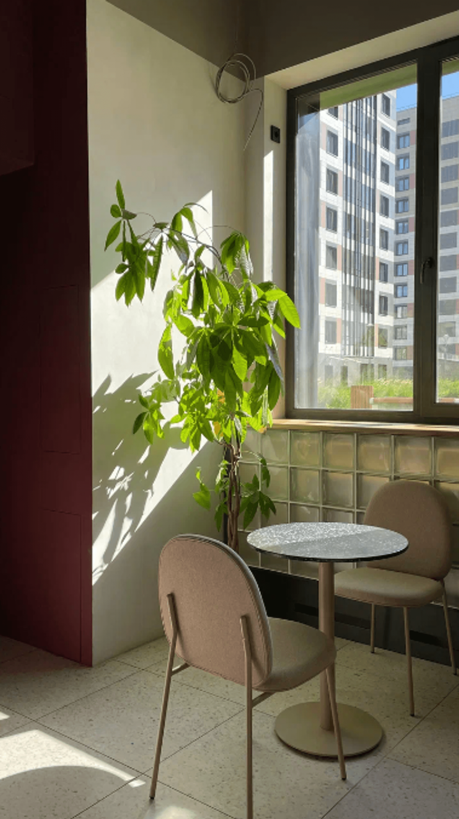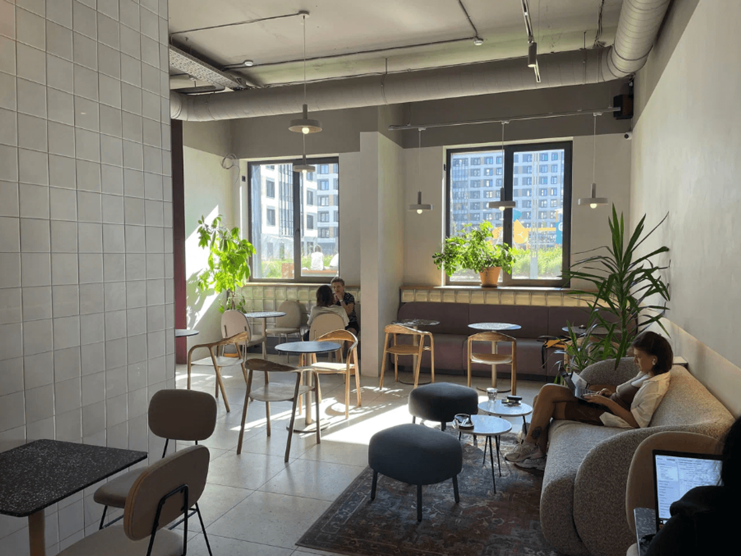 Атмосфера. Современный дизайн с деревянной мебелью, советскими стеклоблоками и подвесными светильниками создает уютную и одновременно необычную атмосферу. Высокие потолки и продуманное зонирование позволяют комфортно проводить время с друзьями или питомцами.