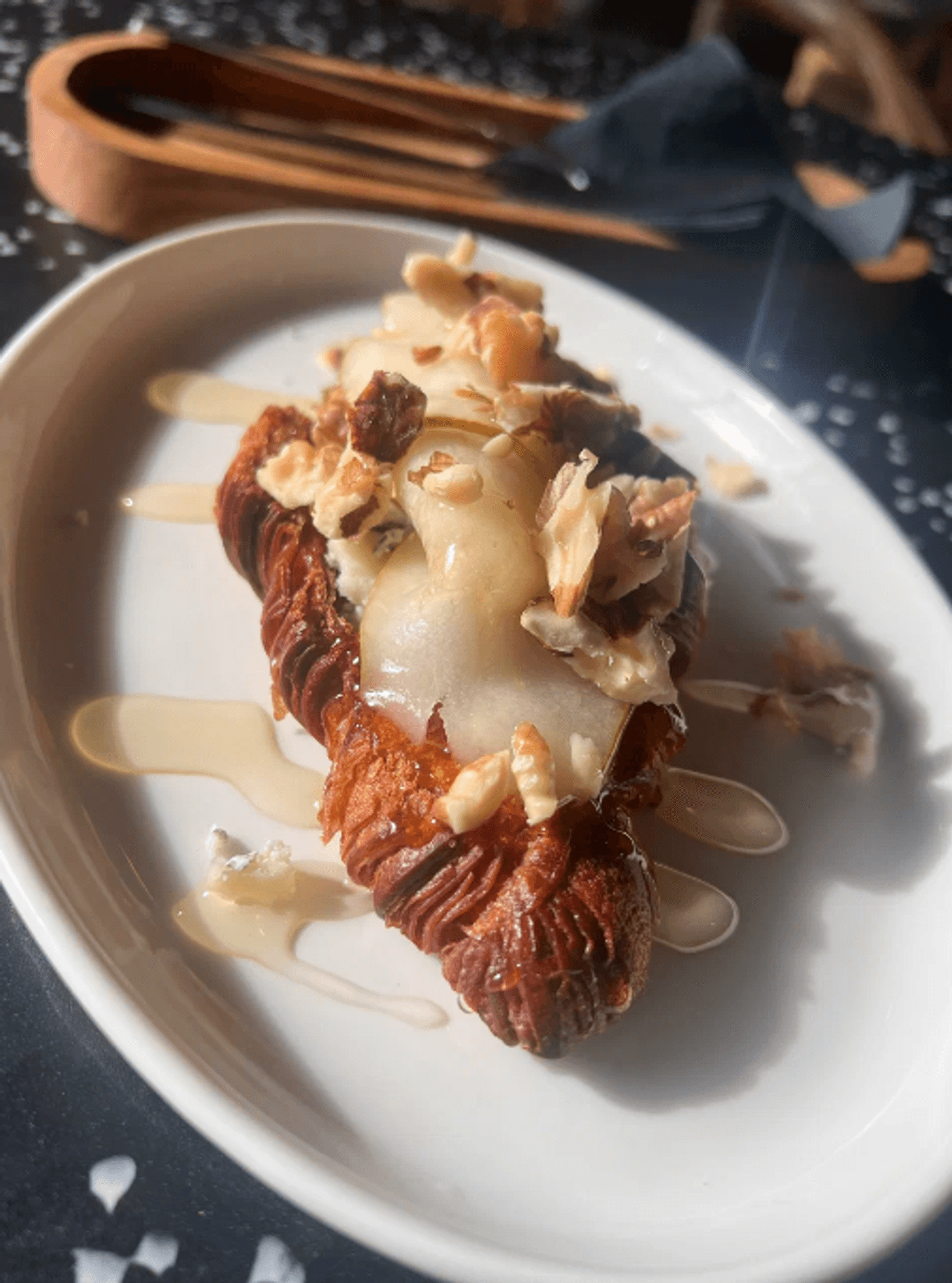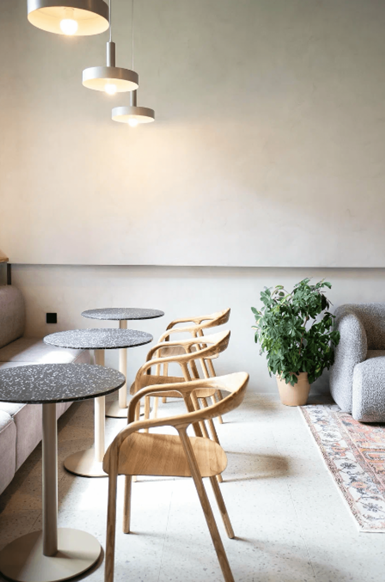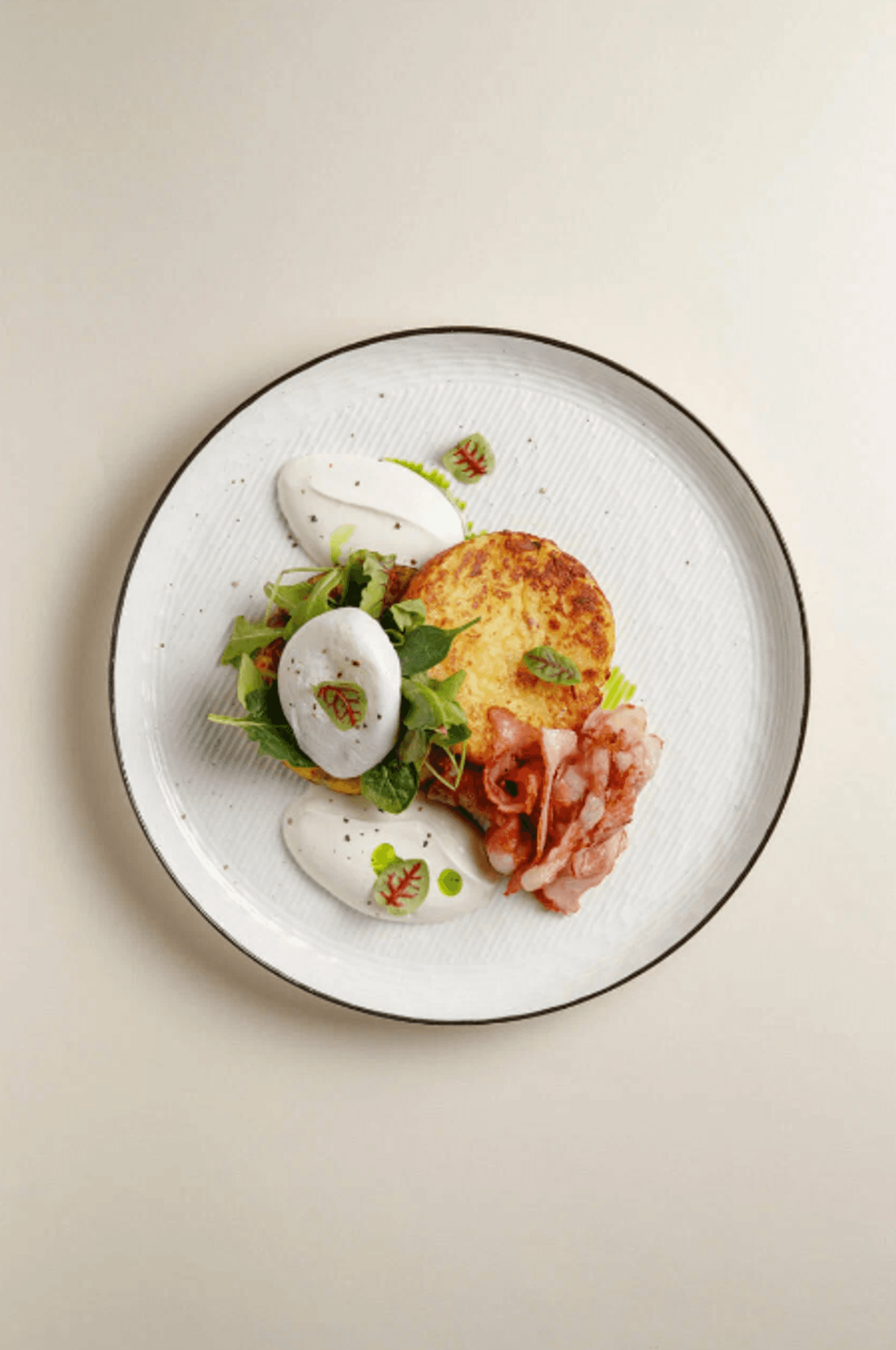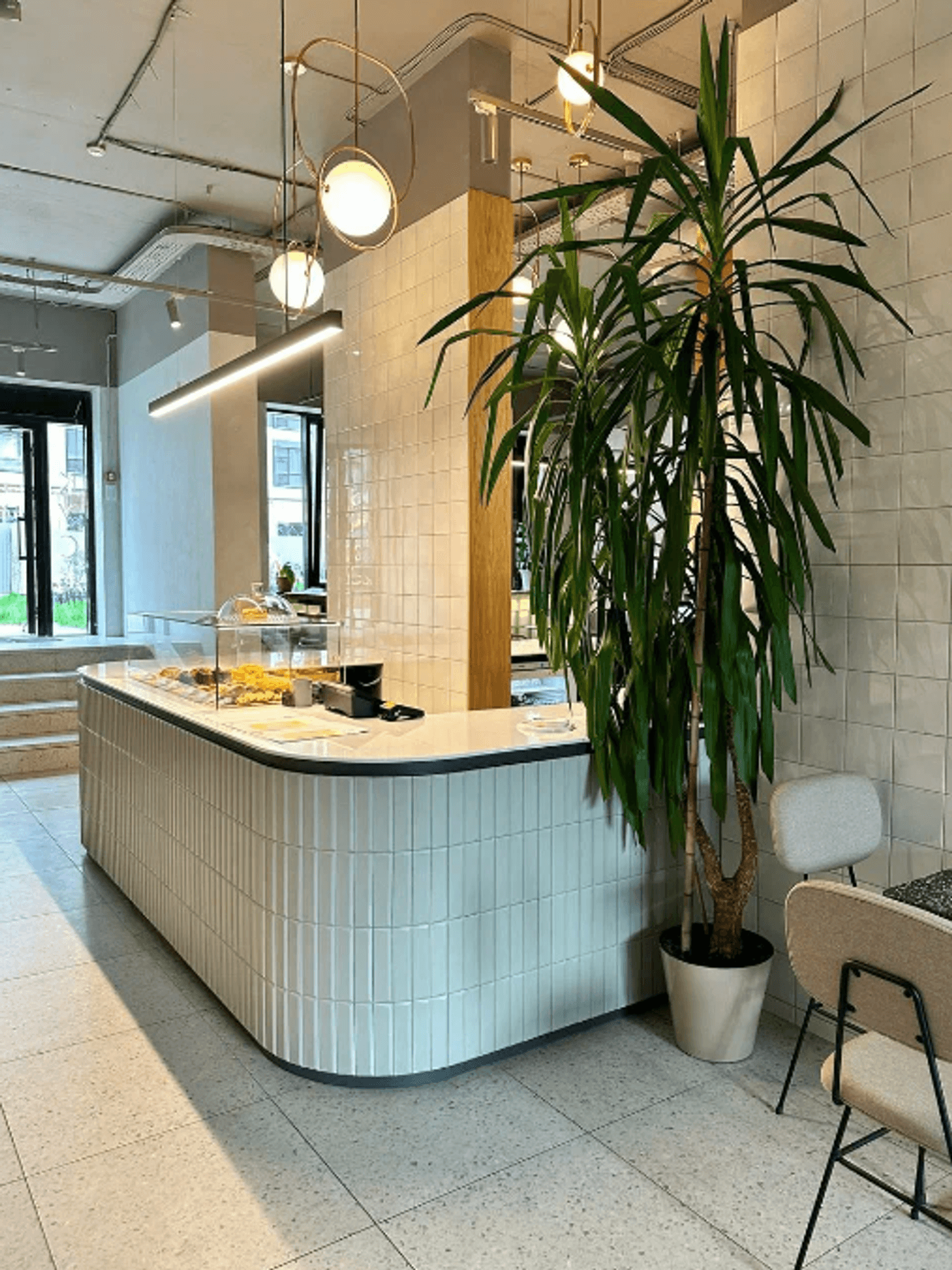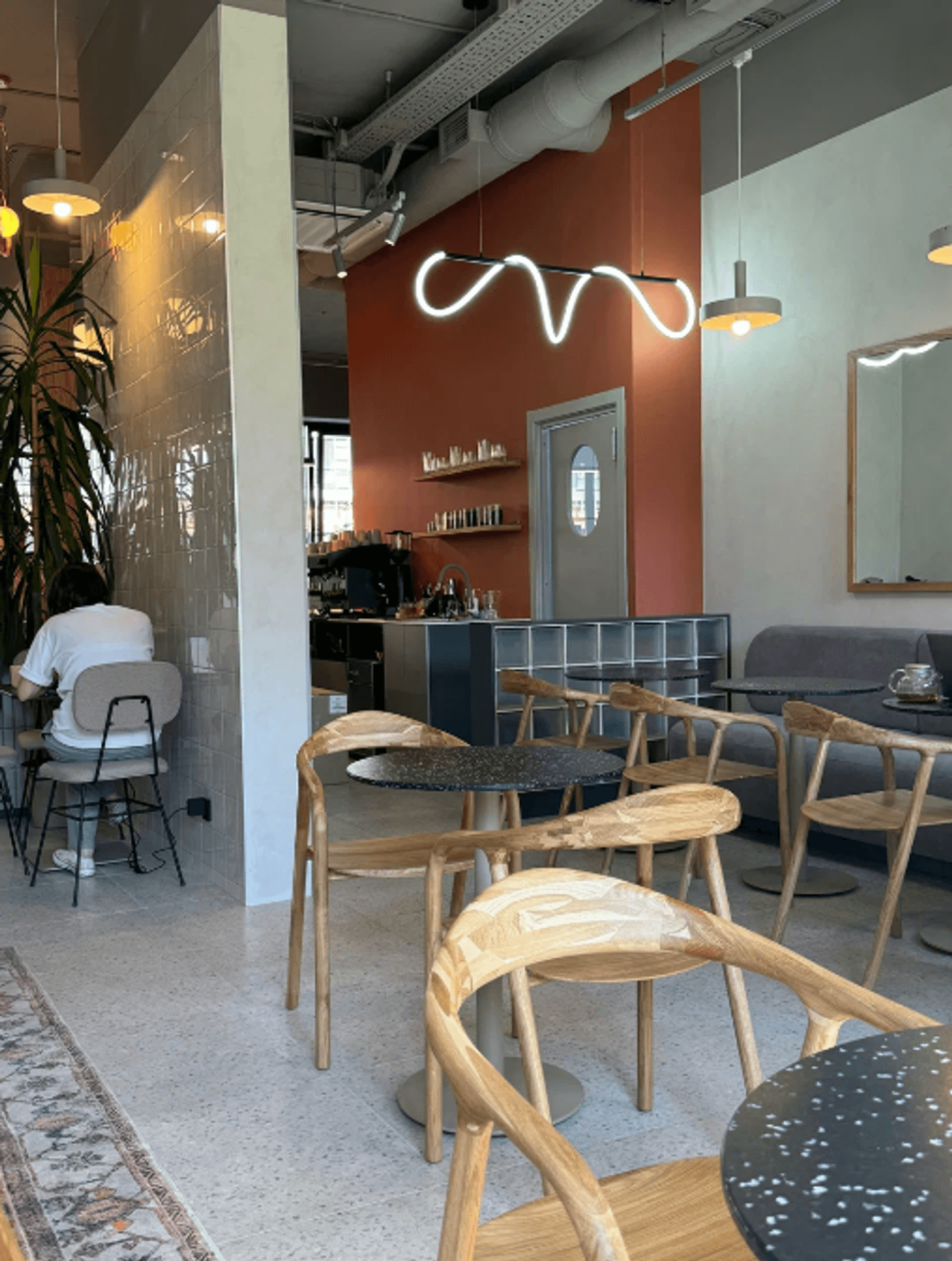 Еда и напитки. В меню завтраков — греча с белыми грибами, хашбраун с беконом и яйцом пашот. Днем подают супы, выпечку, пасту и стейк из форели. Также в любое время здесь подают спешелти-кофе и другие напитки.