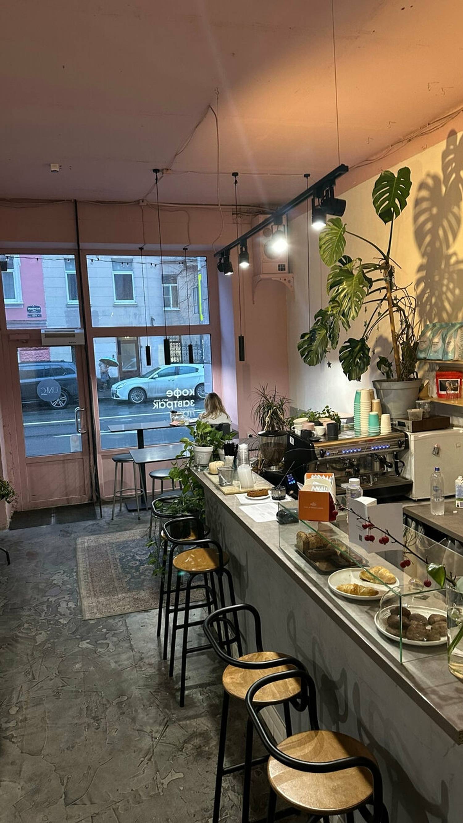 Атмосфера. Пространство в нежных розовых оттенках с панорамными окнами и обилием растений позволяет отвлечься от городской суеты. А мягкие диваны, приглушенное освещение и фоновая музыка располагают к медитативному отдыху, работе за ноутбуком или неспешным беседам.