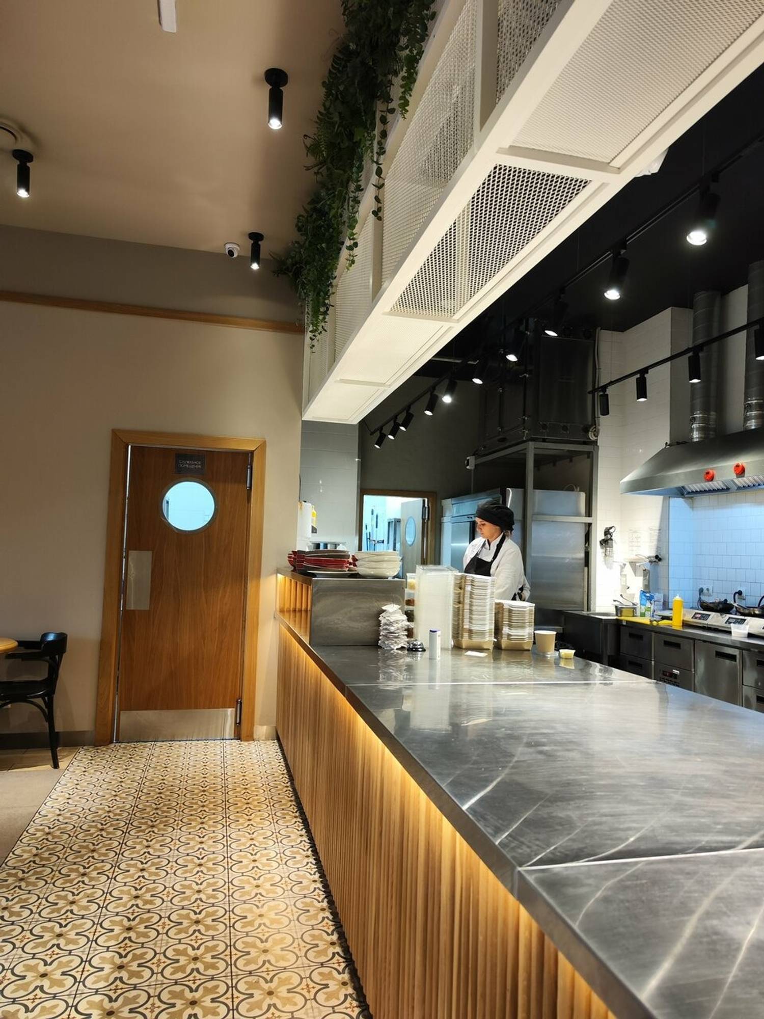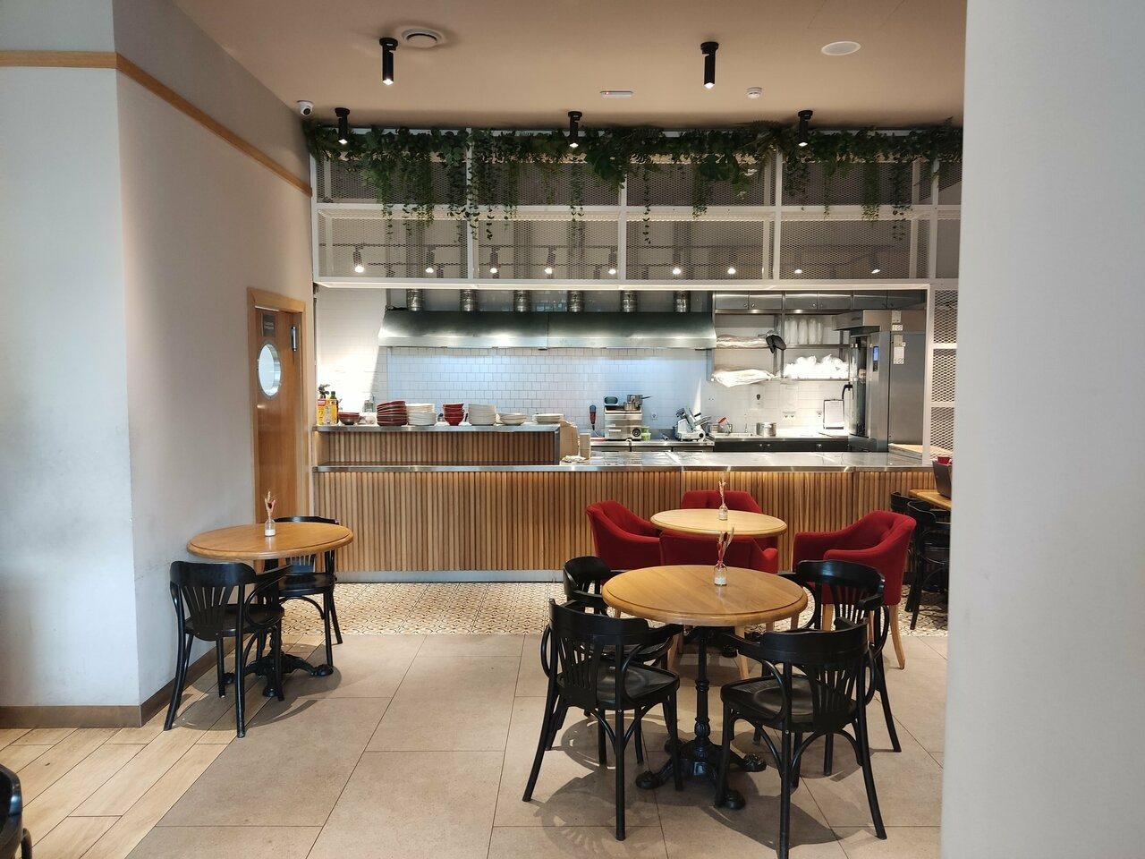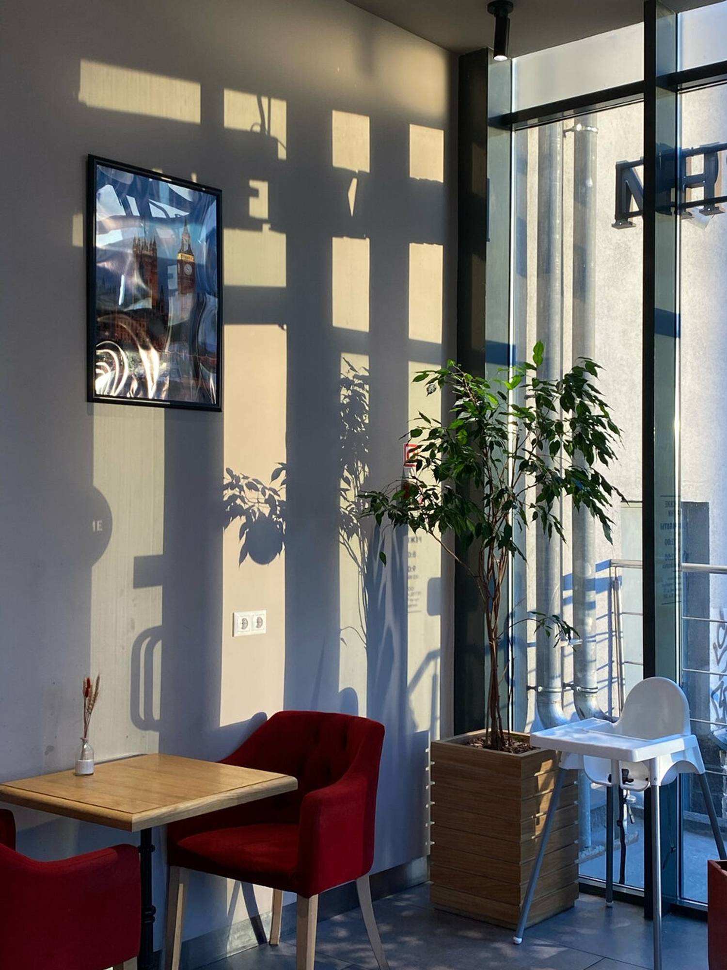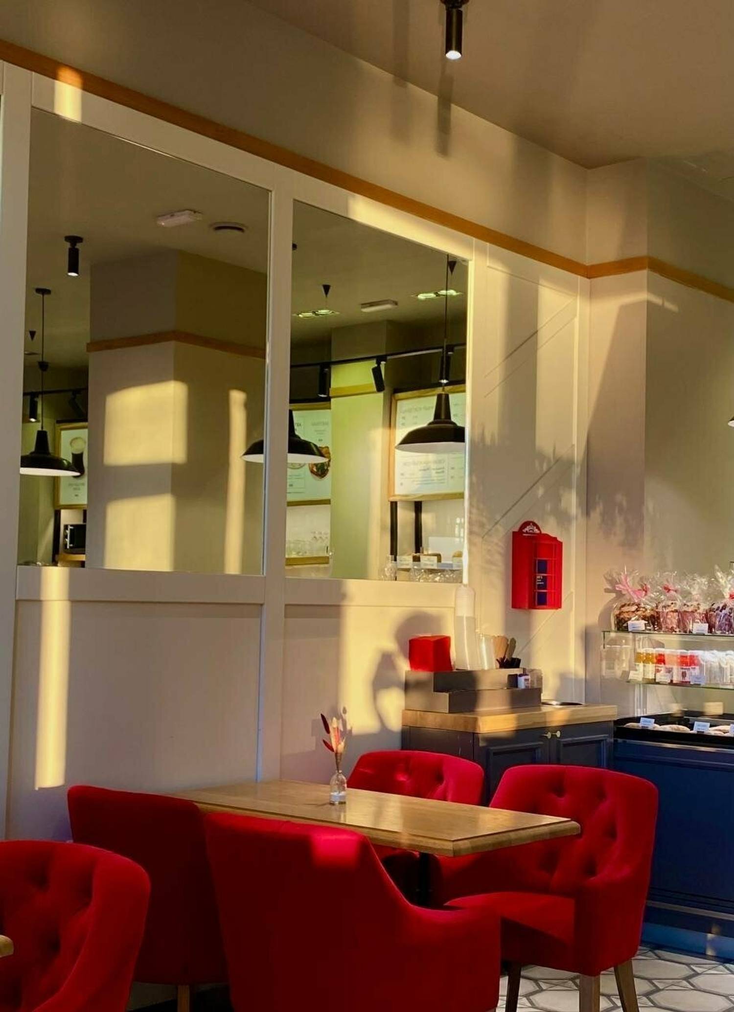 Атмосфера. Центр притяжения здесь — массивная стойка заказов в панельном стиле в рубчик. Интерьер дополняют строгие белые столбы и практичный длинный стол у подоконника. Среди ярких акцентов классические для стиля пекарни красные и черные стулья.