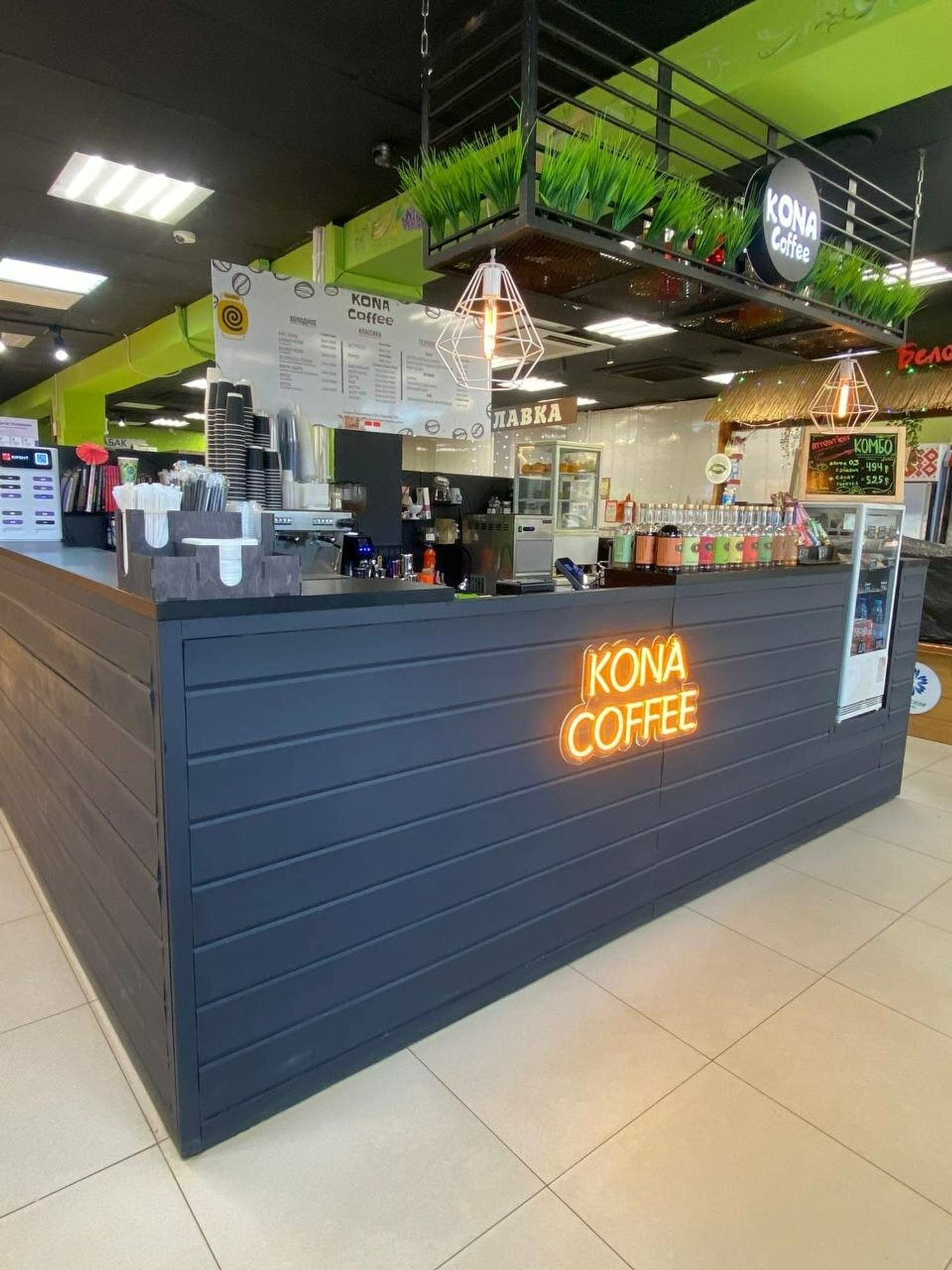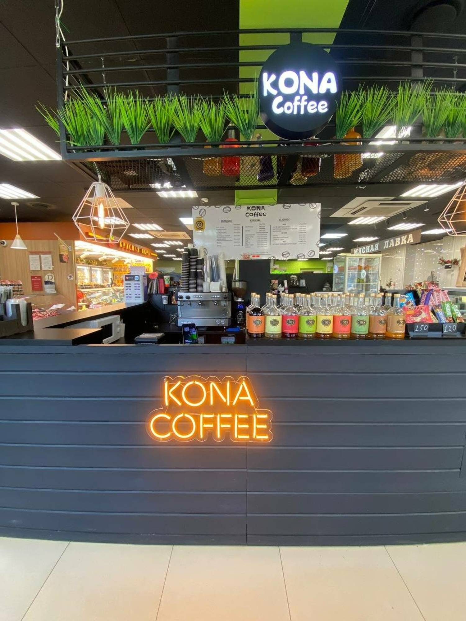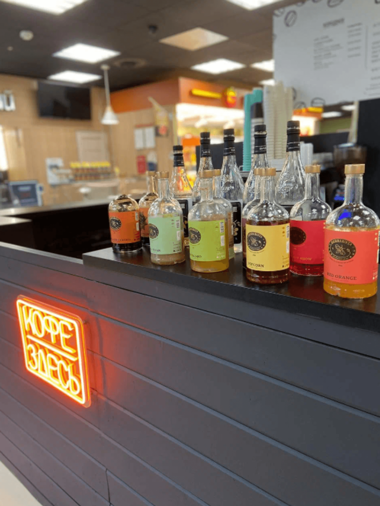 Атмосфера. Минималистичное пространство с серой стойкой заказов. Эту кофейню можно заметить еще издалека за счет оранжевой неоновой вывески на стойке.