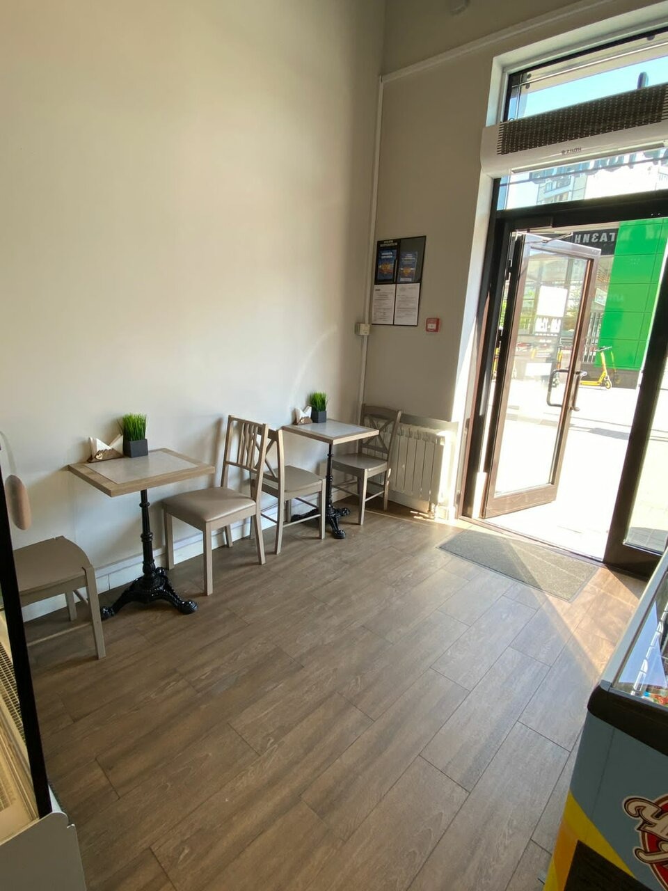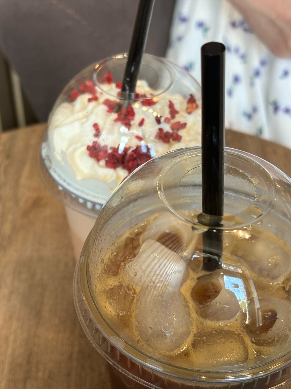 Еда и напитки. В меню — классические кофейные напитки: эспрессо, капучино, латте, а также ягодный смузи, молочный коктейль, айс матча с джусс боллами. К ним можно заказать сэндвичи, готовые блюда в упаковках и разнообразные сладости, например, пончик или тирамису.