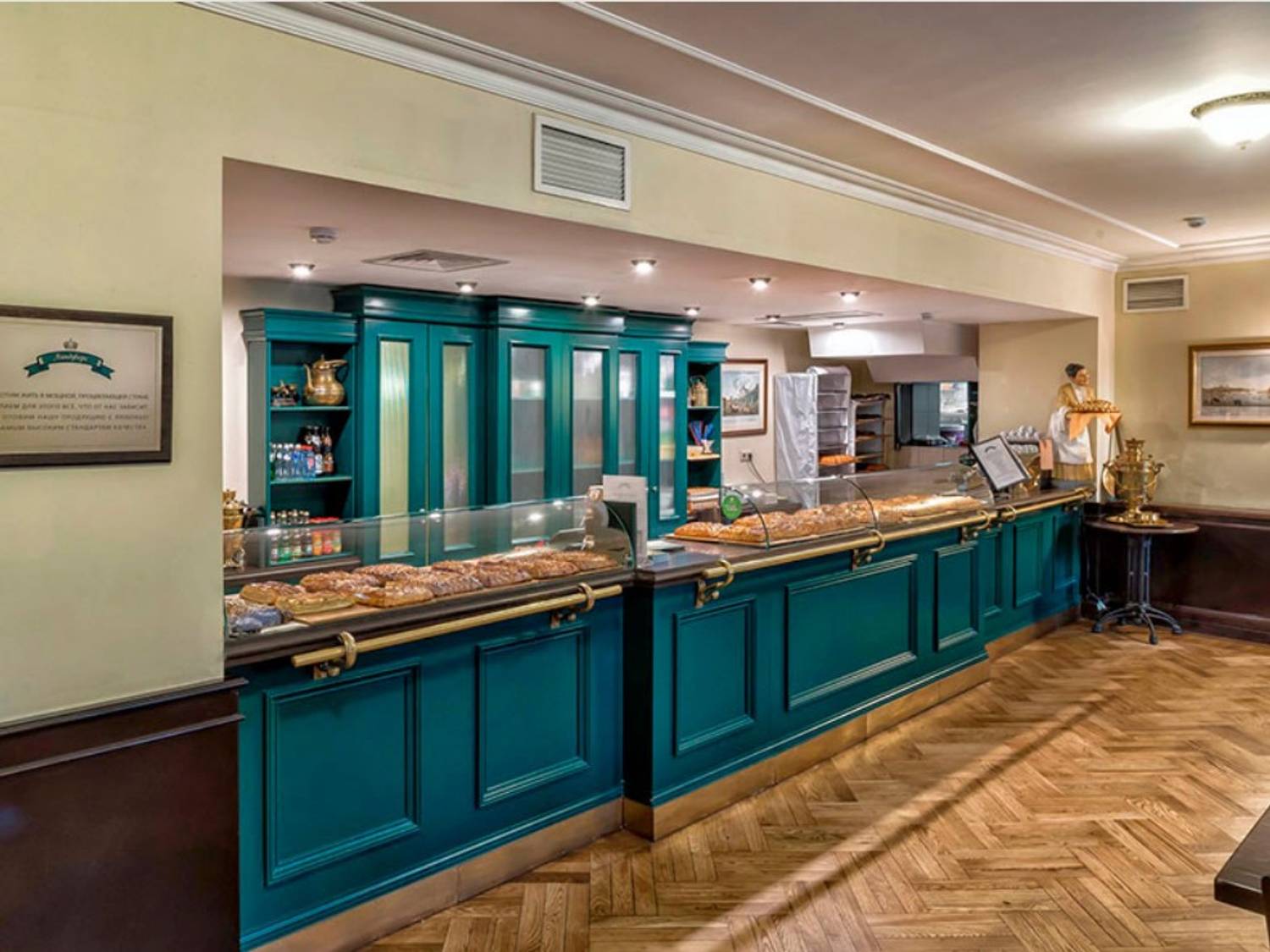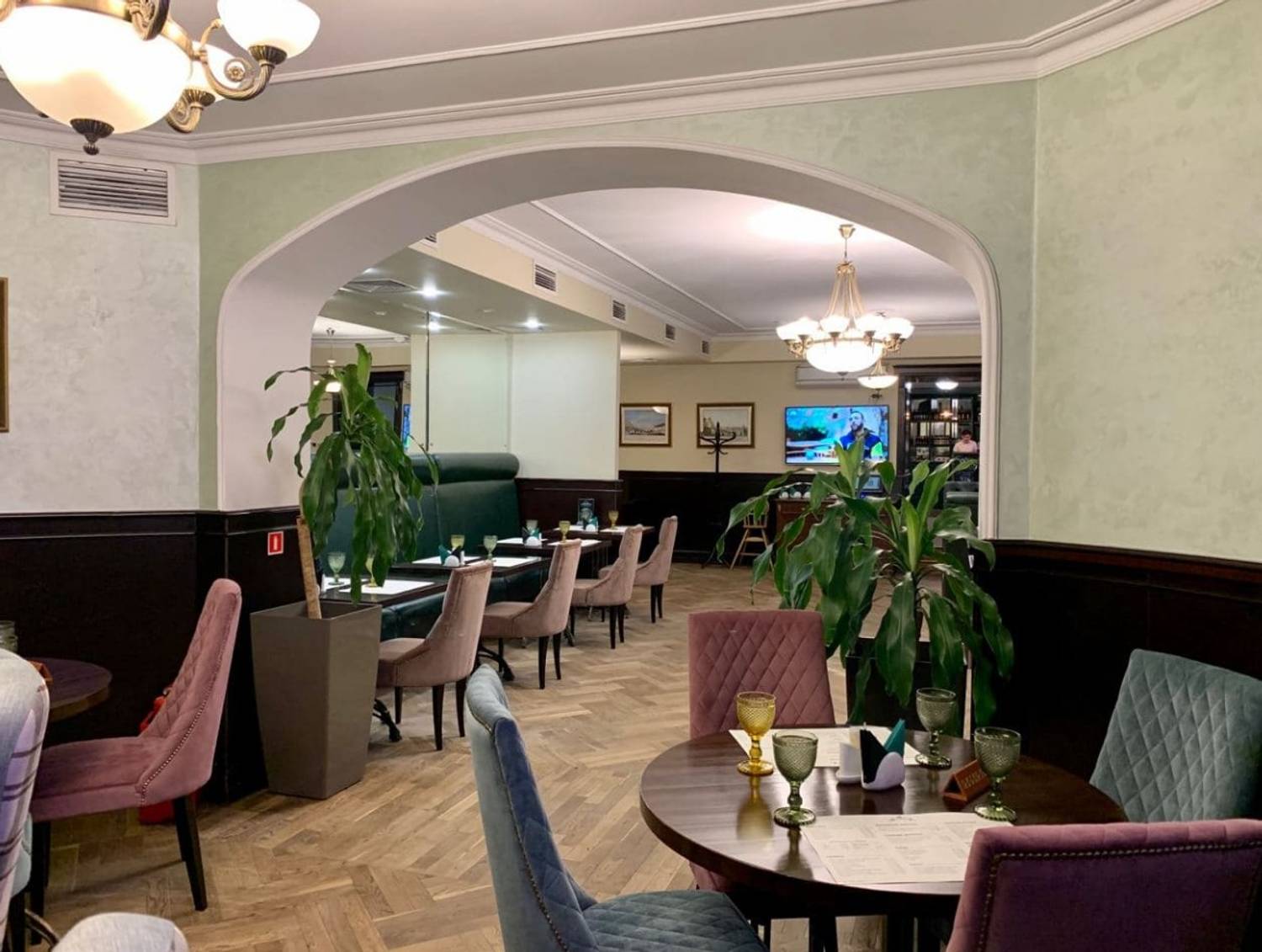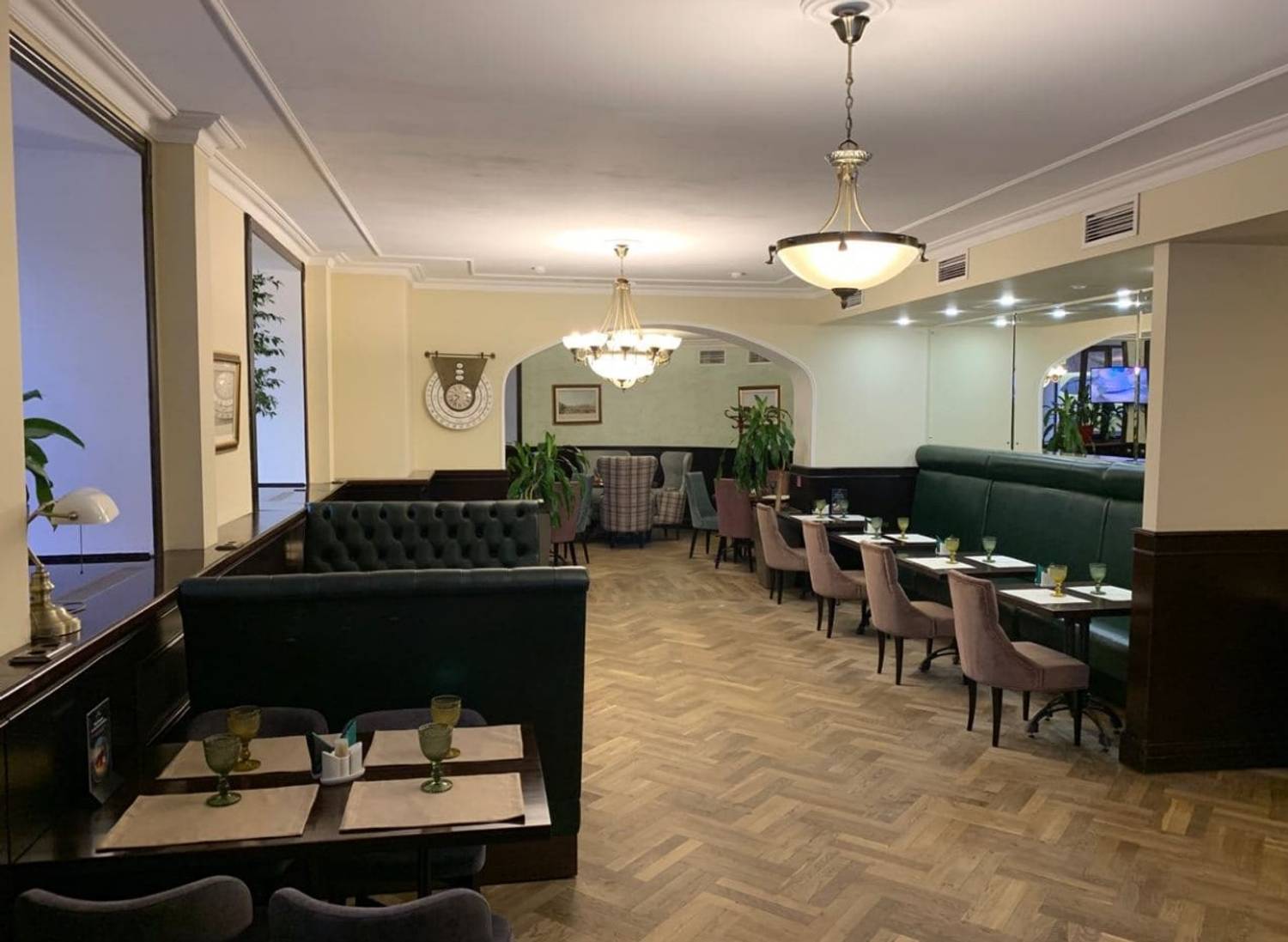 Атмосфера. Зал с паркетными полами и роскошными люстрами сочетает в себе темное дерево с мягкими стульями в розово-серой гамме. Ярко-бирюзовая ретро-стойка с золотыми элементами по традиции становится центром заведения, дополнительно придавая атмосфере ретро-стилистики.