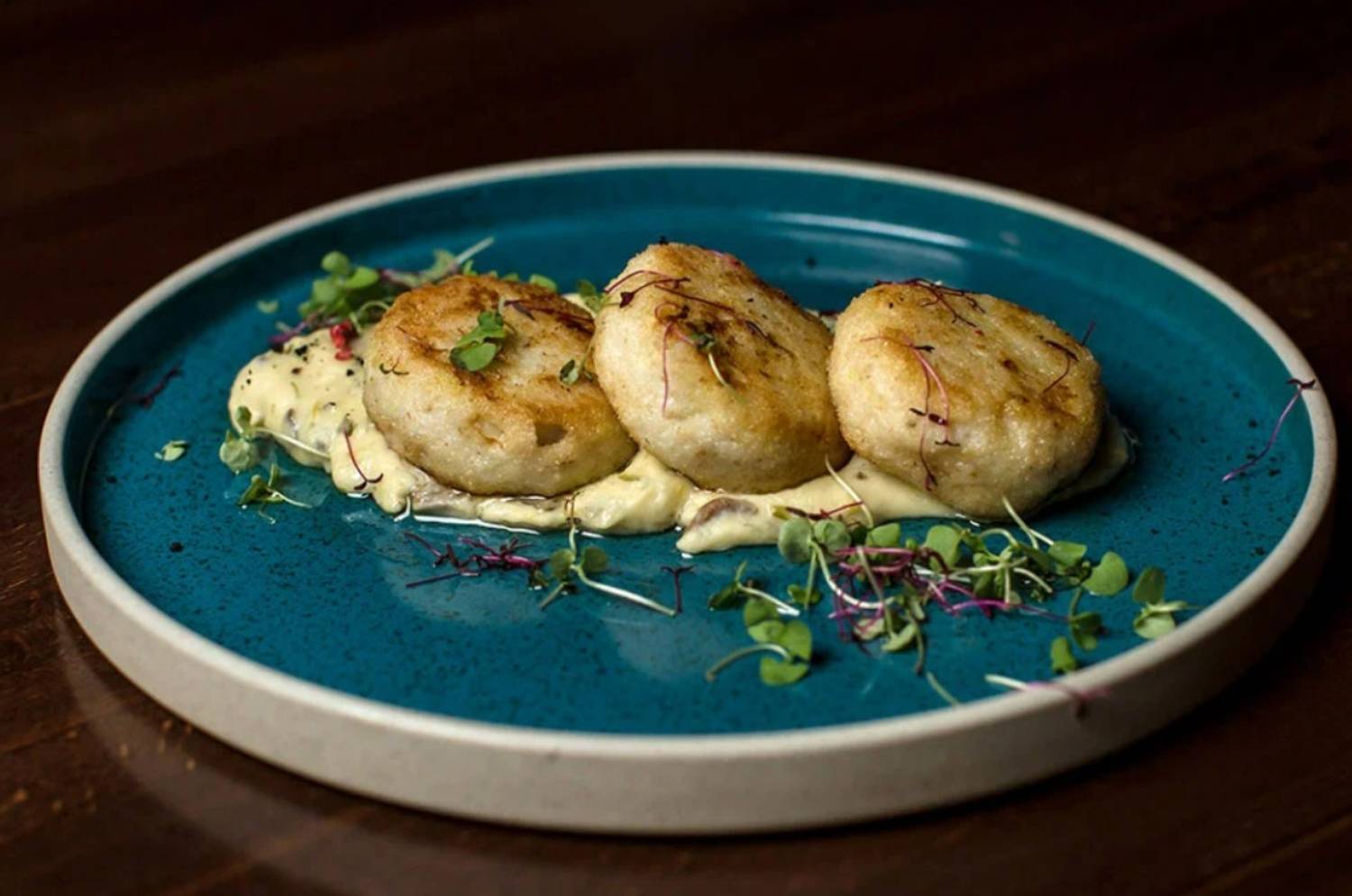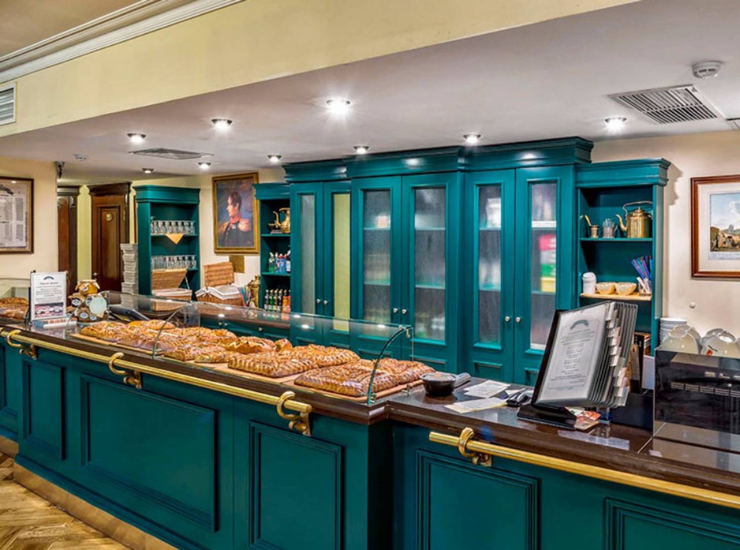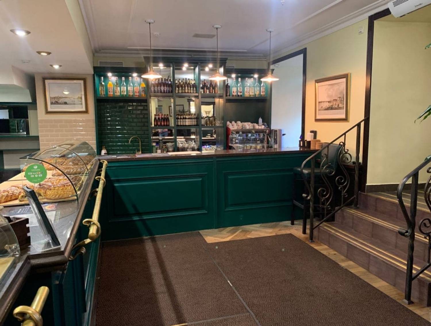 Атмосфера. Зал с паркетными полами и роскошными люстрами сочетает в себе темное дерево с мягкими стульями в розово-серой гамме. Ярко-бирюзовая ретро-стойка с золотыми элементами по традиции становится центром заведения, дополнительно придавая атмосфере ретро-стилистики.