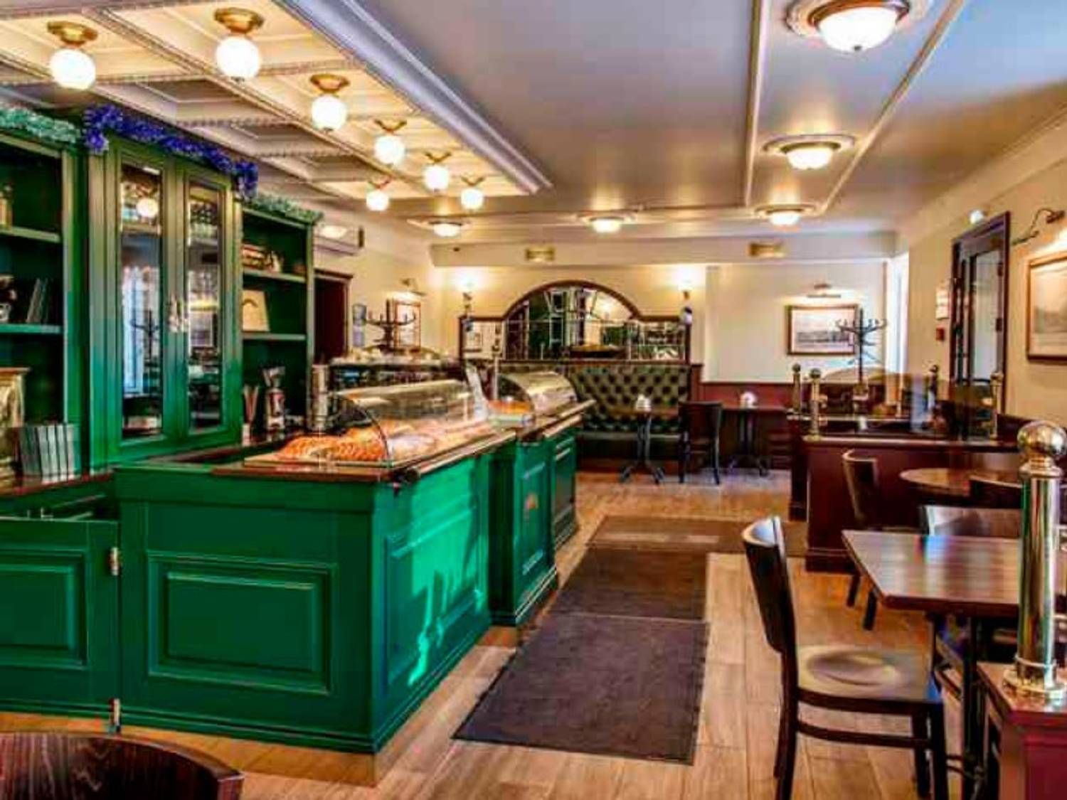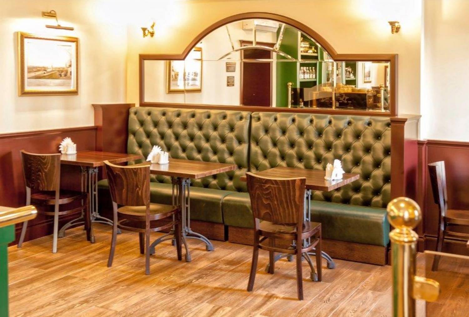 Атмосфера. Темное дерево и изумрудные кожаные диваны здесь гармонируют с ярко-зеленой стойкой, венскими стульями и ретро-деталями. Старинные снимки на стенах задают исторический акцент, а приглушённый свет создает камерную атмосферу.