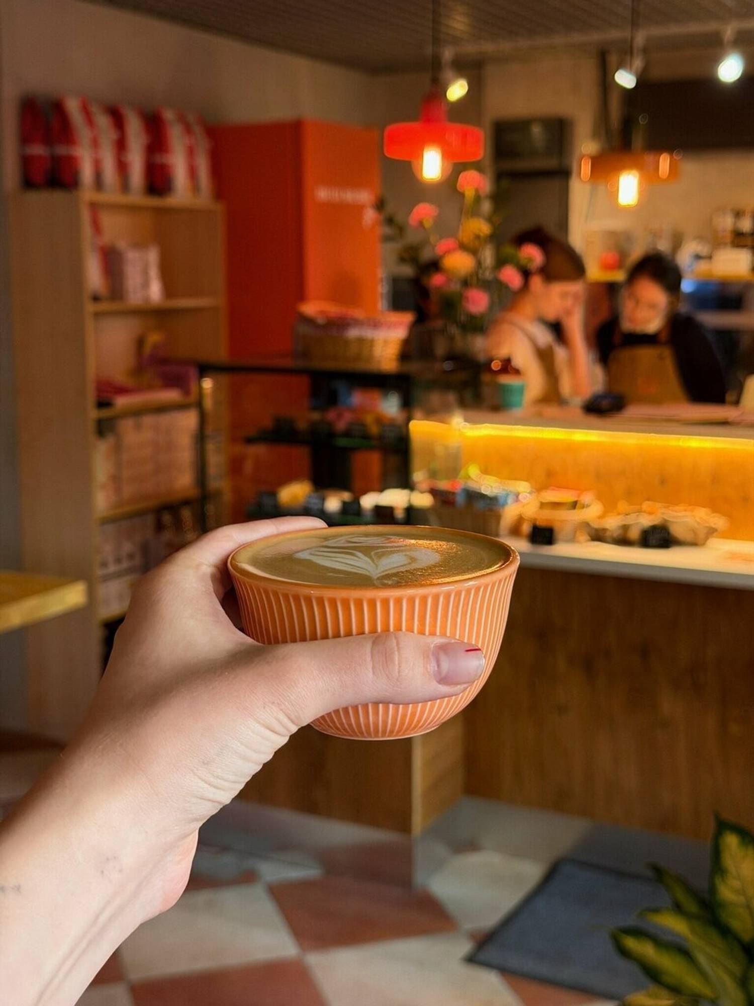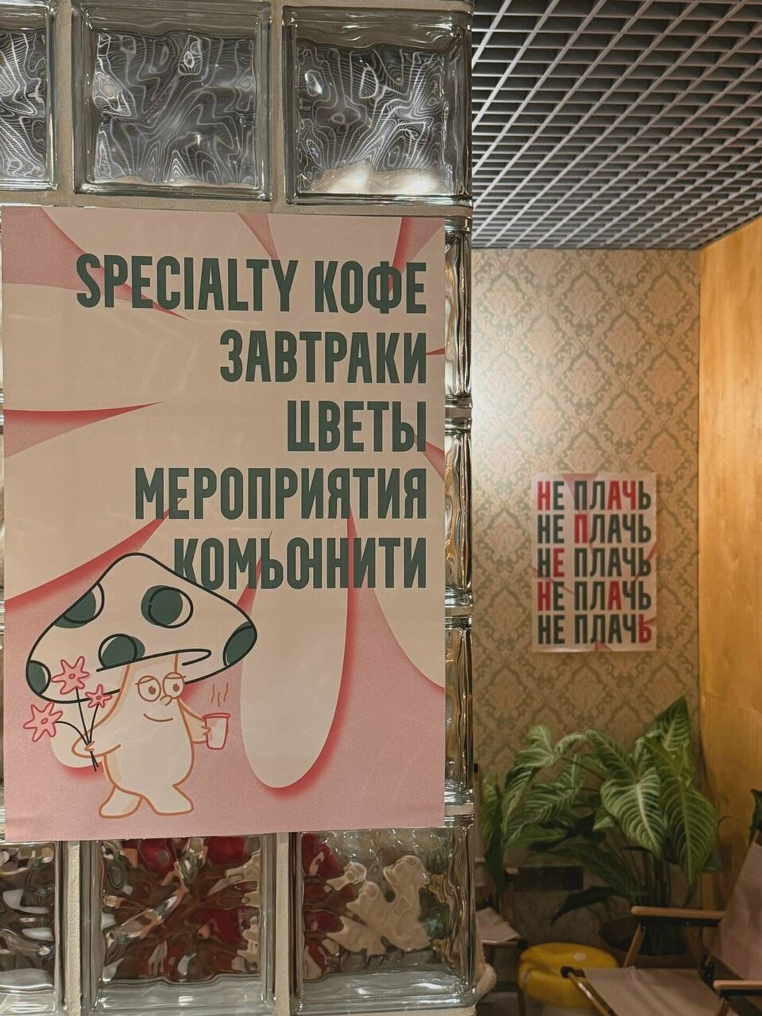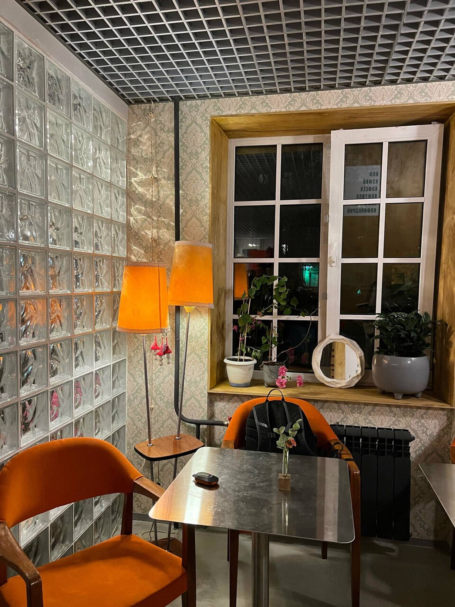 Атмосфера. Пространство настраивает на спокойный и созерцательный лад, позволяя сделать паузу в городском ритме. Интерьер точки сочетает современную практичность с теплыми, сдержанными акцентами, создавая нейтральный фон, который не отвлекает от беседы или работы. Атмосферу дополняют торшеры, кружки ярких цветов и картины в тонких рамах на стенею Здесь можно удобно расположиться за столом с ноутбуком или устроиться в мягком кресле с книгой, не чувствуя спешки.