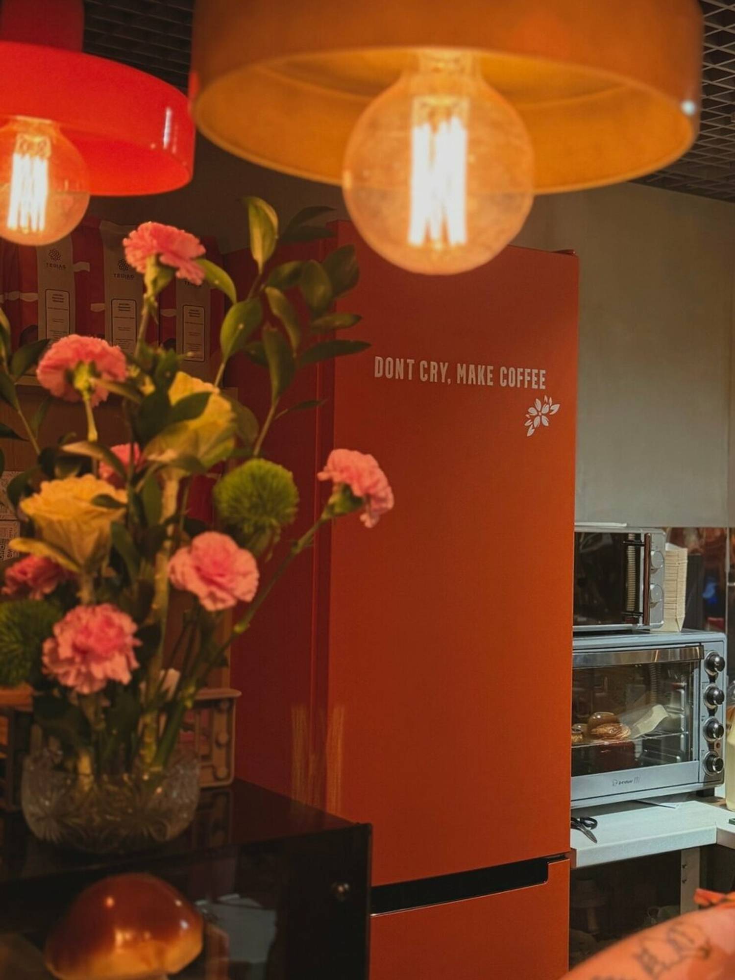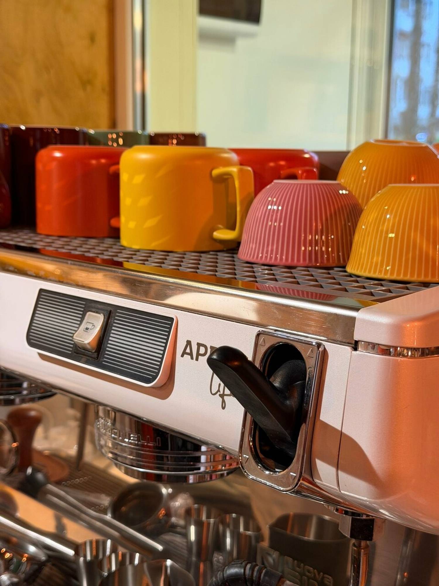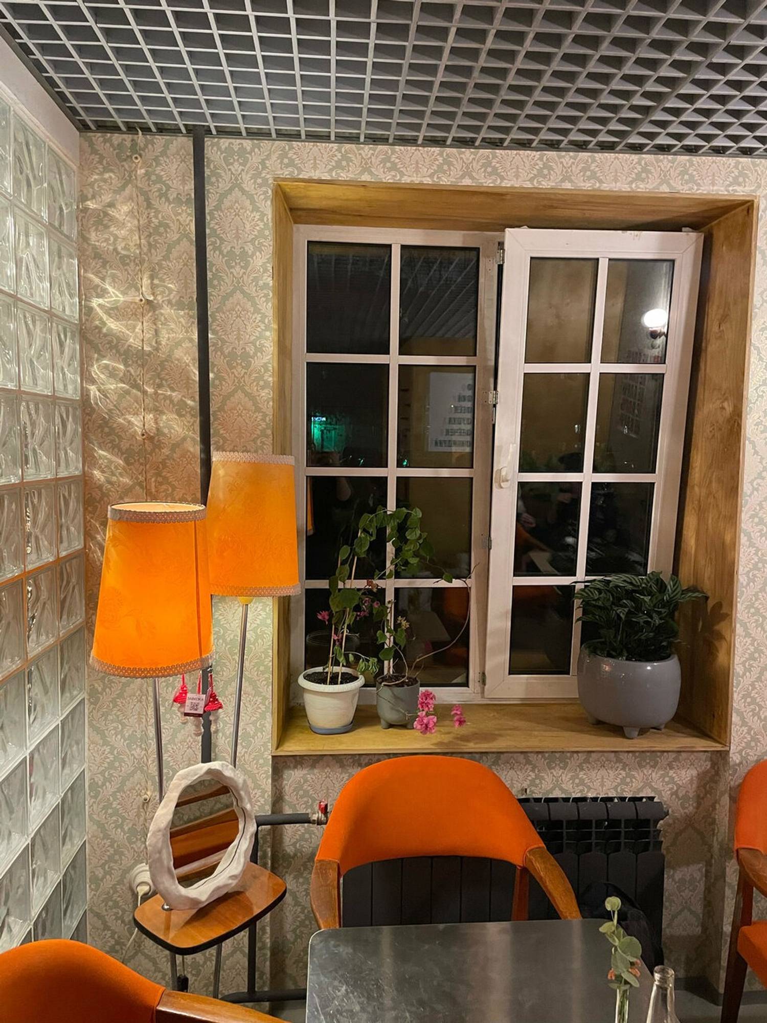 Атмосфера. Пространство настраивает на спокойный и созерцательный лад, позволяя сделать паузу в городском ритме. Интерьер точки сочетает современную практичность с теплыми, сдержанными акцентами, создавая нейтральный фон, который не отвлекает от беседы или работы. Атмосферу дополняют торшеры, кружки ярких цветов и картины в тонких рамах на стенею Здесь можно удобно расположиться за столом с ноутбуком или устроиться в мягком кресле с книгой, не чувствуя спешки.