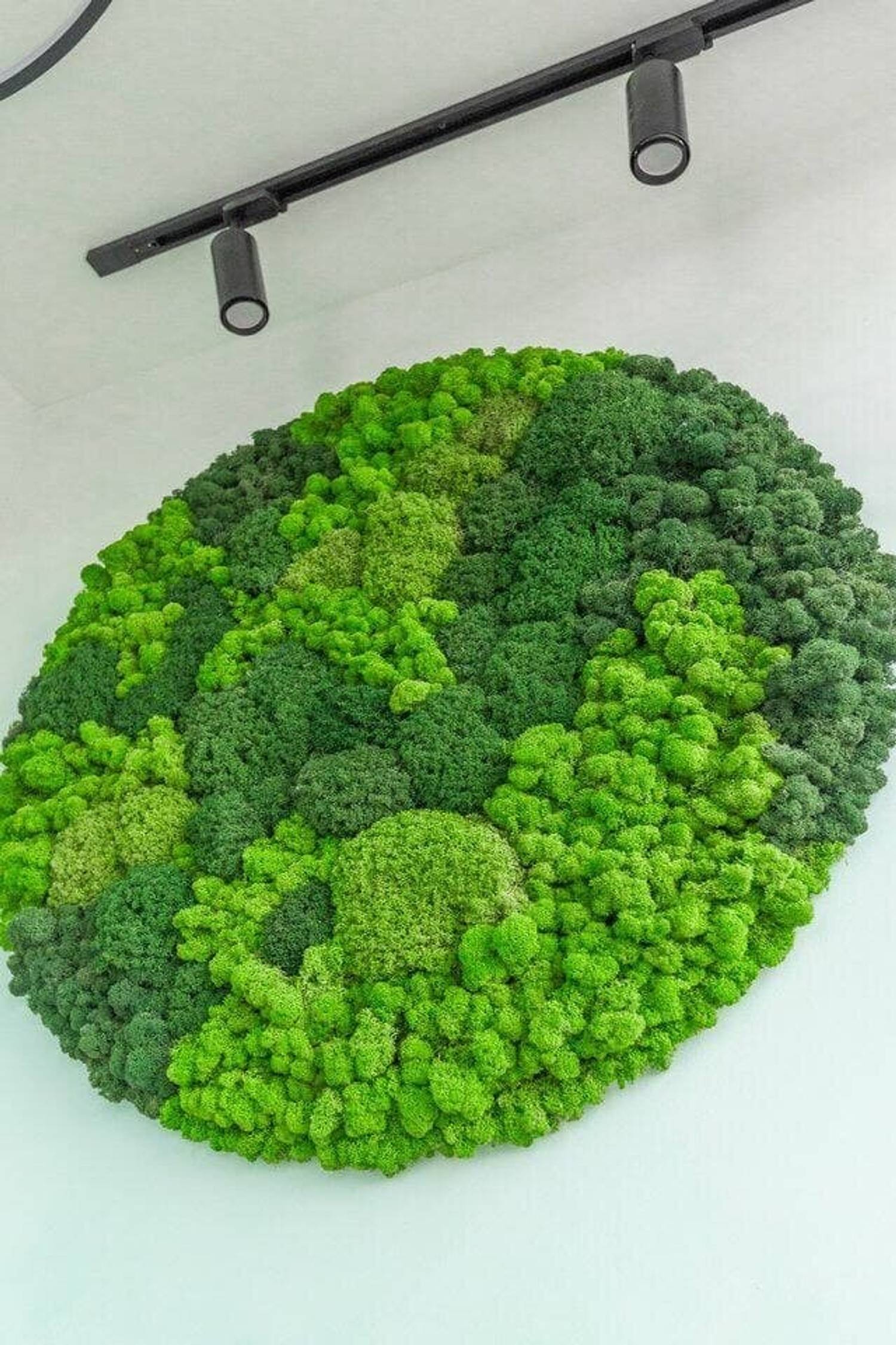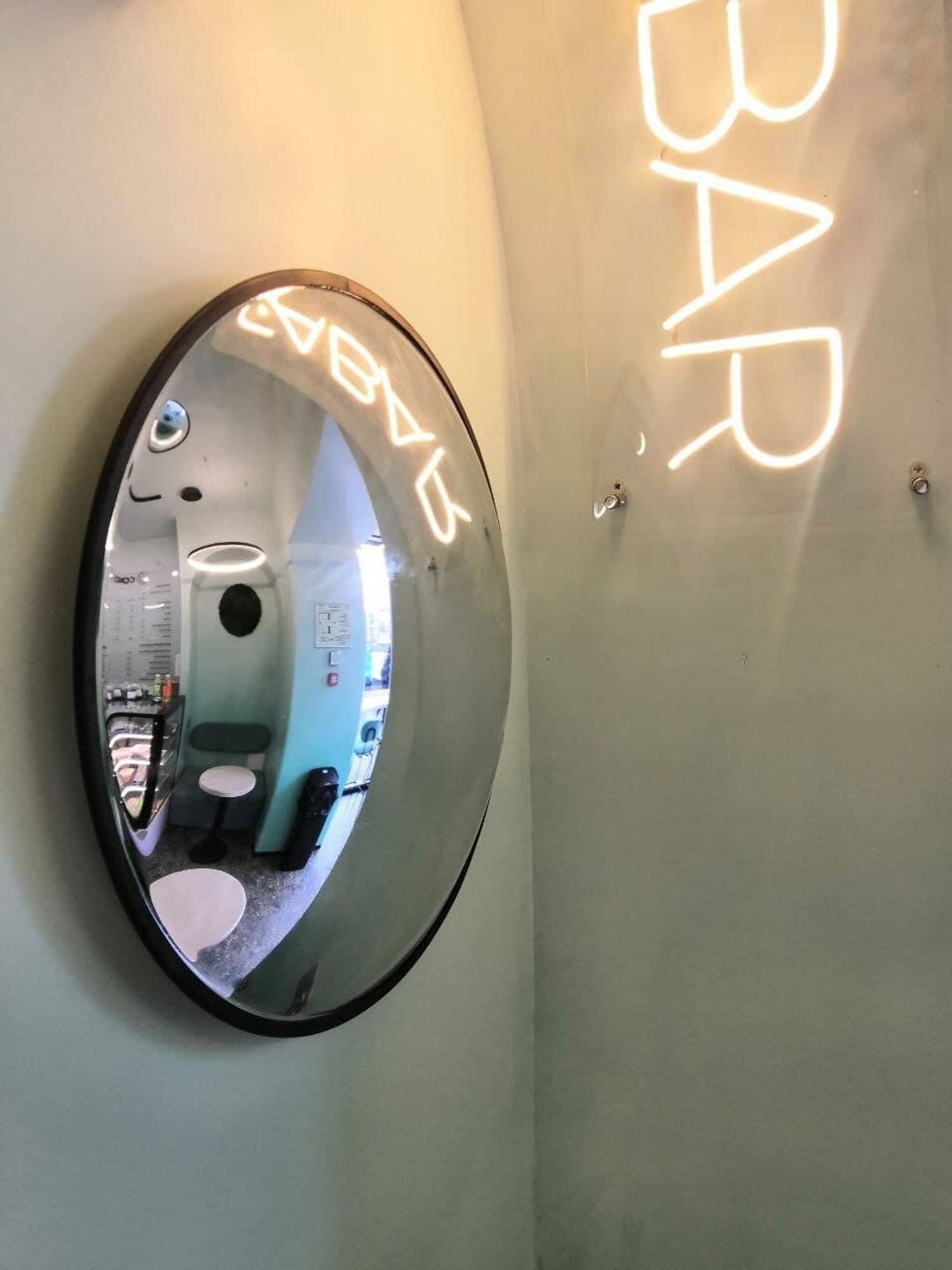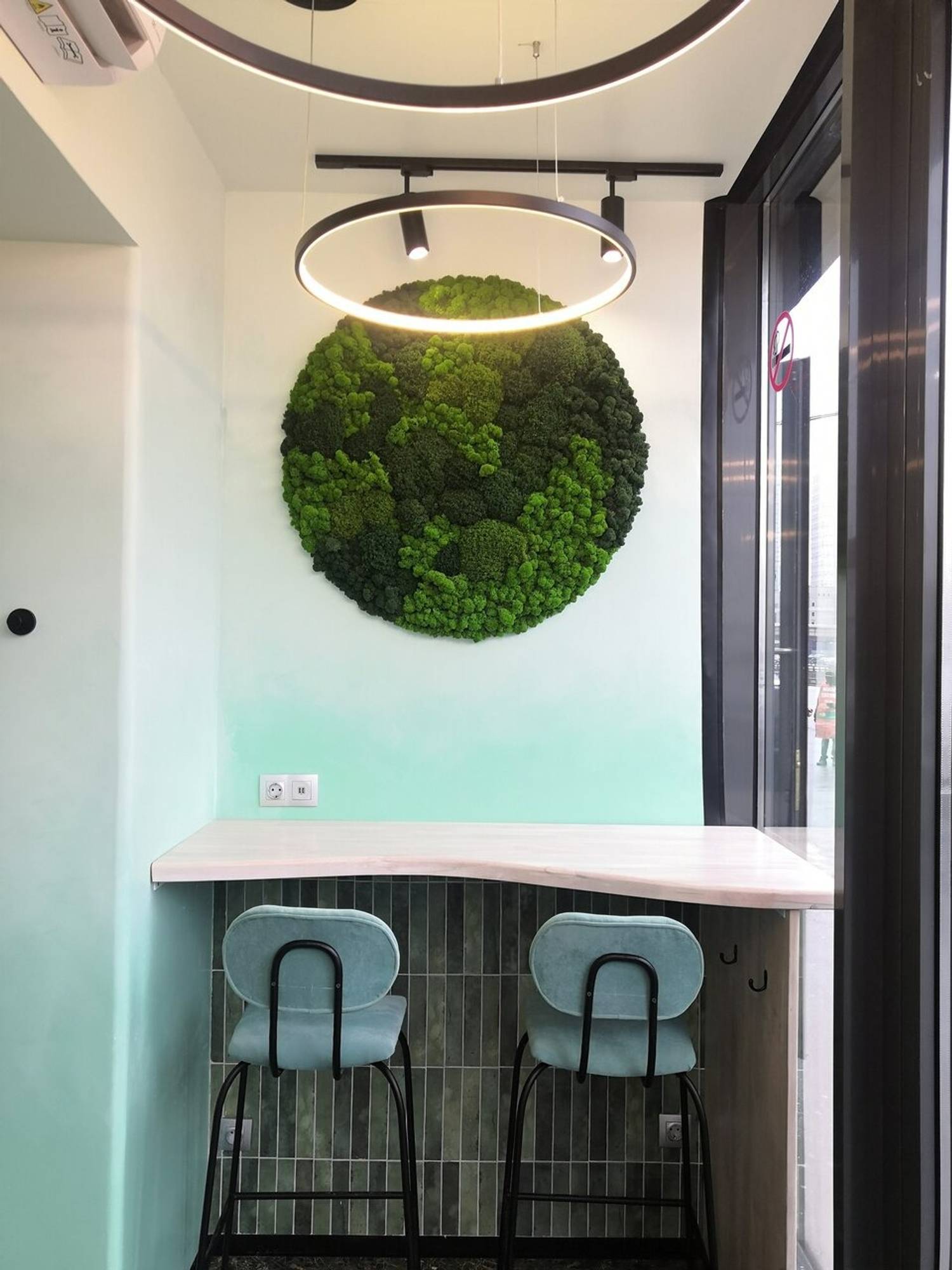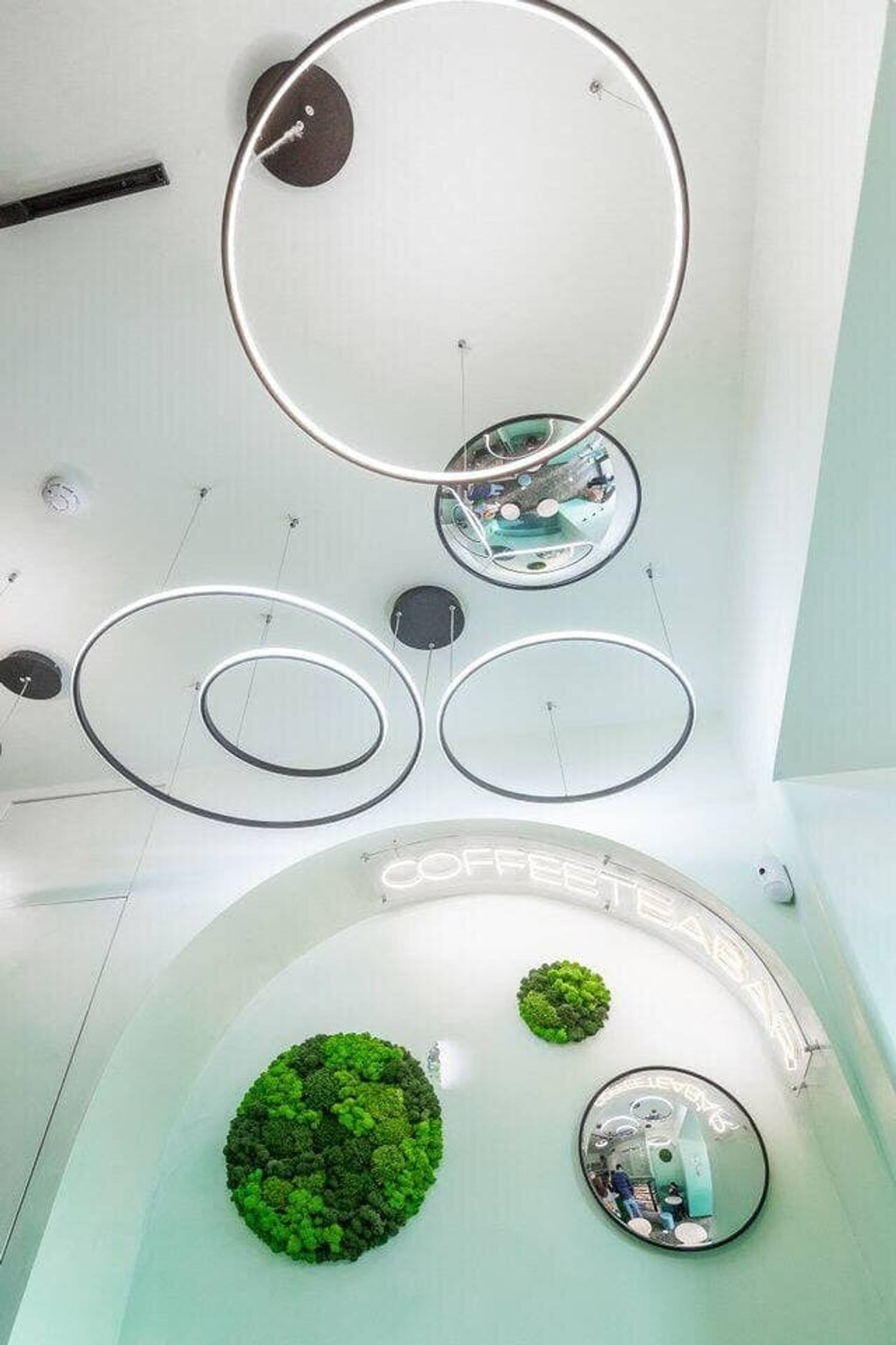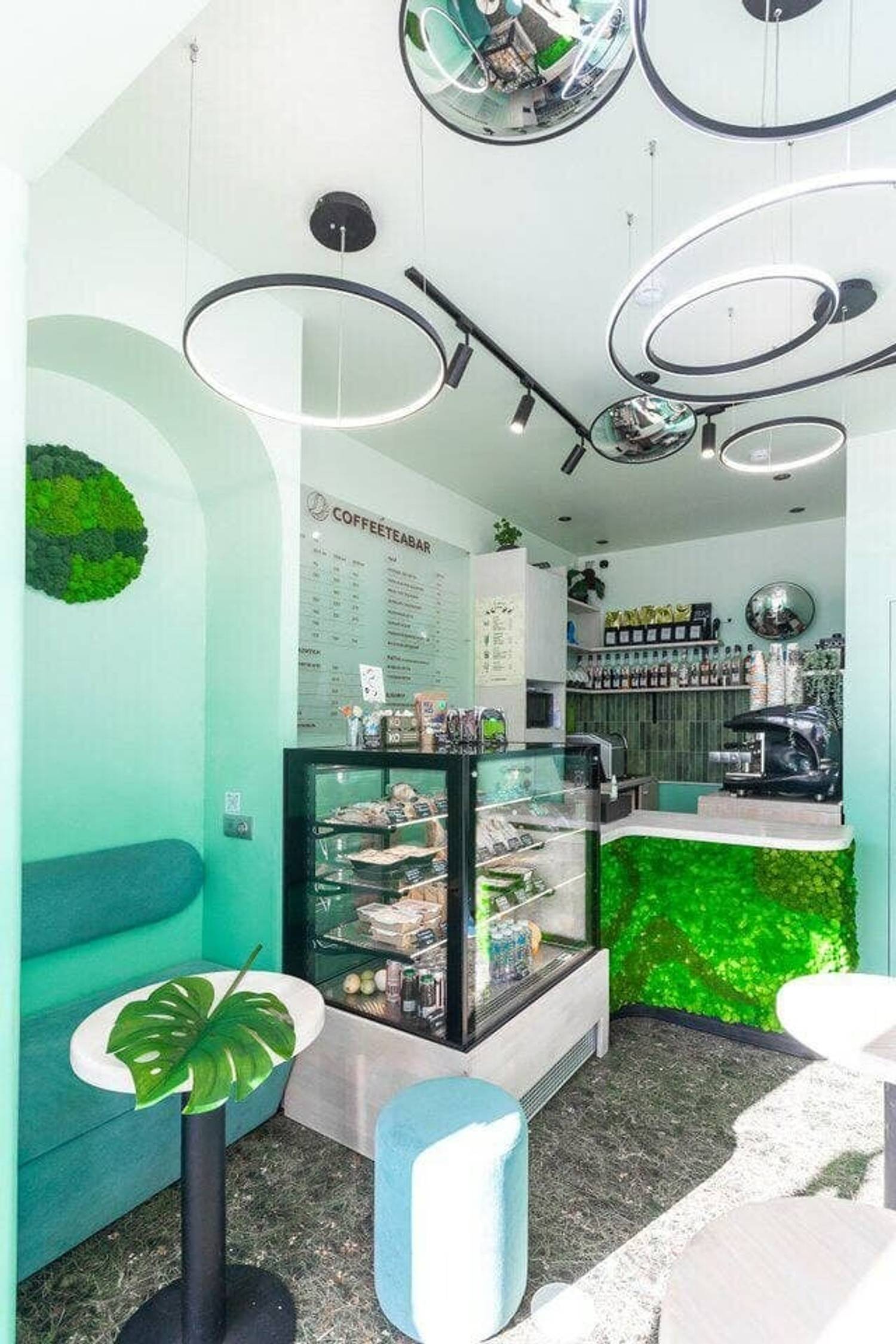 Атмосфера. Стильный интерьер с бирюзо-белыми градиентными стенами. Здесь добавили природных элементов: стойка заказов и круглое настенное панно из искусственной травы. В фирменной палитре также поставили бирюзовые стулья, а кольцеобразные люстры завершают природный образ.