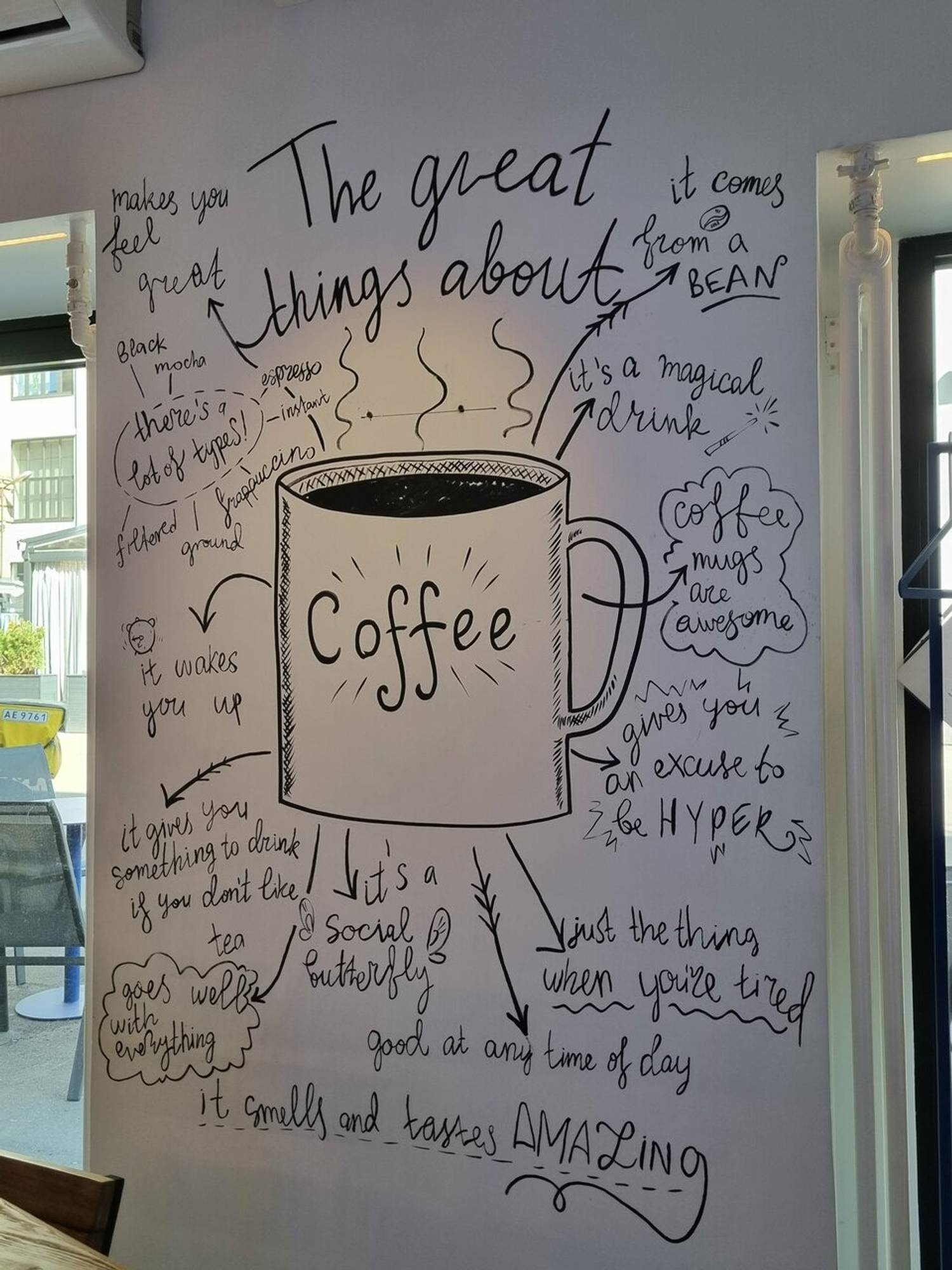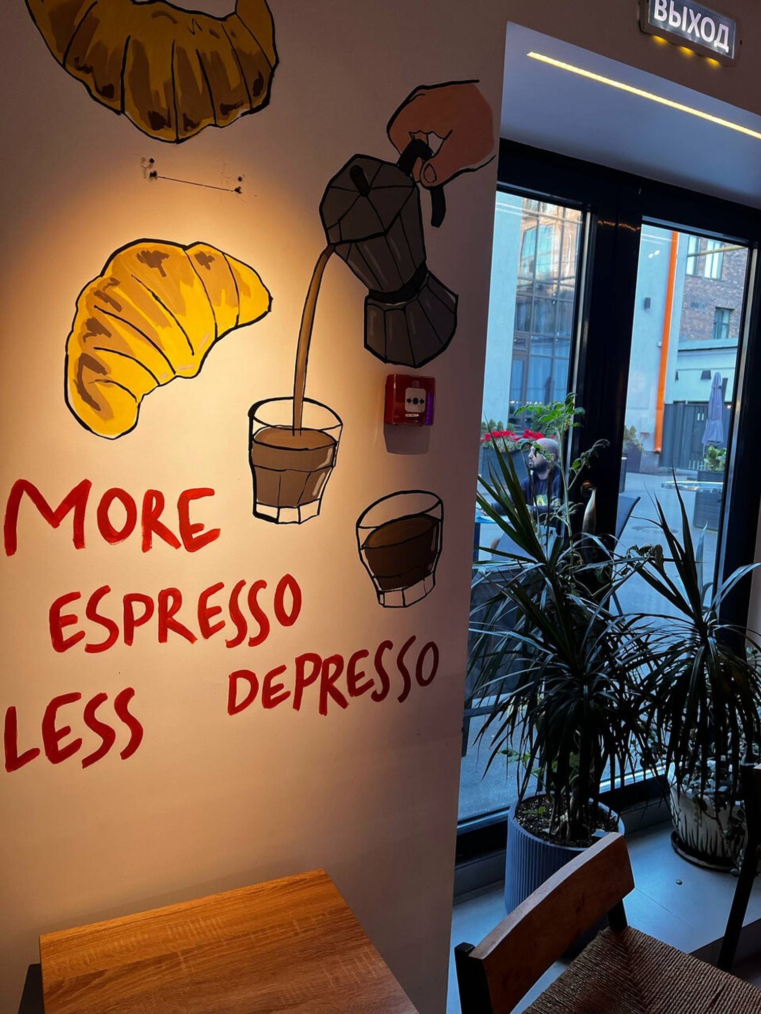 Еда и напитки. В меню — спешелти-кофе на отборных зернах, включая классические напитки, авторские чаи, свежевыжатые соки и лимонады. Готовят и сытные блюда вроде фетучини с креветками, куриный суп и паста брокколи. Также можно заказать брускетты или сэндвичи к кофе.