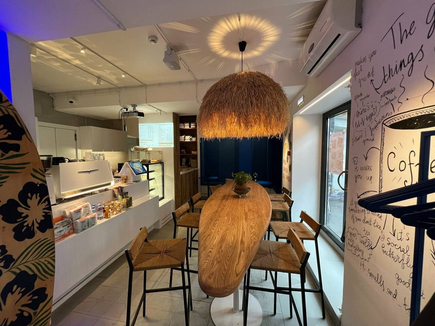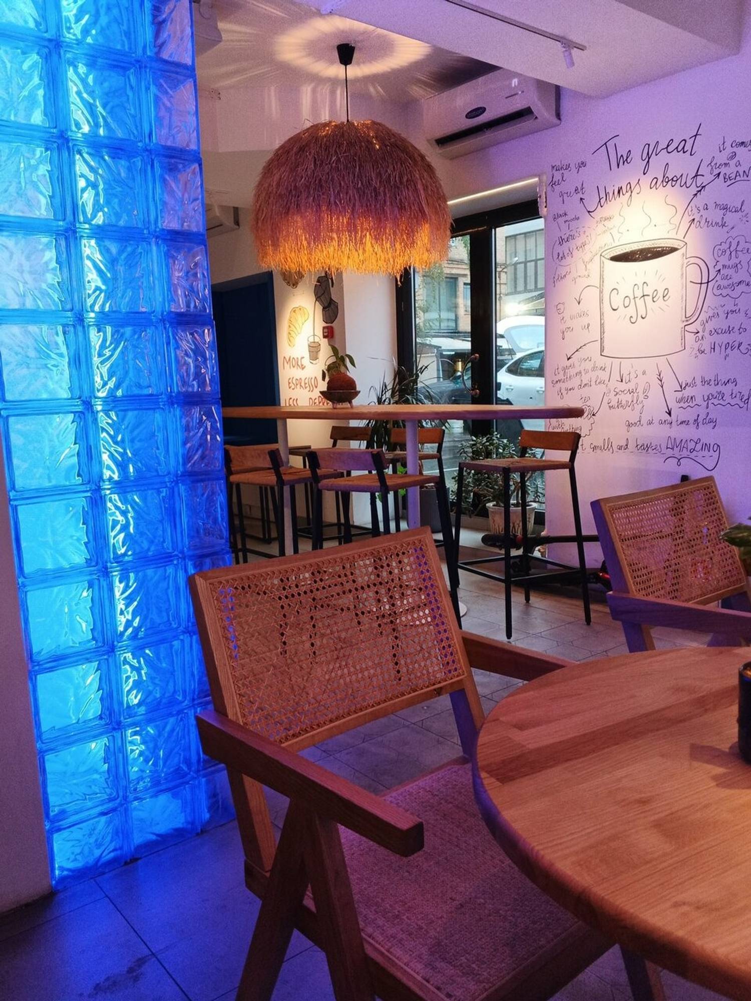 Атмосфера. Современный дизайн со светлыми стенами с синими панелями, стена с графическим рисунком чашки кофе. Необычные пушистые люстры добавляют интерьеру лёгкости, а стеклянная стойка с синей подсветкой и длинный овальный деревянный стол создают гармоничное пространство для работы и отдыха.