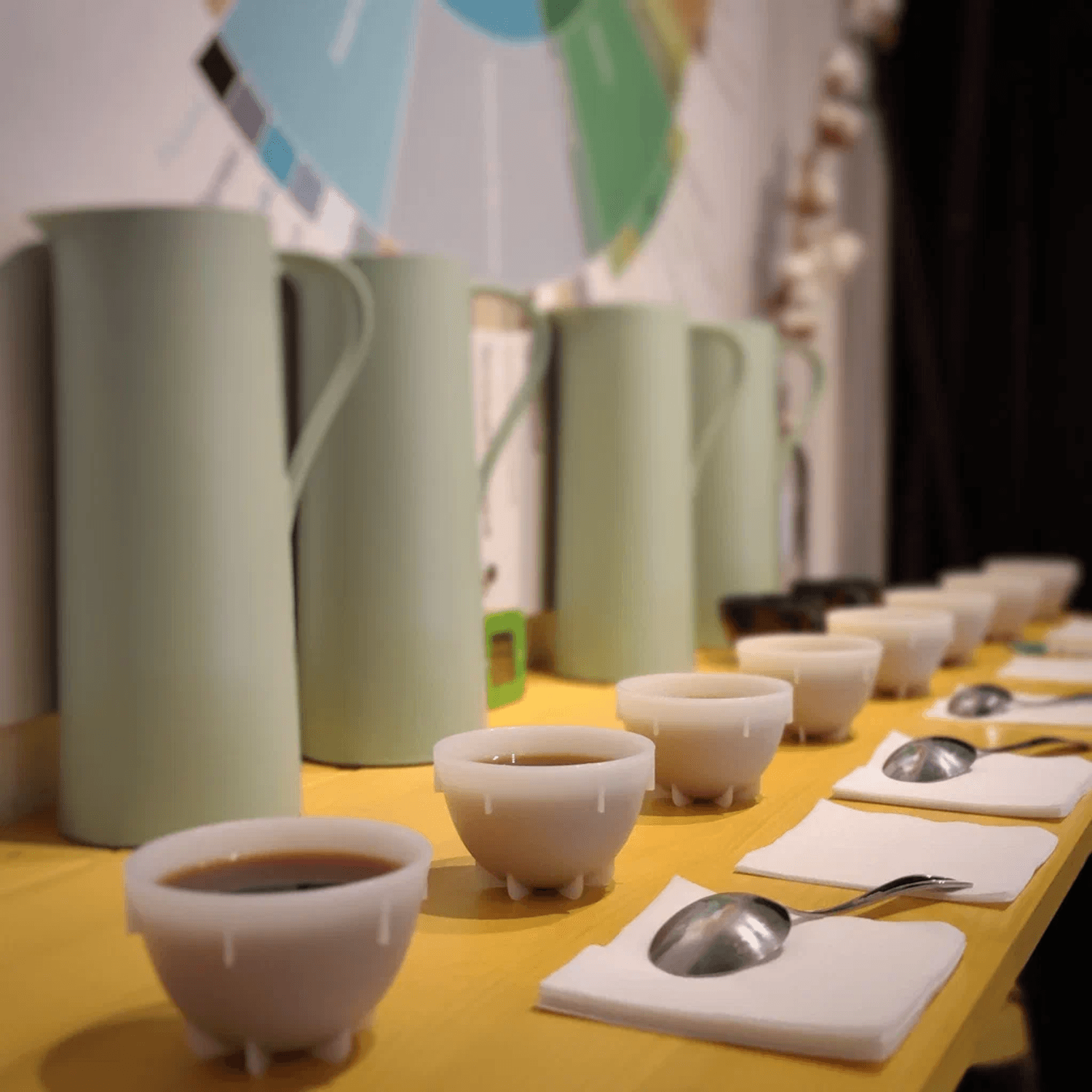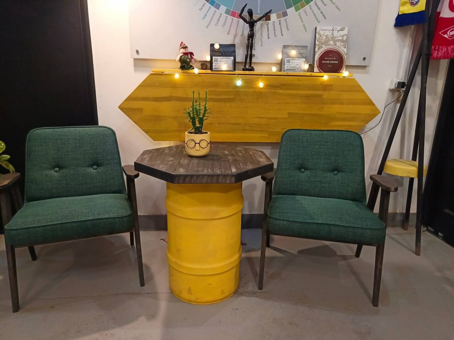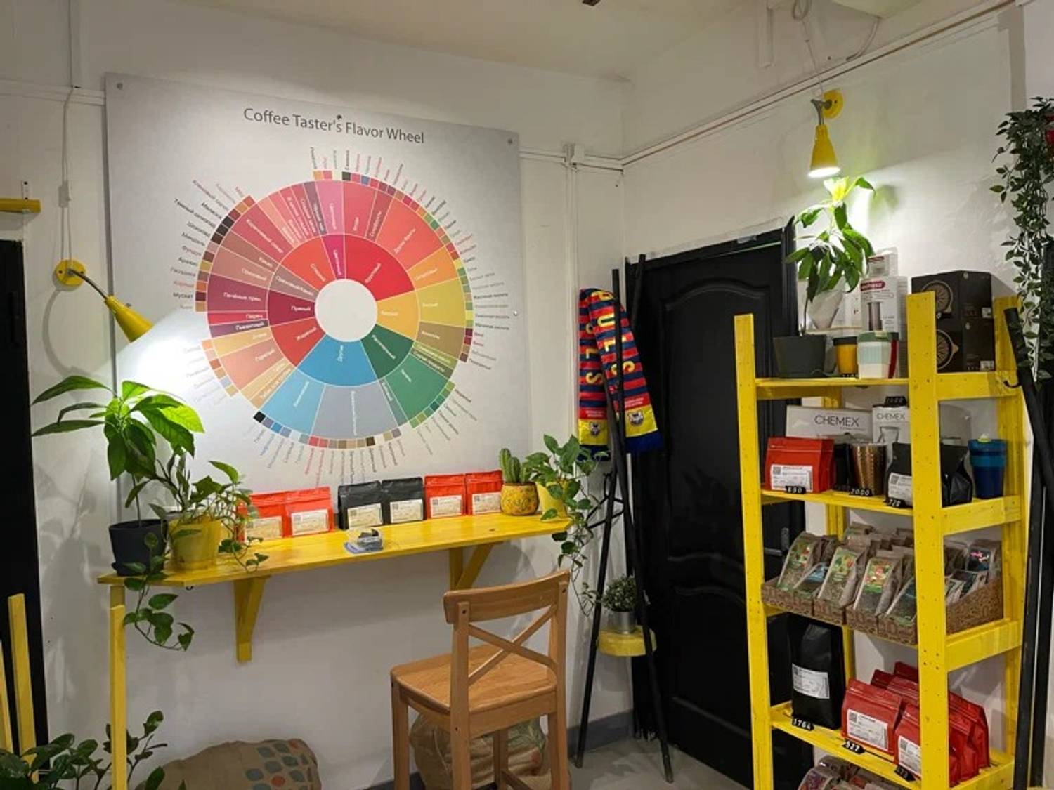 Атмосфера. Внимание привлекают насыщенные желтые полки с пачками кофе и стилизованная желтая бочка. На одной из бочек стоит стол. Пространство оживленно деревьями в кадках, а на стену повесили разноцветная карту кофейных вкусов.