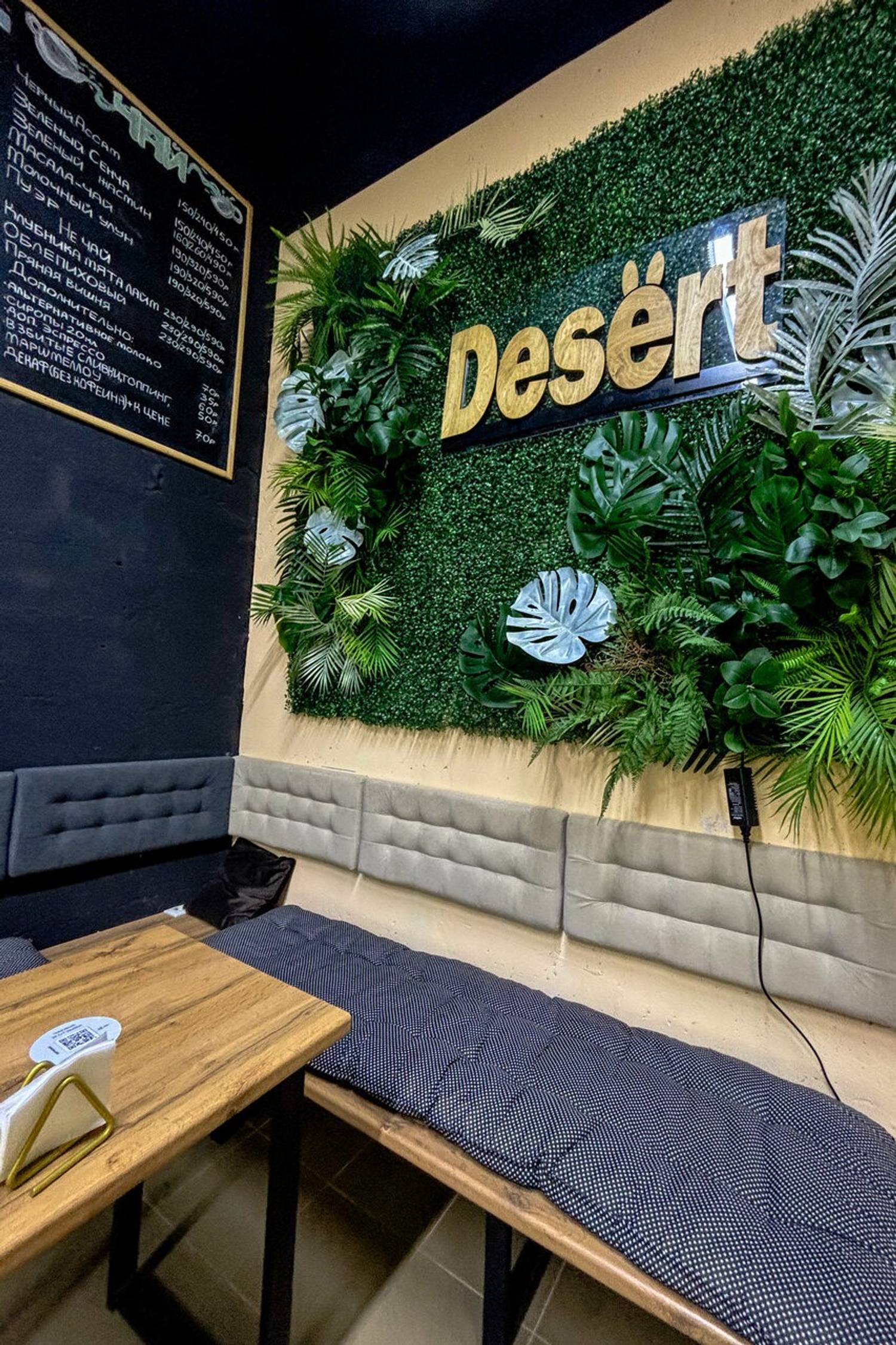 Атмосфера. Природный интерьер обыгрывает акцентная стена, украшенной искусственной травой и листьями, а также деревянная стойка и серые стулья.