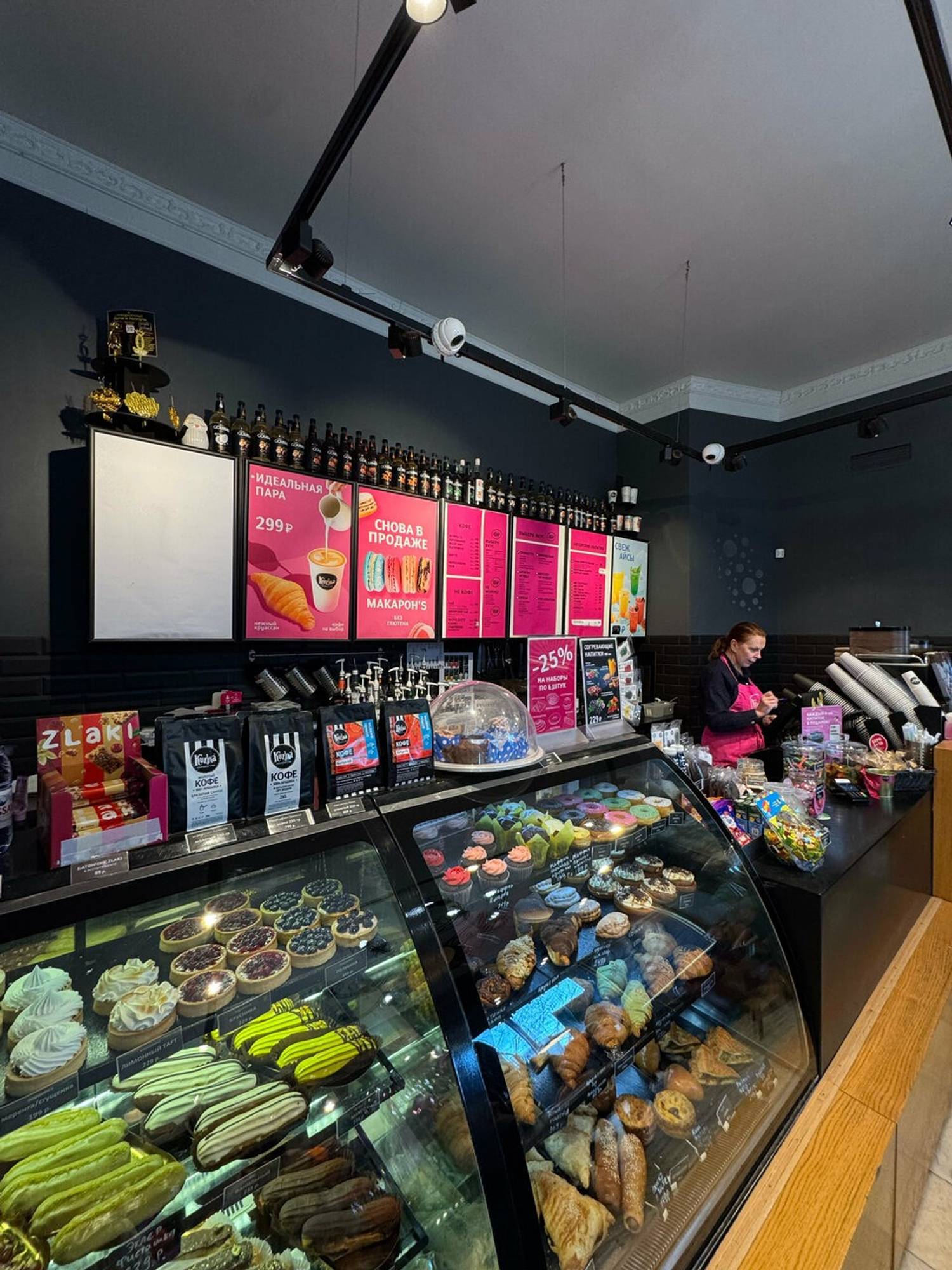 Еда и напитки. В меню — классические и авторские кофейные напитки, чай. Также есть выпечка: булочка «Синнамен» с корицей и кремом, эклеры, сметанный, морковный и с бельгийский шоколадом торты. Из сытных вариантов есть сэндвич-роллы с ветчиной или курицей.
