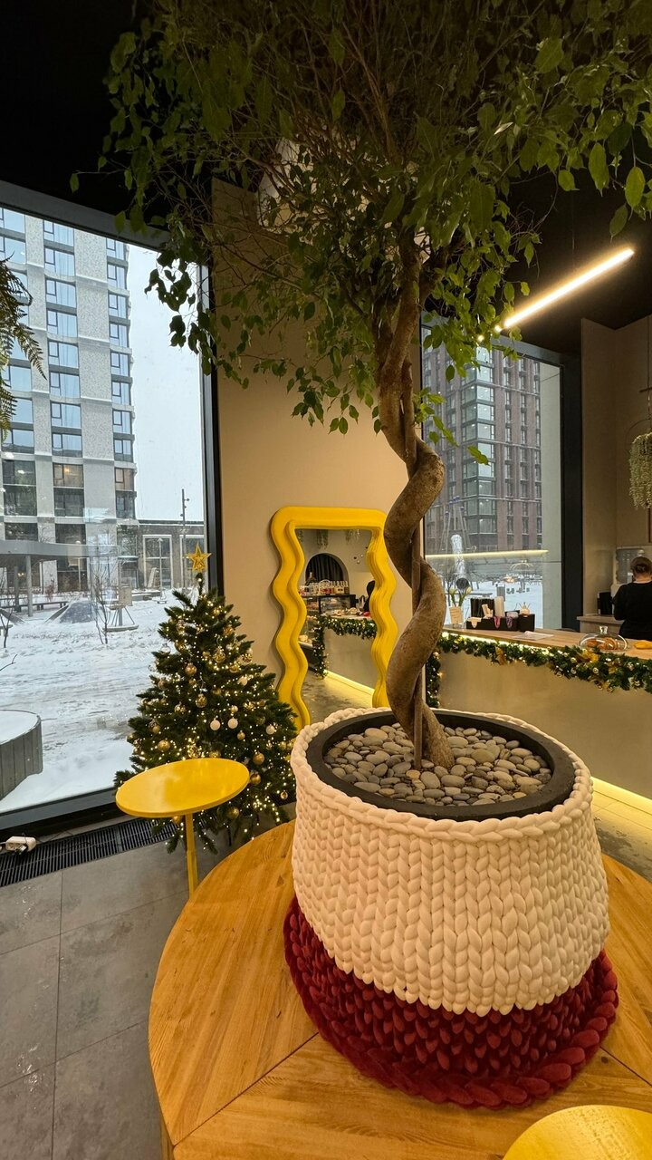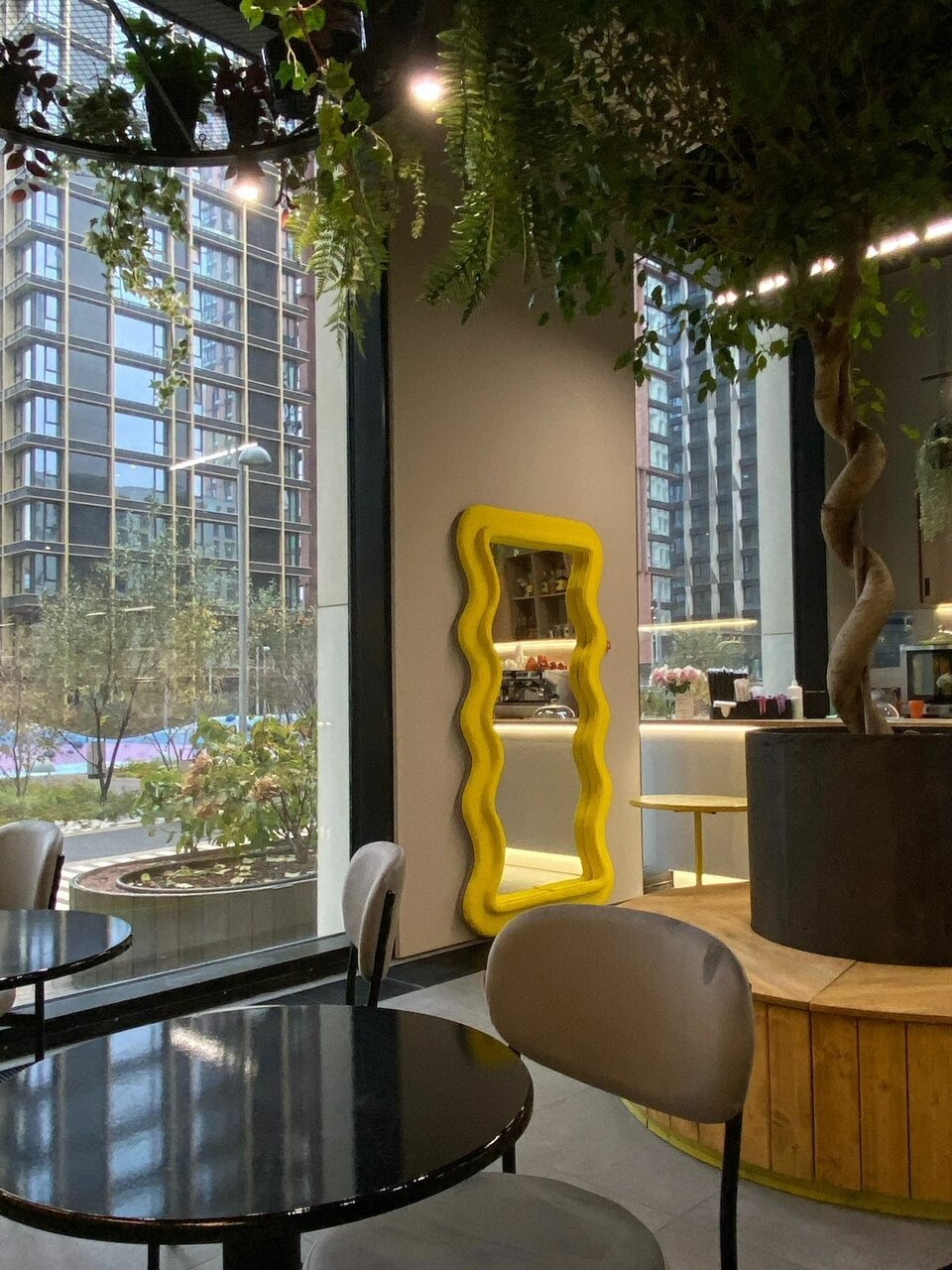 Атмосфера. Эстетичный интерьер с яркими акцентами: черными люстрами, украшенными зелеными растениями, желтая стена с неоновой надписью «Кого порадуем сегодня?». Можно сделать фото с букетом и кофе в большом зеркале в волнистой желтой раме. Также интерьер дополняет дерево в центре зала, окруженное круглой деревянной скамьей.