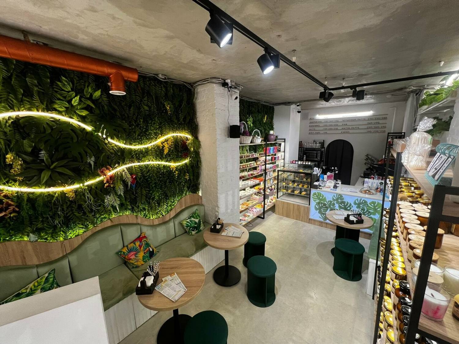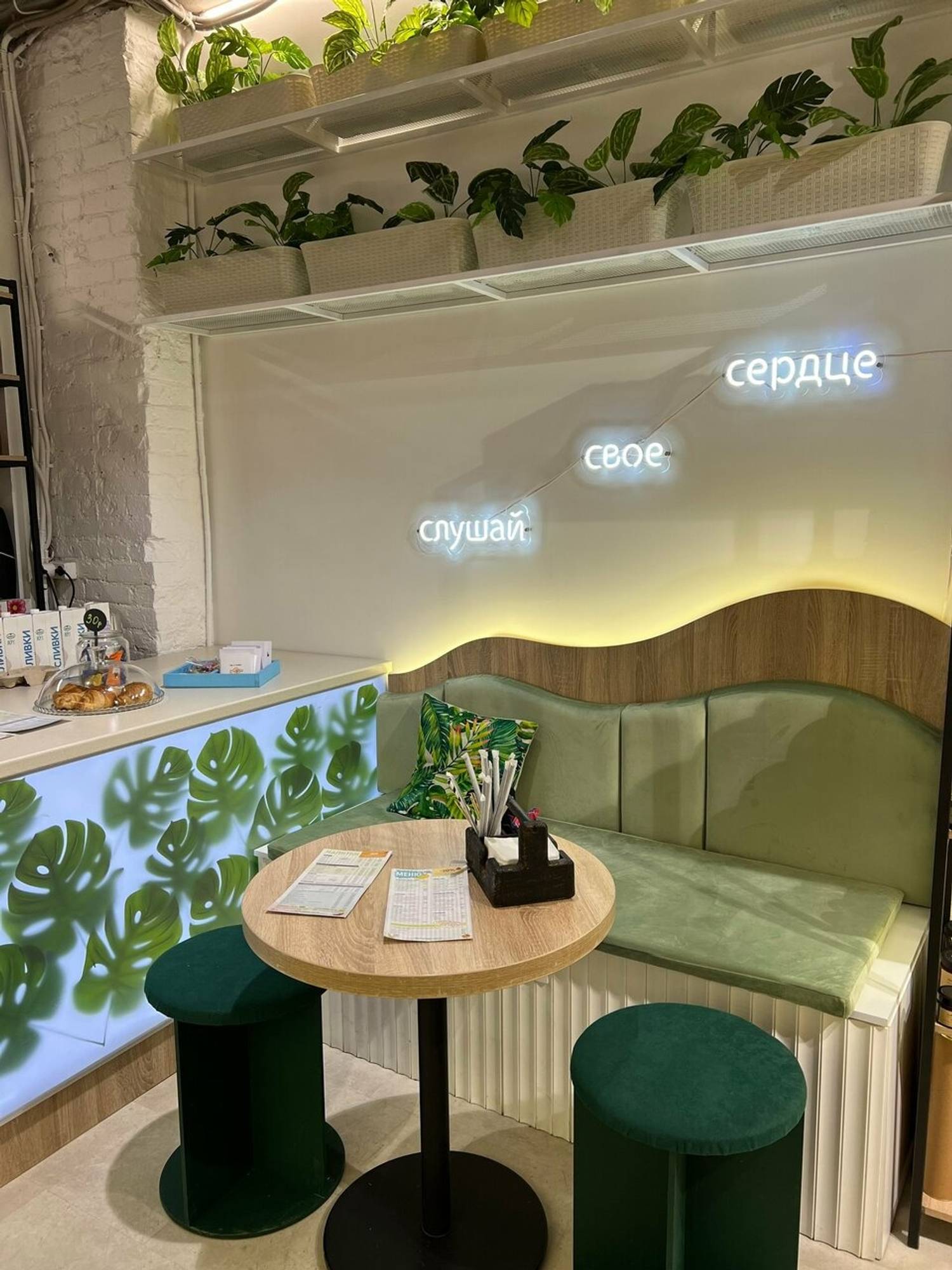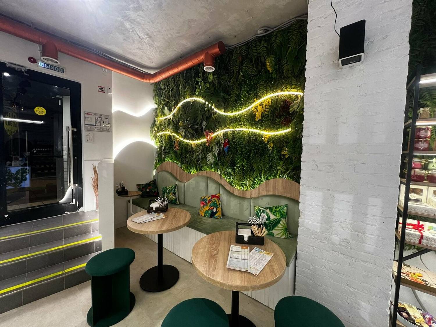 Атмосфера. Главный акцент интерьера — живая зеленая стена с пышными растениями, подсвеченная плавной волнообразной подсветкой. Круглые пуфики изумрудного цвета, полки со свечами и картина с ботаническими мотивами добавляют пространству  художественного шарма. Даже на белой стойке заказа можно заметить изящные рисунки листьев, которые подчеркивают общую концепцию.